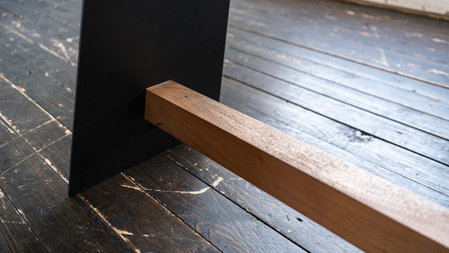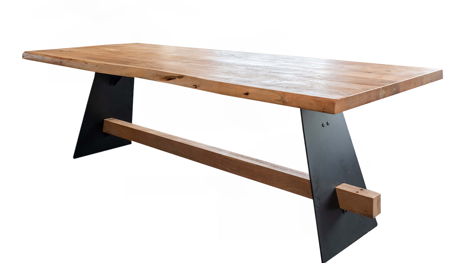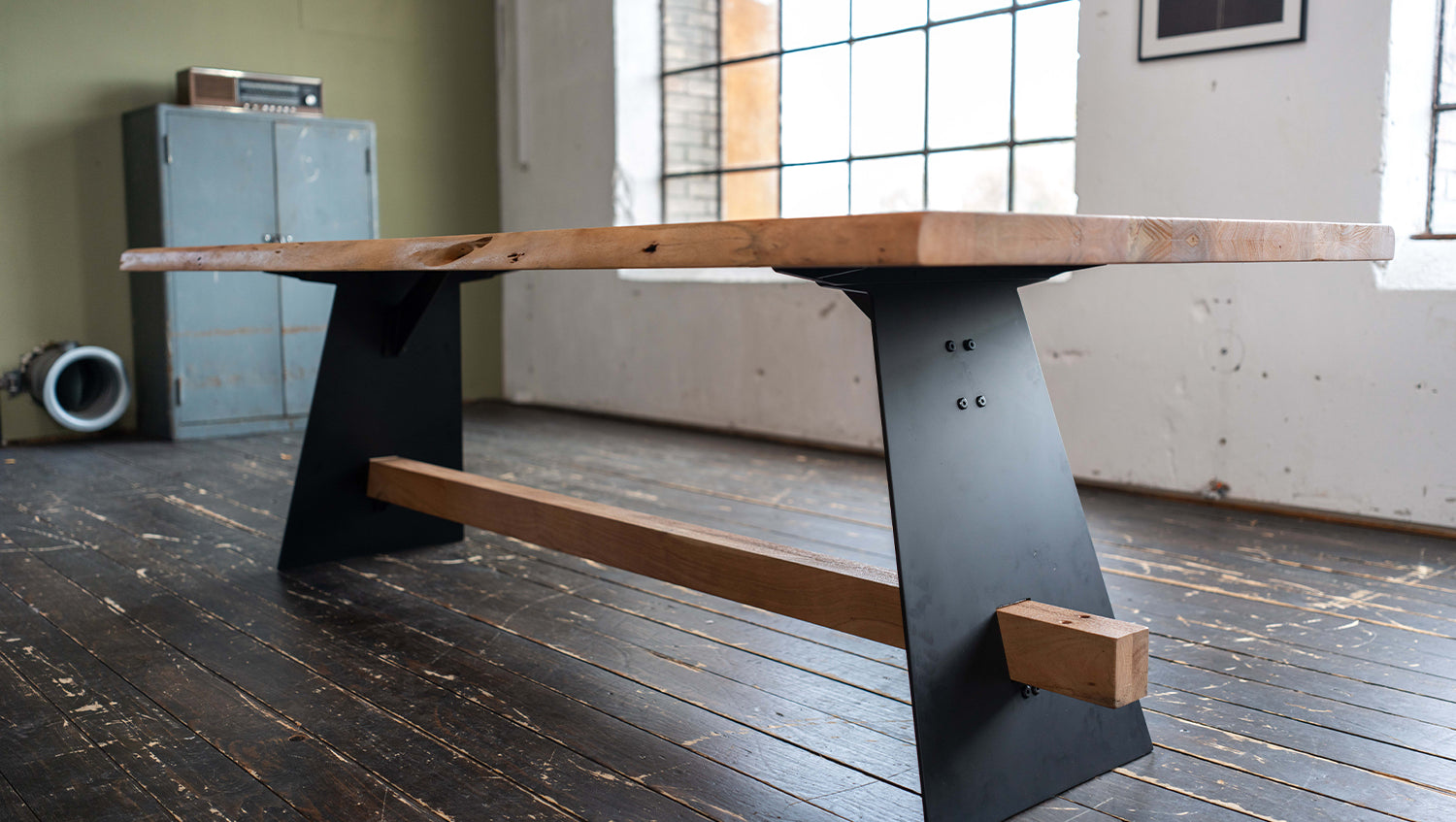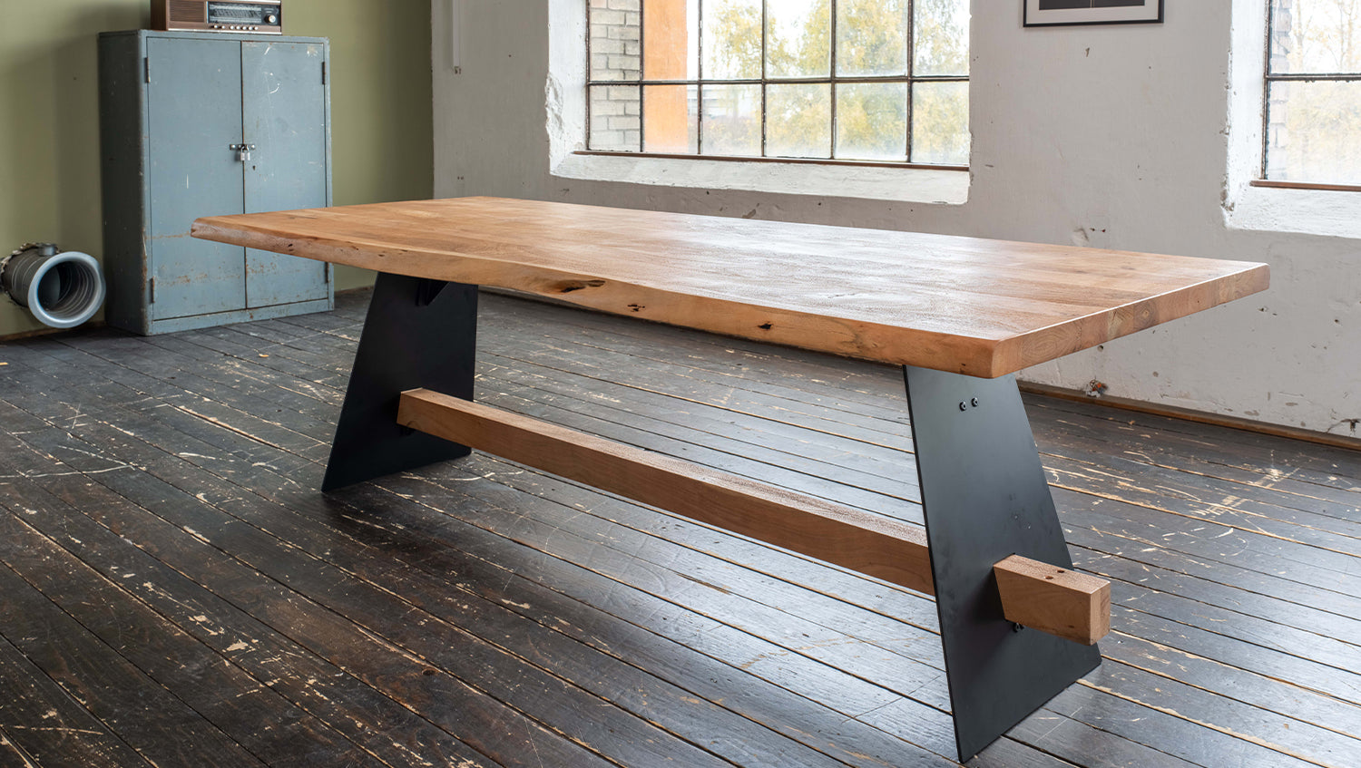 Das rustikal geschweißte, schwarz lackierte Untergestell im Industriedesign verleiht dem Tisch eine moderne, industrielle Note. Diese gelungene Kombination aus natürlichem Holz und robustem Metall macht den Tisch zu einem Design-Highlight in Ihrem Esszimmer.