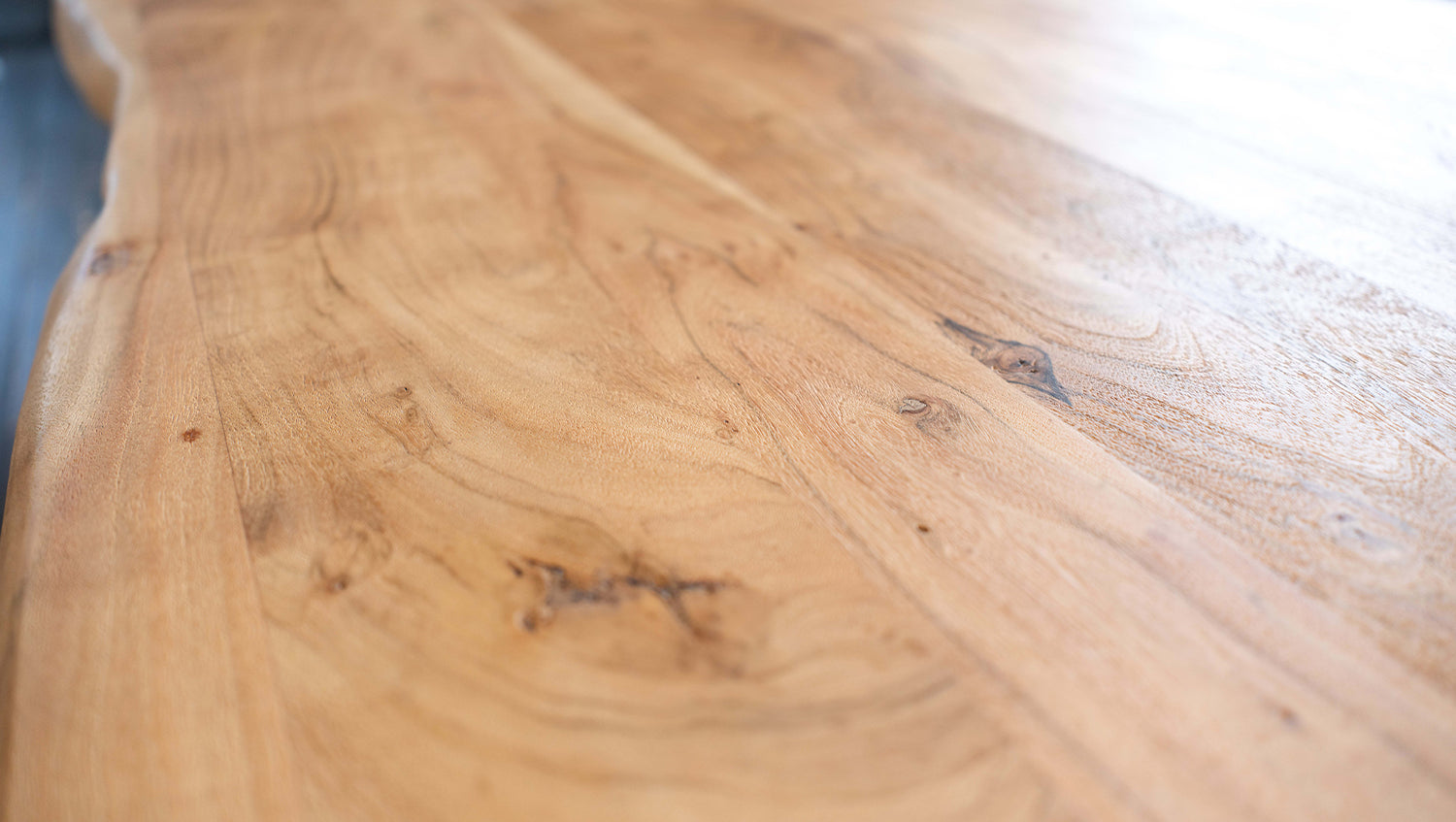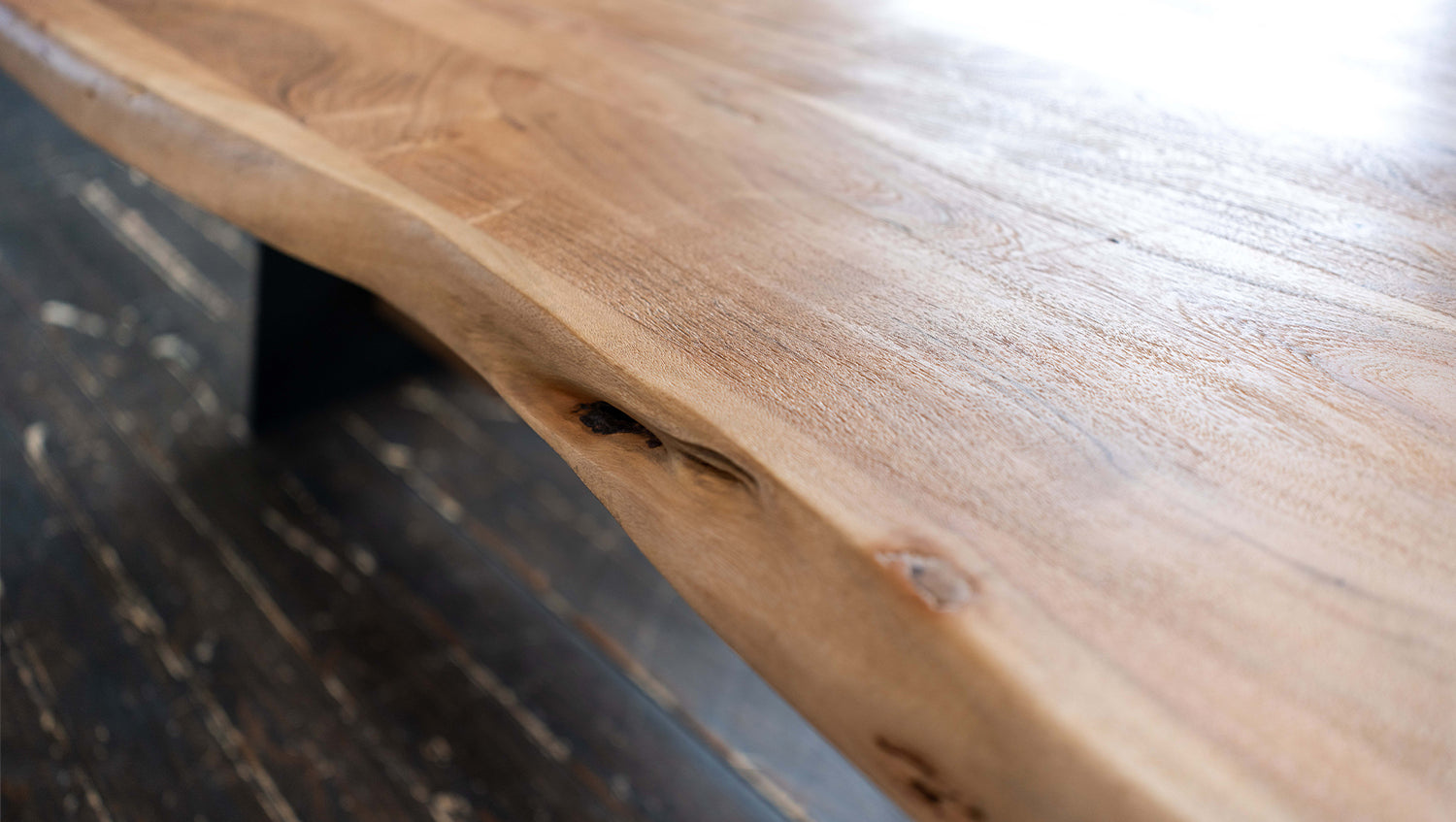 Der Massivholztisch ARBORIO von KAWOLA begeistert mit seinem eleganten Design und hochwertigen Materialien. Die Oberfläche der Tischplatte aus massivem Akazienholz ist gebürstet und eichefarbig, wodurch die natürliche Holzmaserung perfekt zur Geltung kommt. Sie begeistert durch die charakteristische Baumkante, die den natürlichen Wuchs des Holzes widerspiegelt. Jede Tischplatte ist ein Unikat und verleiht Ihrem Essbereich eine warme, einladende Atmosphäre.
