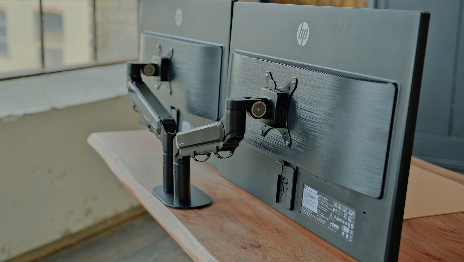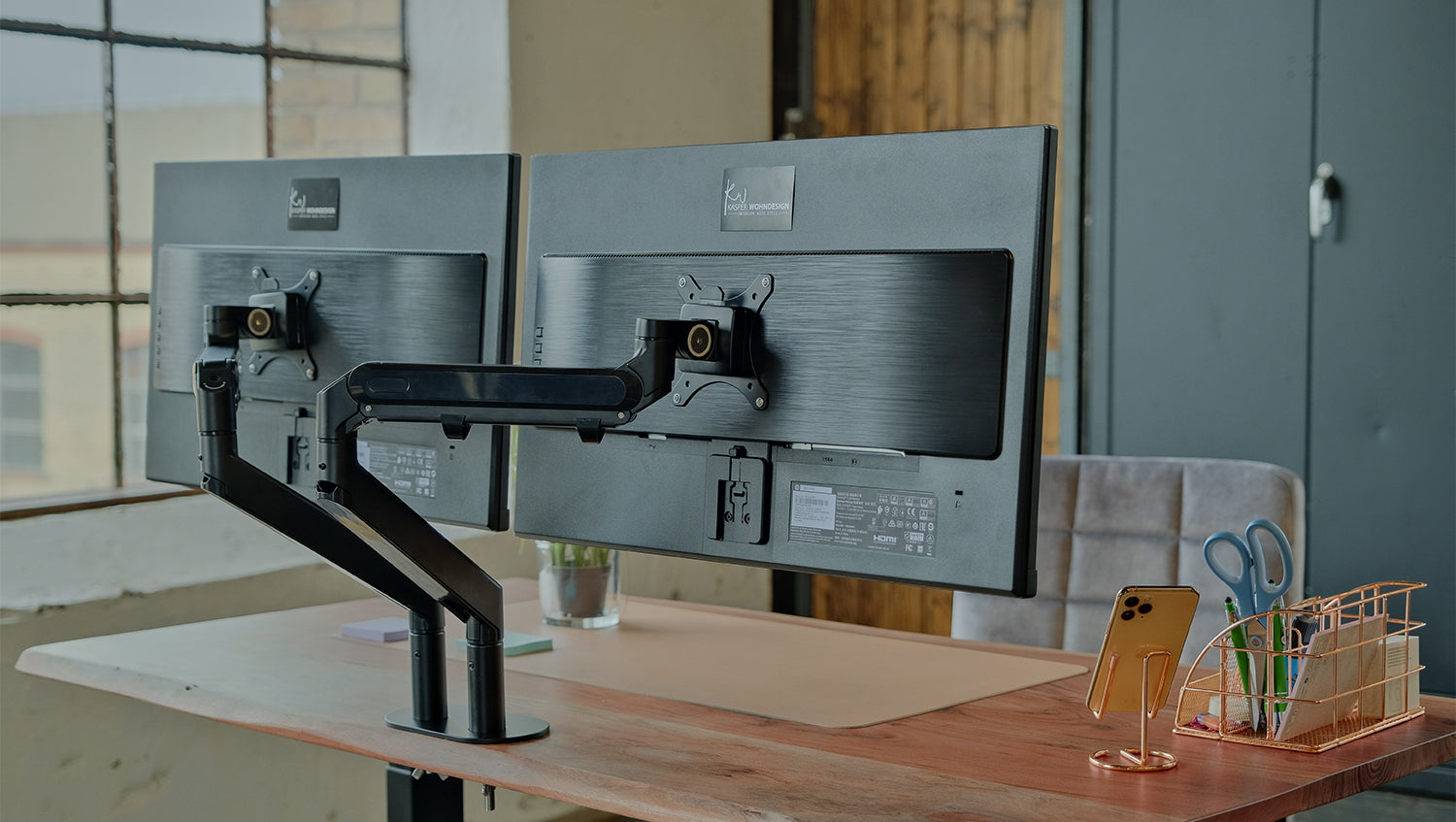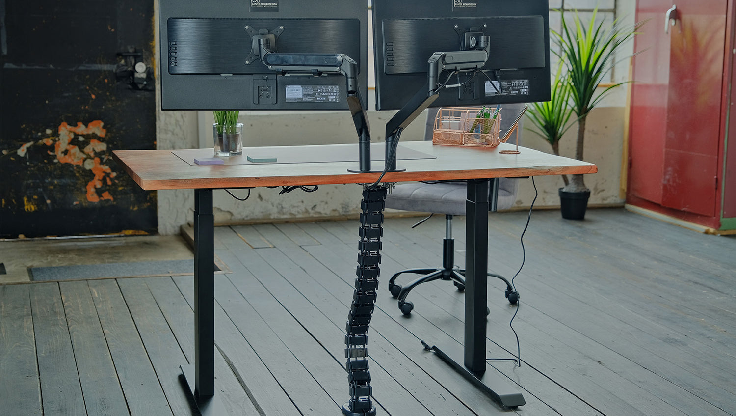 KAWOLA Schreibtisch LORA mit Monitorhalterung elektrisch höhenverstellbar mit Baumkante Nussbaumfarben massiv