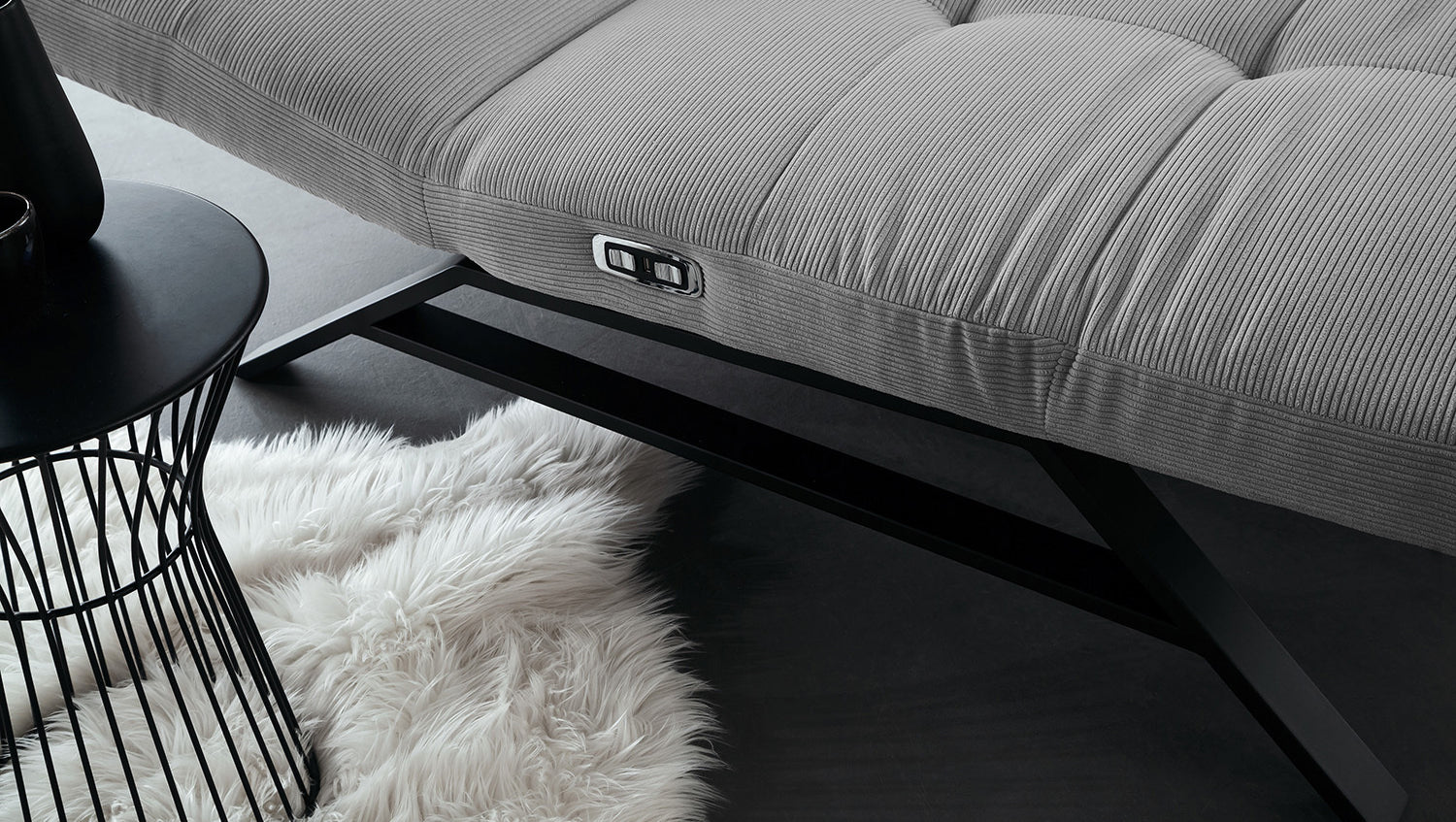 Die motorische Funktion, die durch die Knöpfe auf der rechten Seite bedient werden kann, bietet eine stufenlos einstellbare Liegeposition. Bei komplett ausgefahrener Funktion gelangen Sie in die Herz-Waage Position, bei der sich das Herz und die Füße auf derselben Position befinden. Diese Position bewirkt optimale Durchblutung, entlastet die Beine und eignet sich daher perfekt zum Entspannen. Die weiche Polsterung sorgen für höchsten Sitz- und Liegekomfort.