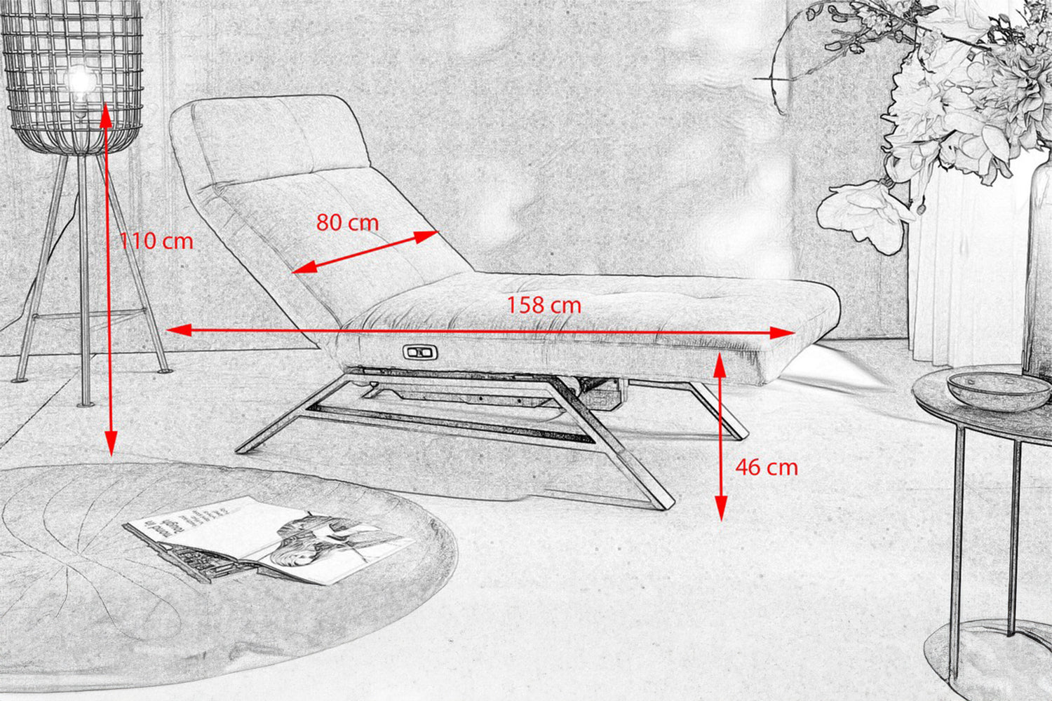 Die KAWOLA Liege AMERIVA ist eine wunderbare Kombination aus Design und Funktion. Die Metallkufen in schwarz matt bilden den Kontrast zum angesagten Velvet-Stoff. Allerdings ist die Relaxliege nicht nur rein optisch ein richtiges Highlight - auch die Funktionen betreffend bleibt hier kein Wunsch offen. Die motorische Funktion, die durch die Knöpfe auf der rechten Seite bedient werden kann, bietet eine stufenlos einstellbare Liegeposition. Zusätzlich verfügt die Liege über einen USB-Anschluss. Die Einsetzbarkeit dieses Möbelstücks ist so vielfältig wie seine Funktionen: Nicht nur im heimischen Wohnbereich, auch in der Lobby oder im Ruheraum macht die Relaxliege AMERIVA eine tolle Figur.