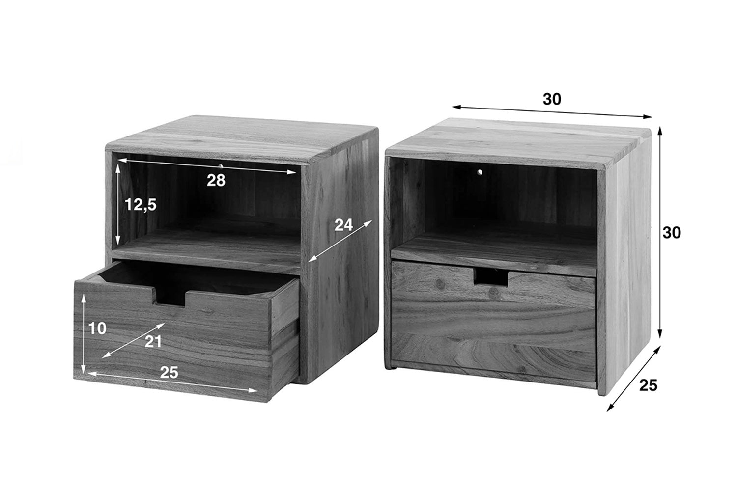 Das Nachttisch-Set FATY von KAWOLA vereint modernes Design mit natürlicher Eleganz. Der Tisch ist aus Akazienholz gefertigt und mit einem matten, transparenten Lack versehen. Er verfügt über eine Schublade und ein offenes Fach. Es wird mit zwei Schrauben an der Wand befestigt und wirkt dadurch schwebend. Das Set besteht aus zwei Tischen, von denen jeder 30 cm breit, 25 cm tief und 30 cm hoch ist. Das Nachttisch-Set FATY ist nicht nur funktional, sondern auch ein echter Blickfang – perfekt für moderne, minimalistische oder rustikale Einrichtungen. Setzen Sie stilvolle Akzente mit diesen platzsparenden Nachttischen aus Akazienholz!