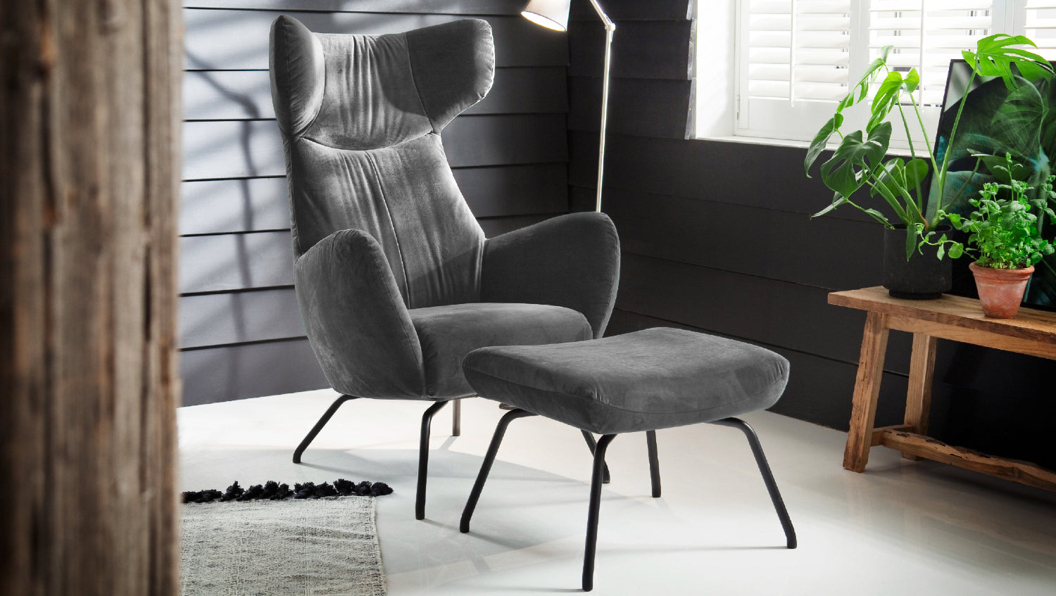 KAWOLA Sessel LOTTE Ohrensessel velvet stone mit Hocker