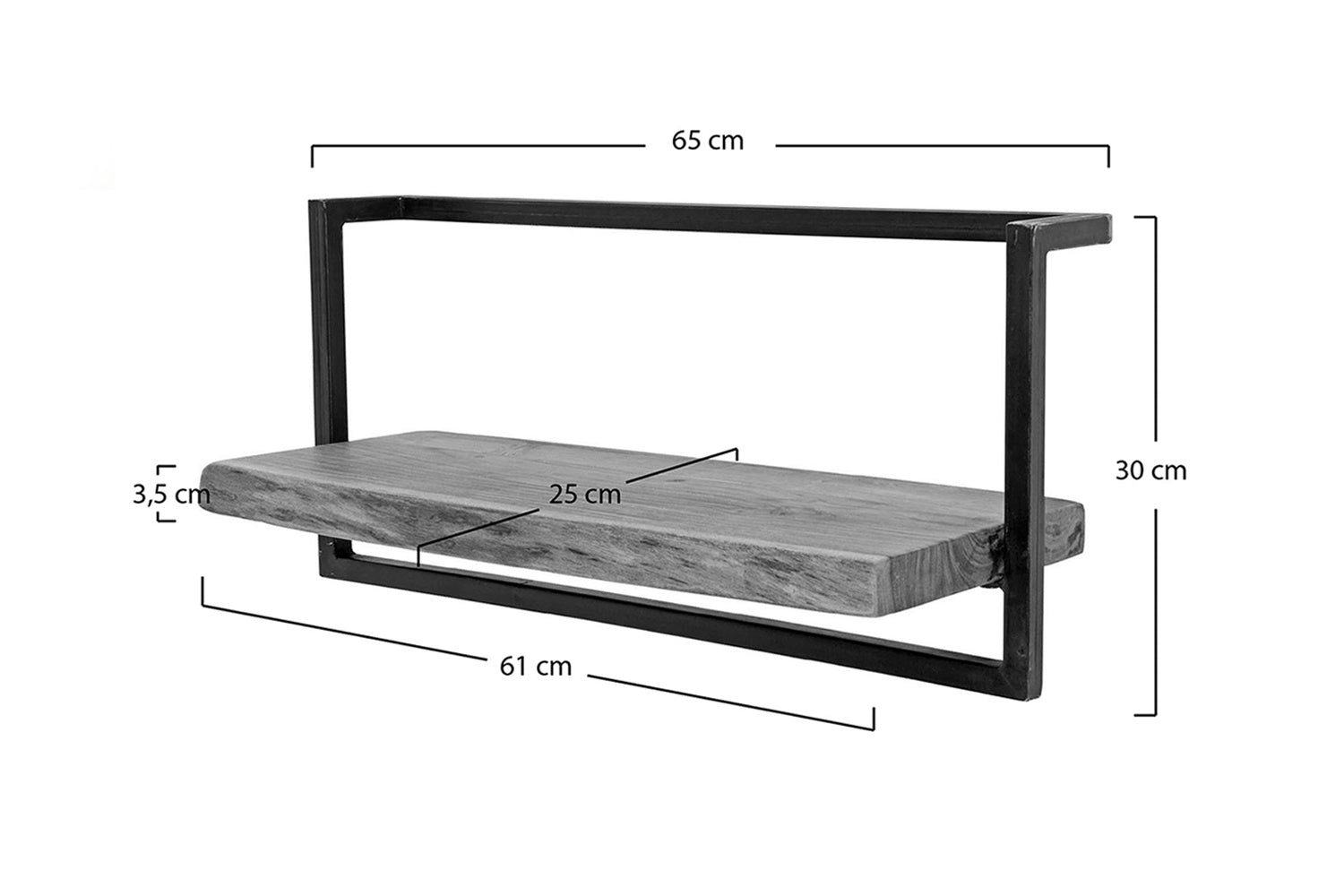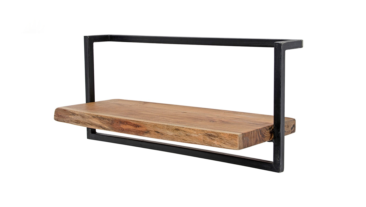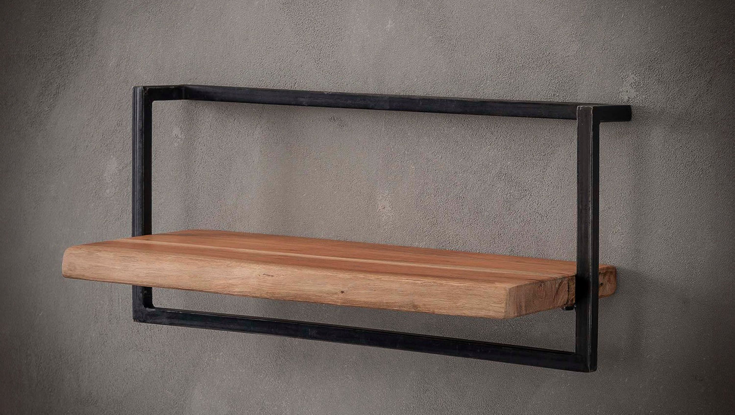 Das KAWOLA Wandregal ERGEA in 65 cm Größe ist eine perfekte Verbindung aus natürlicher Ästhetik und industriellem Design. Es besteht aus einem 61 cm breiten Regal aus massivem Akazienholz, dessen Enden eine robuste, geschliffene Baumstammform aufweisen, die für eine authentische und einzigartige Optik sorgt. Die Holzdiele wird von einem stabilen Vintage-Stahlrahmen umschlossen, der dem Regal seinen unverwechselbaren Charakter verleiht. Die Montage ist dank zweier Befestigungsösen einfach und sicher an der Wand.