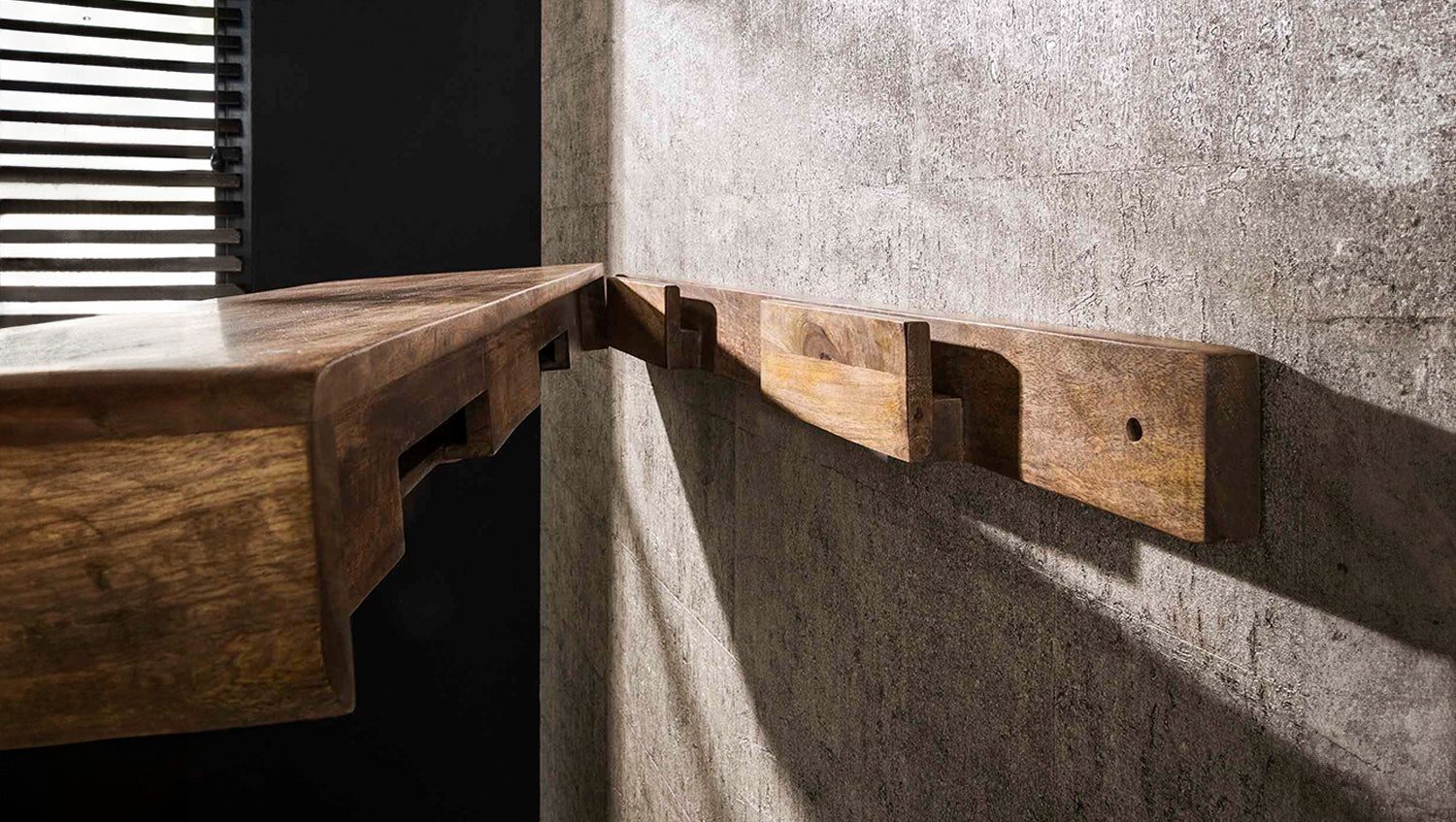 Das KAWOLA SWEAK 170 cm Wandregal ist aus hochwertigem Mangoholz mit sandfarbenem Finish gefertigt. Das Regal wird mit einer Latte und zwei Holzklötzen an der Wand befestigt, was eine feste und stabile Anbringung gewährleistet. Durch diese Konstruktion hängt das Regal schön flach an der Wand.