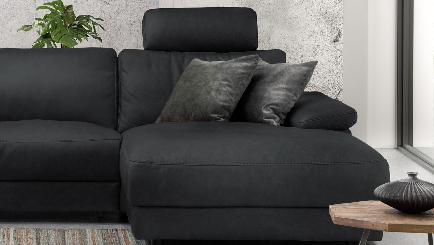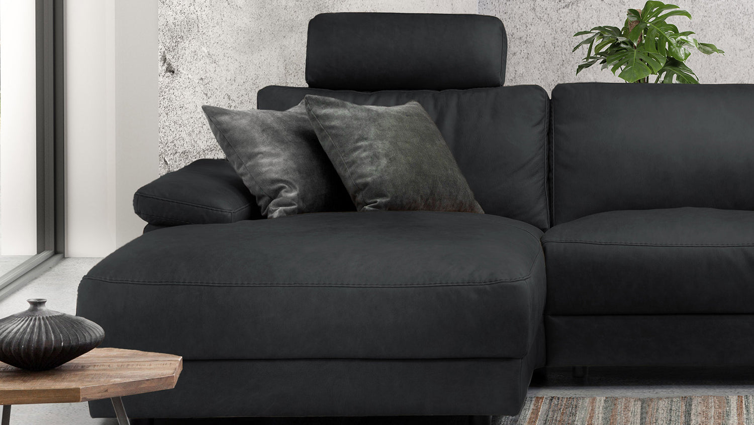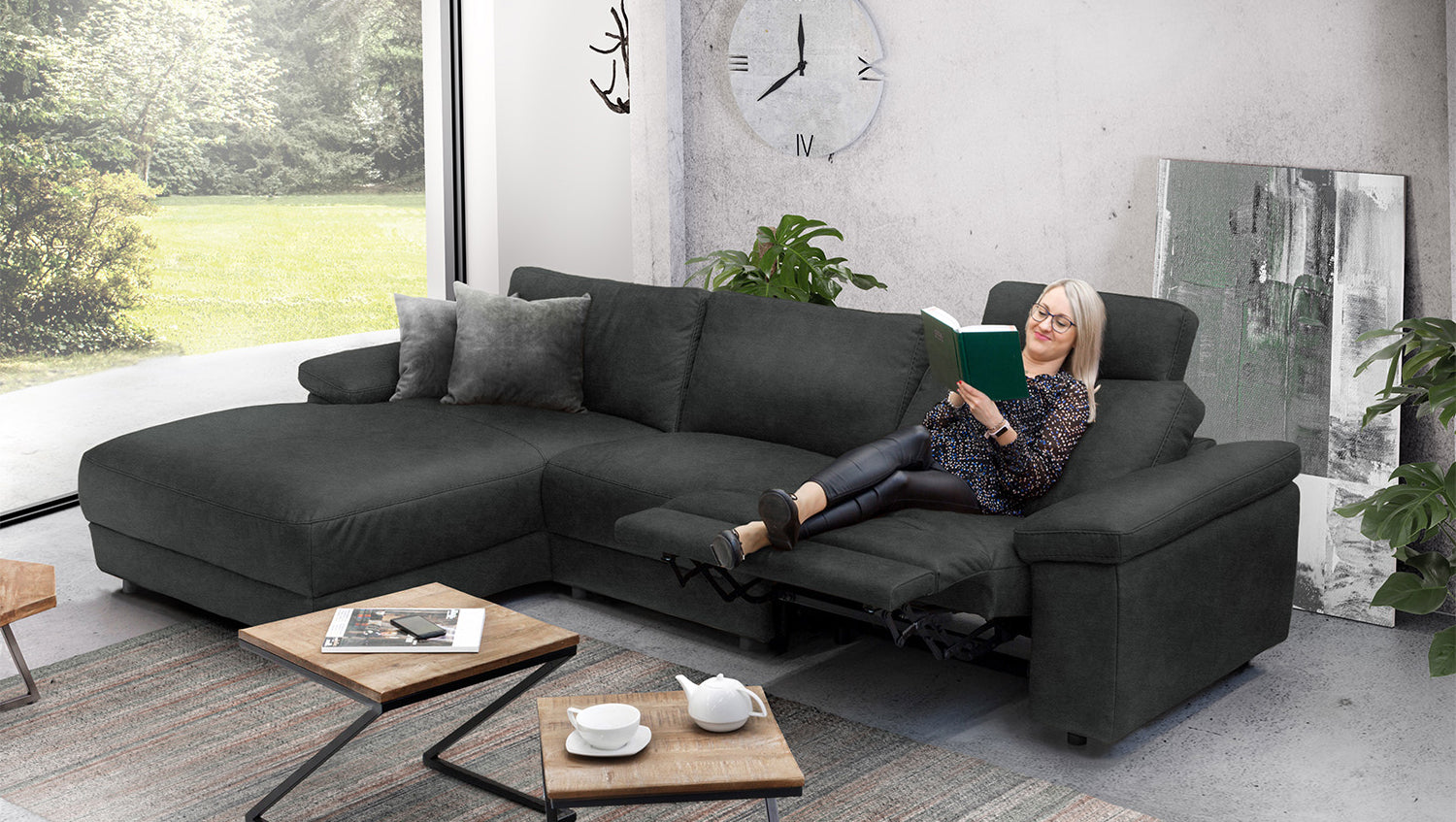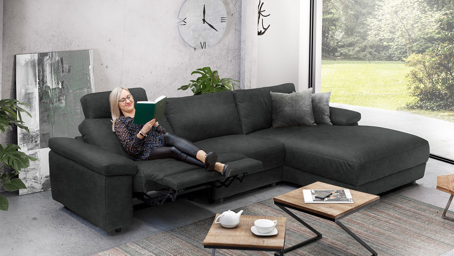 KAWOLA Sofa LOLA Ecksofa XL schwarz mit motorischer Relaxfunktion versch. Bezüge