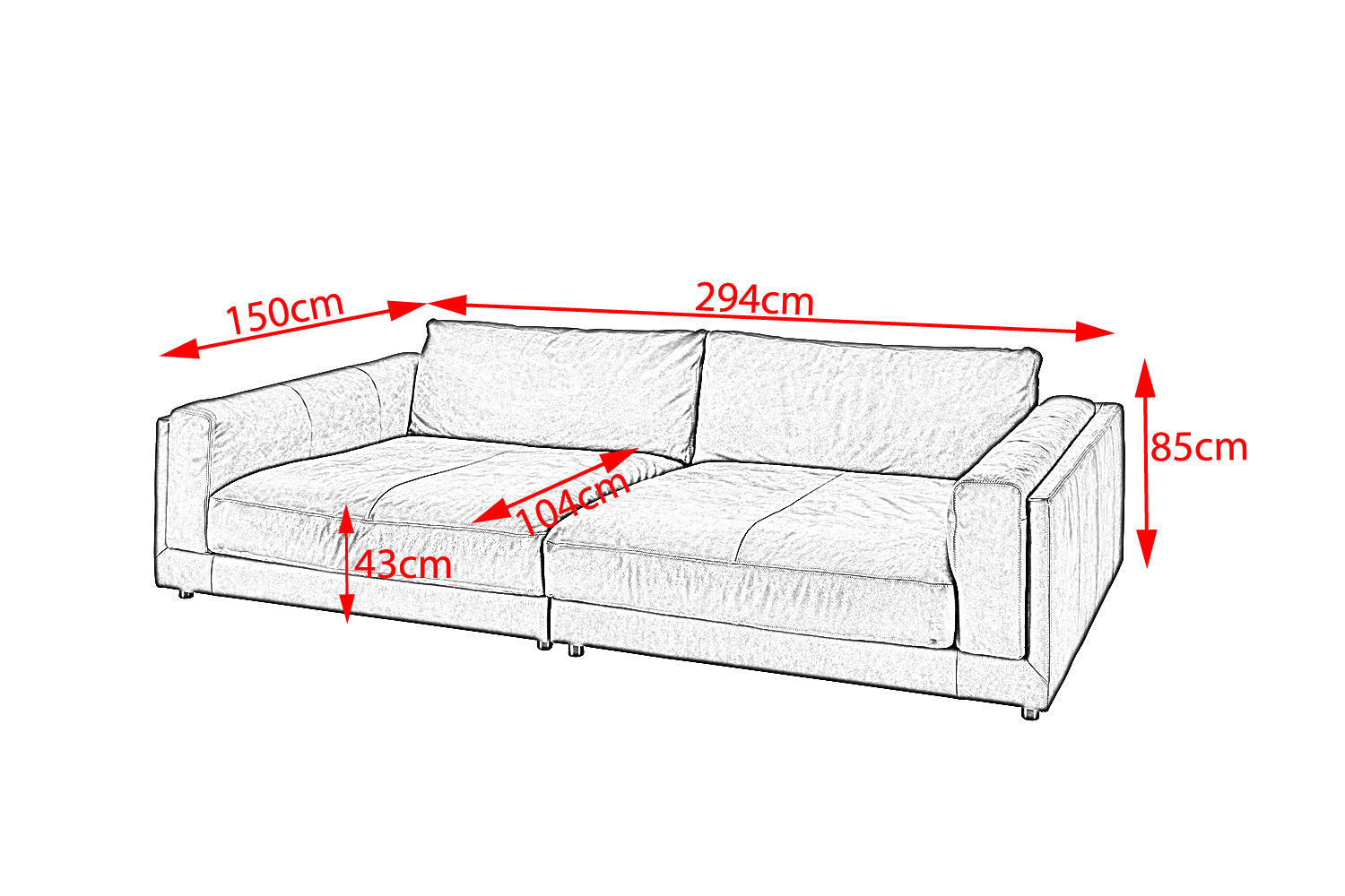 Genießen Sie den mittelfesten Sitzkomfort, der perfekt für entspannte Abende zu dritt ist. Mit einer beeindruckenden Breite von 294 cm und einer großzügigen Sitztiefe von 104 cm bietet das RAINA genügend Platz für alle.