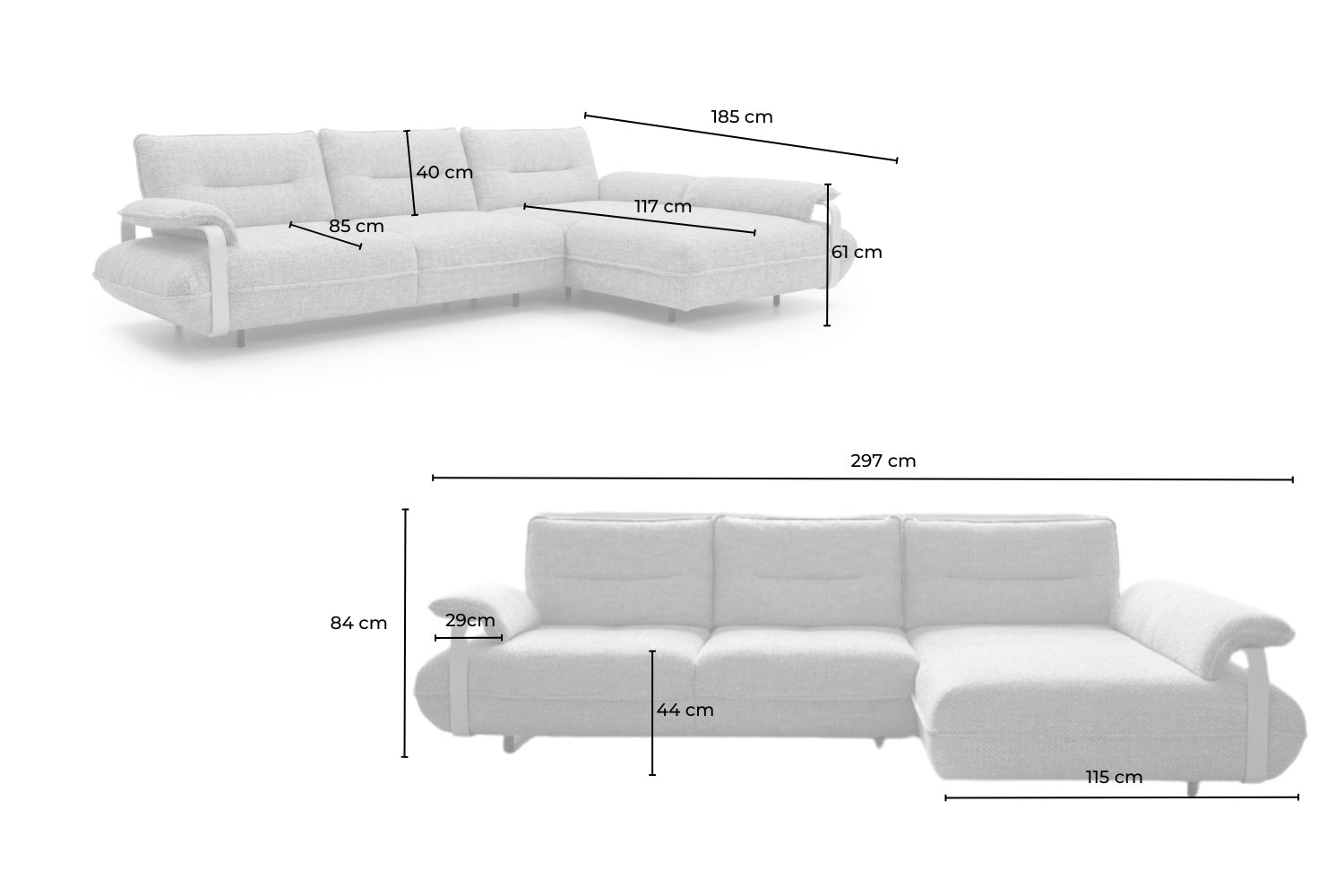 Das Ecksofa ANISSA von KAWOLA verbindet modernes Design mit durchdachtem Sitzkomfort und einer hochwertigen Verarbeitung. Mit seiner markanten Formensprache und den eleganten Metallspangen an den Armlehnen wird ANISSA schnell zum stilvollen Mittelpunkt Ihres Wohnbereichs. Der Bezug aus Chenille überzeugt nicht nur mit seiner angenehmen Haptik und wohnlichen Optik, sondern auch mit einem sehr geringen Pillingverhalten. Dadurch bleibt die Oberfläche auch bei regelmäßiger Nutzung lange schön und gepflegt. Ein besonderes Komfort-Highlight ist die manuelle Rückentiefenverstellung: Beide Rückenlehnen des 2-Sitzers können unabhängig voneinander in zwei unterschiedlichen Positionen fixiert werden. In der Grundstellung, bei der die Lehne weiter hinten steht, genießen Sie ein Maximum an Sitztiefe. Wird die Rückenlehne nach vorne verstellt, reduziert sich die Sitztiefe, wodurch eine aufrechtere Sitzposition entsteht. Des Weiteren kann das Armlehnenkissen des 2-Sitzers individuell auf der Metallspange positioniert werden und lässt sich so flexibel an Ihre Sitzposition anpassen. Beim Longchair ist das Armlehnenkissen jedoch langgezogen und fest integriert. Mit dem Ecksofa ANISSA holen Sie sich ein Sofa nach Hause, das Design, Komfort und Funktionalität auf besonders gelungene Weise vereint.