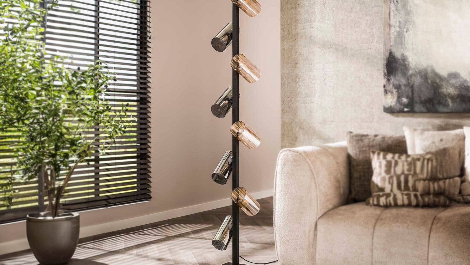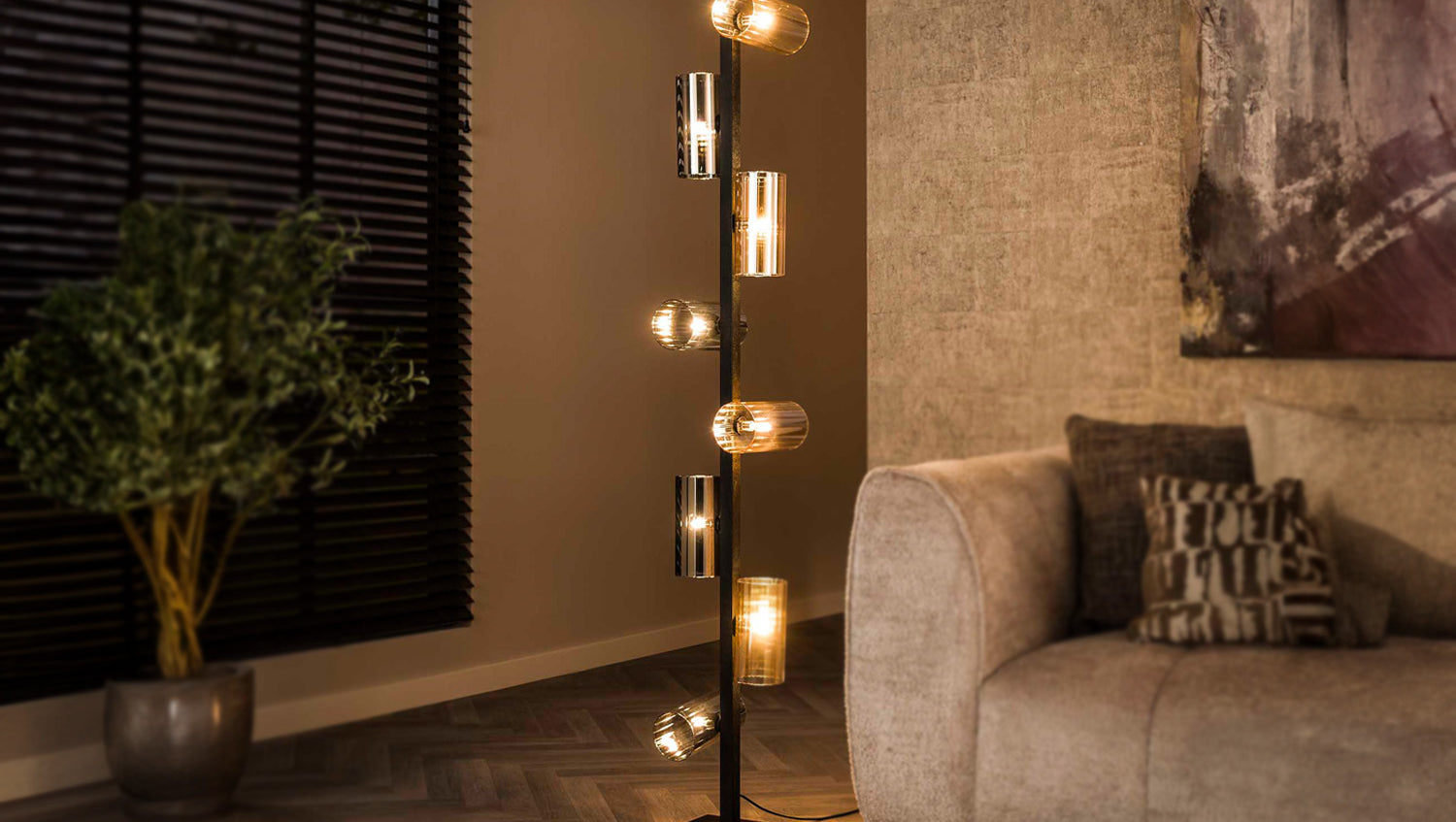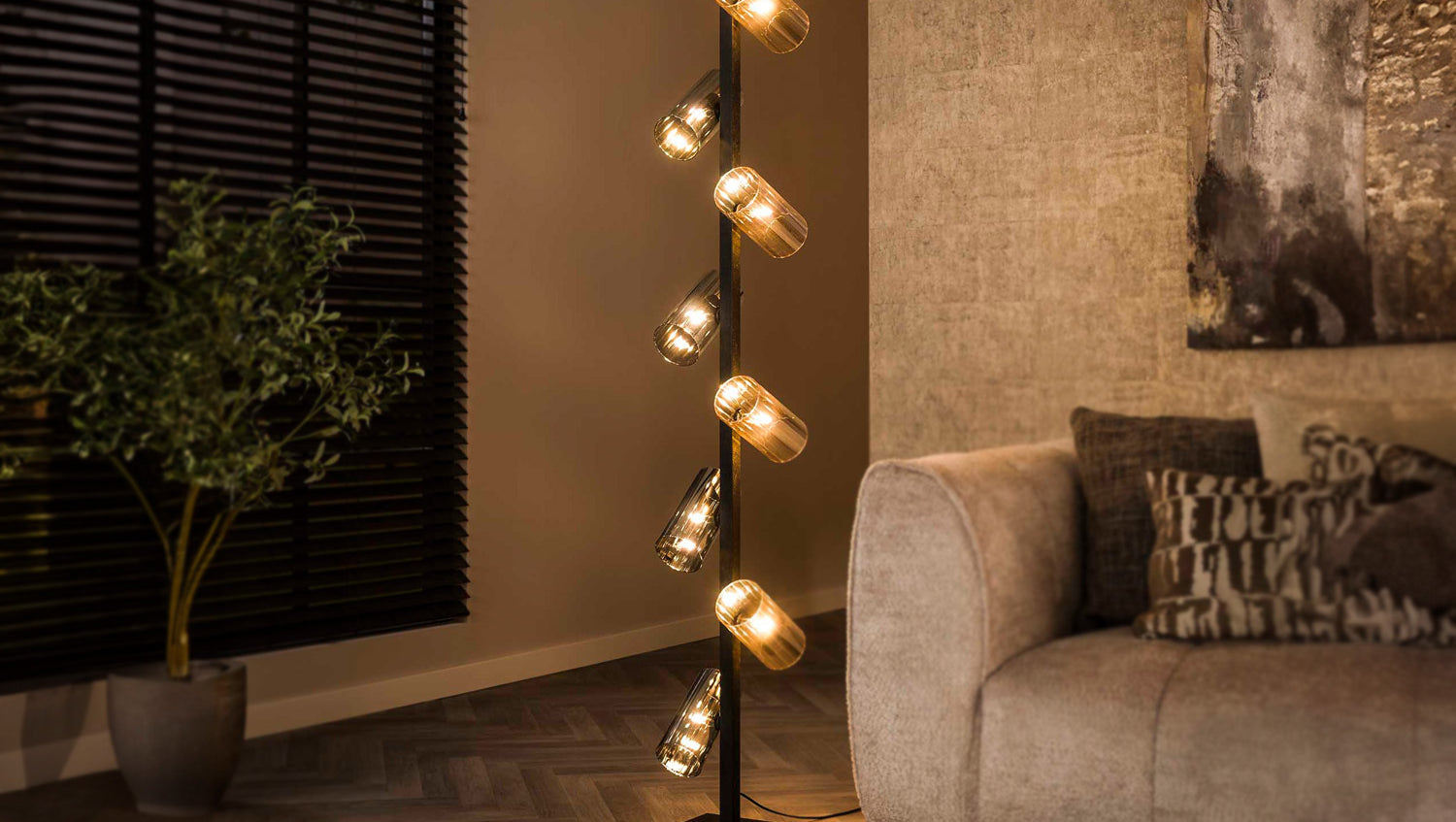 Die KAWOLA Stehlampe MALLAWI vereint elegantes Design mit flexibler Beleuchtung. Sie verfügt über acht kunstvoll gestaltete Glasschirme in bernsteinfarbenem und chromfarbenem Glas, die individuell gedreht werden können, um das Licht nach Ihren Wünschen zu lenken. Die kunstvoll schwarz lackierten Metallteile ergänzen das stilvolle Design und verleihen der Lampe einen modernen Touch. Die MALLAWI Stehlampe ist nicht nur ein optisches Highlight, sondern bietet auch eine funktionale Beleuchtungslösung für Ihr Zuhause. Ergänzen Sie Ihre Einrichtung mit den passenden Hängelampen aus der MALLAWI-Serie für ein harmonisches Gesamtbild. Ideal für Wohnzimmer, Leseecken oder Flure, bringt die KAWOLA MALLAWI Stehlampe sowohl Ästhetik als auch Anpassungsfähigkeit in jeden Raum.