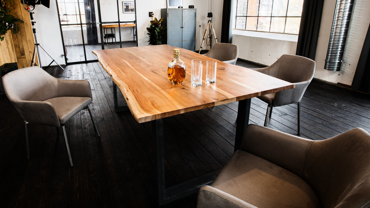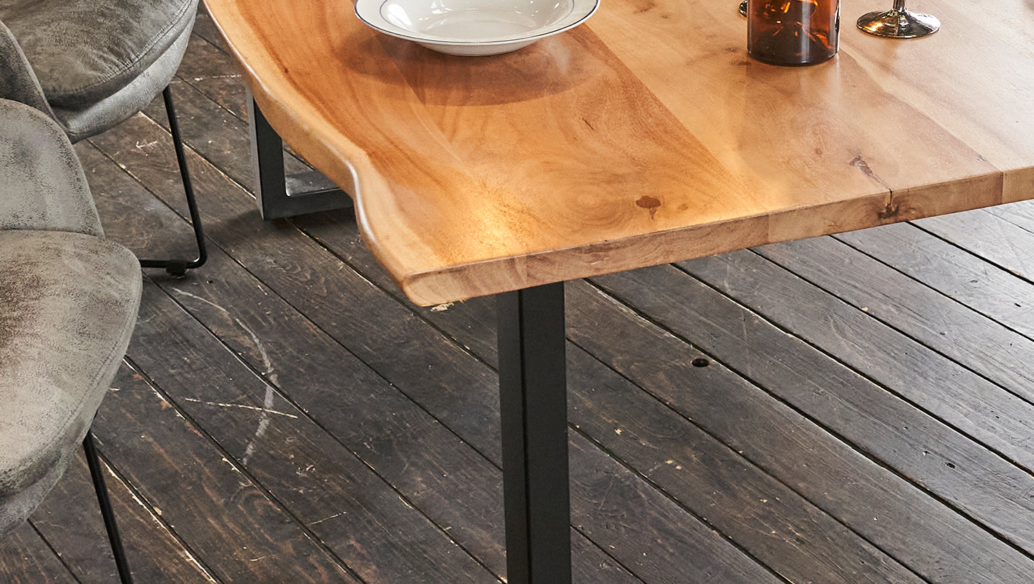 Wunderschöner Esstisch, mit Massivholzplatte, der sich wunderbar in das moderne, aber auch das rustikal gemütliche Wohnambiente integrieren lässt. Besonderes Highlight des Esstisches sind die Tischkanten, die den natürlichen Formen eines Baumes entsprechen. Das kubische Metallgestell bildet hierzu einen gelungenen Kontrast, der dem Massivholz Esstisch einen Hauch industriellen Charme verleiht.