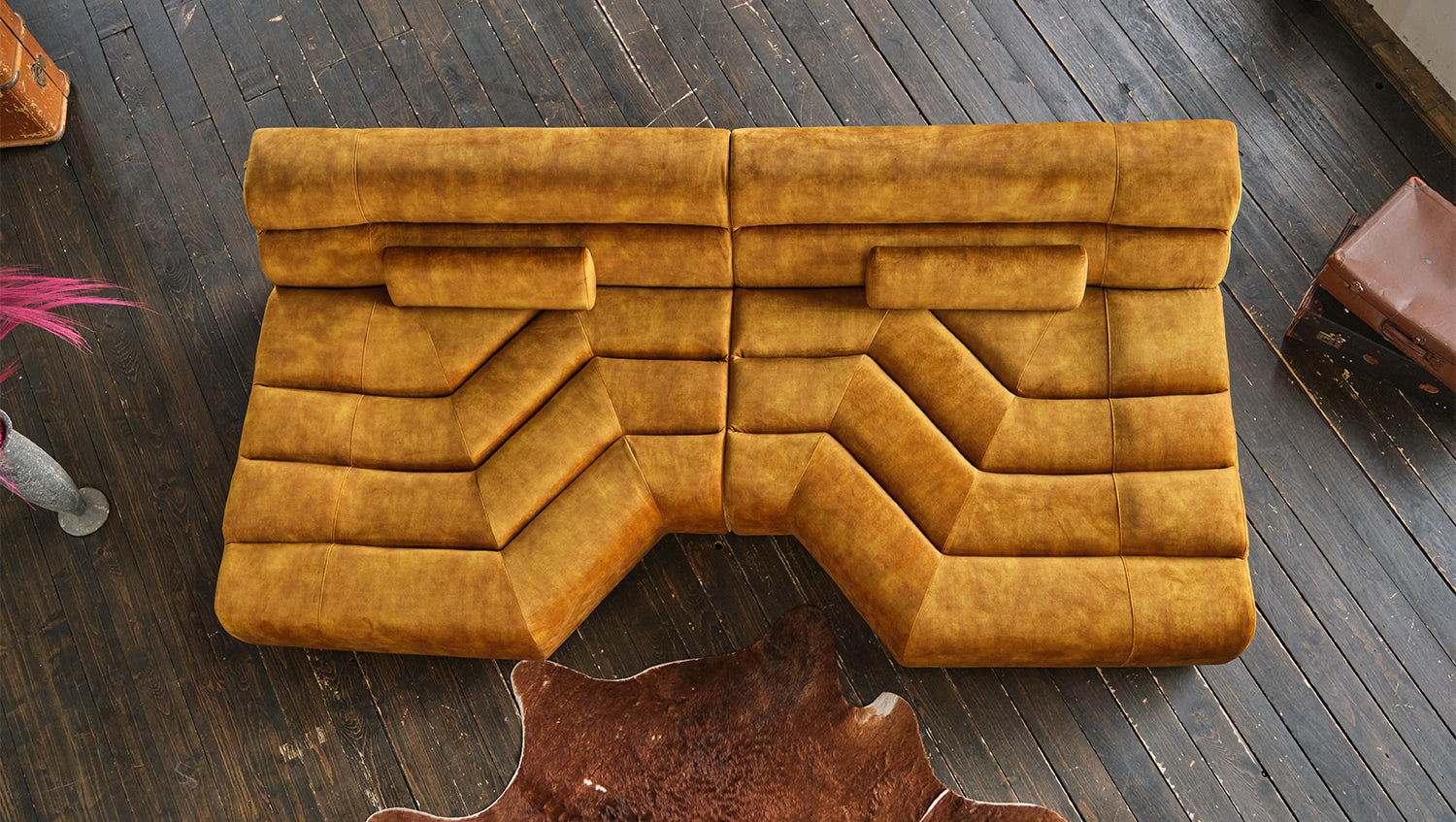 Tiefe Nähte in der Sitz- und Rückenfläche verleihen dem Big Sofa eine schlauchartige und sportliche Optik. Der Bezug aus hochwertigem Velvet Vintage betont die sportliche Eleganz des Sofas.