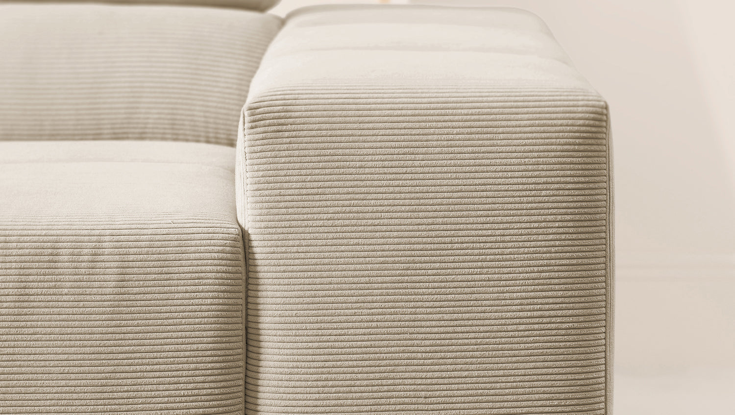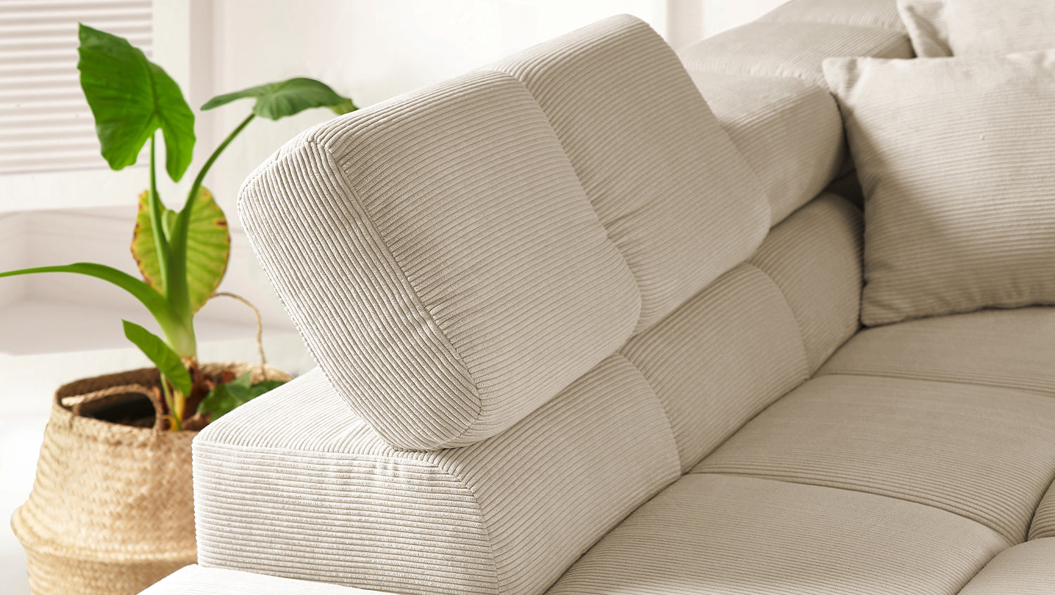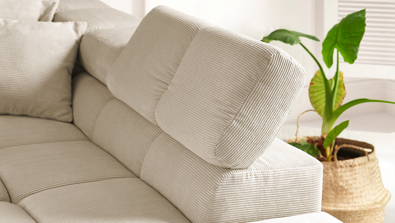 Das KAWOLA Ecksofa NEVADA verbindet moderne Designwelten mit zeitloser Eleganz und fügt sich nahtlos in jedes Interieur ein. Seine kubische Form und die unaufdringlichen Gleitfüße verleihen dem Sofa eine gewisse Leichtigkeit, die durch die quadratischen Absteppungen noch unterstrichen wird. Die Kopfstützen können ganz nach den individuellen Sitzvorlieben entweder hoch- oder heruntergeklappt werden. Die komplexe, 3-stufige Polsterung garantiert außerdem höchsten Sitzkomfort. Selbstverständlich wurde das Sofa auch auf der Rückseite mit dem filigranen Feincord-Stoff bezogen, sodass es auch frei in den Raum gestellt eine gute Figur macht. Egal zu welcher Gelegenheit - auf dem Sofa NEVADA findet jeder ein Plätzchen zum Entspannen!