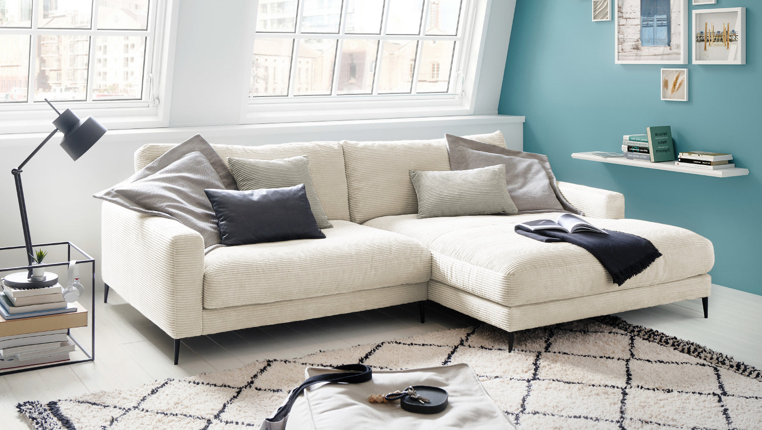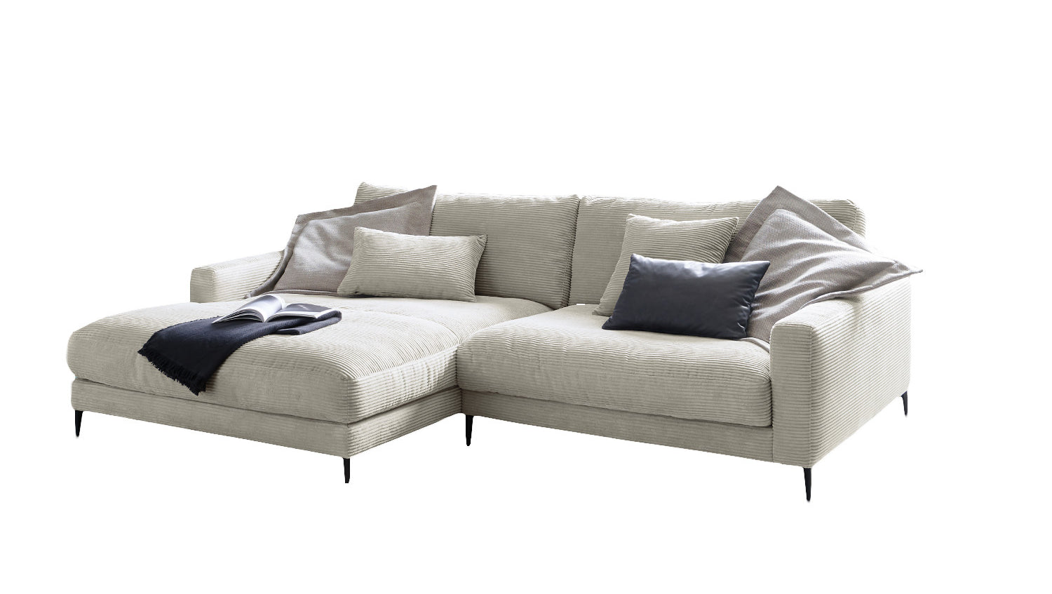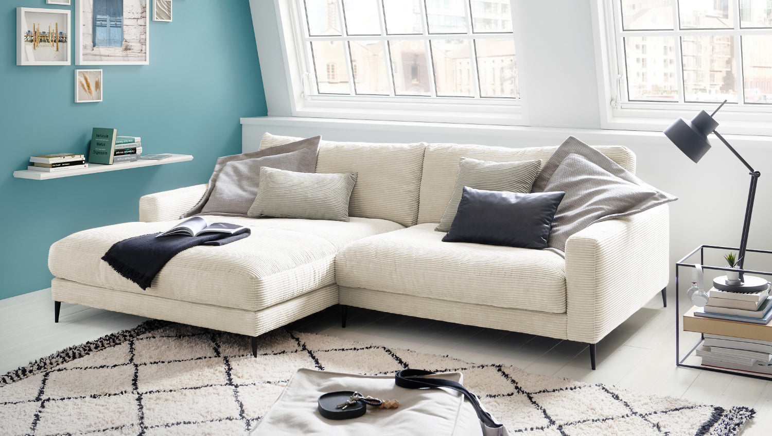 Das KAWOLA Ecksofa CARA verbindet klassisches Design mit moderner Sachlichkeit und fügt sich nahtlos in jedes Interieur ein. Seine weichen Formen und der Bezug aus angesagtem Cord-Stoff verleihen dem Sofa eine zeitlose Eleganz. Die Polsterung passt sich der Körperform an; Sitzabdrücke sowie Wellenbildung der Bezüge sind warentypisch. Der Sitz besteht aus einer Unterfederung mit dauerelastischen Stahl-Wellenfedern und einer oberseitigen Abdeckung sowie losen Sitzkissen aus PUR-Schaum. Sitz und Rücken sind abgedeckt mit einem Inlett, welches befüllt ist mit hochwertigen Füllstoffen, die eine Beimischung von Federn enthalten. Um ein Stauchen des Füllmaterials zu verhindern, sollten die Rückenkissen nach Gebrauch aufgeschüttelt werden. Egal zu welcher Gelegenheit - auf dem Sofa CARA findet jeder ein Plätzchen zum Entspannen!