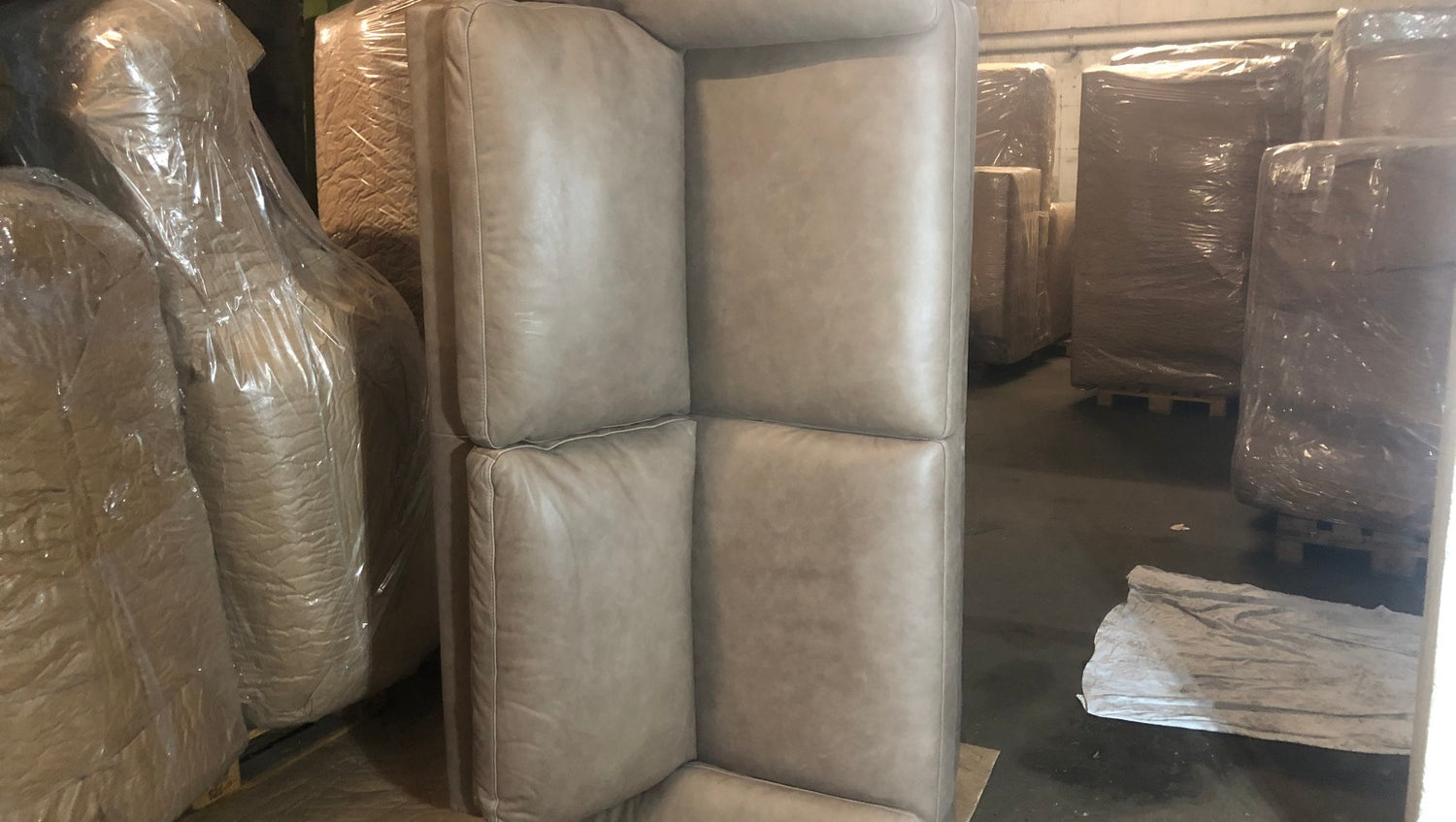 Das Modell Deside wurde komplett in Leder Pallino grau überzogen und lässt sich somit auch frei in den Raum stellen.