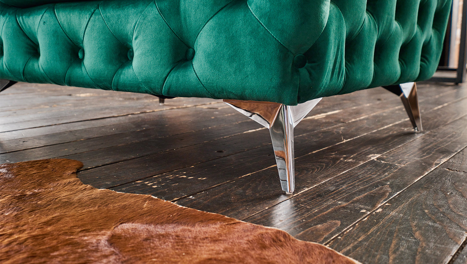 Das KAWOLA Sofa NARLA ist ein echter Hingucker. Die Rücken- sowie auch die Armlehne sind modisch versteppt und das komplette Sofa ist in einem wunderschönen samtartigen Stoff bezogen. Durch die Form des Sofas und die Absteppungen erscheint das Stoffsofa im Chesterfield-Stil. Optisch setzen sich hier die Füße in Metall vom Sofa ab und lassen den Chesterfield-Look in einem modernen Bild erscheinen. Der innere Rahmen des Sofas wurde aus Massivholz gefertigt. Die Sitzfläche verfügt über einen Federkern und bietet einen tollen und bequemen Sitzkomfort. Hier lassen sich gemütliche Abende mit Freunden oder Familie verbringen und das Sofa NARLA wird der neue Blickfang in Ihrem Wohnbereich werden.