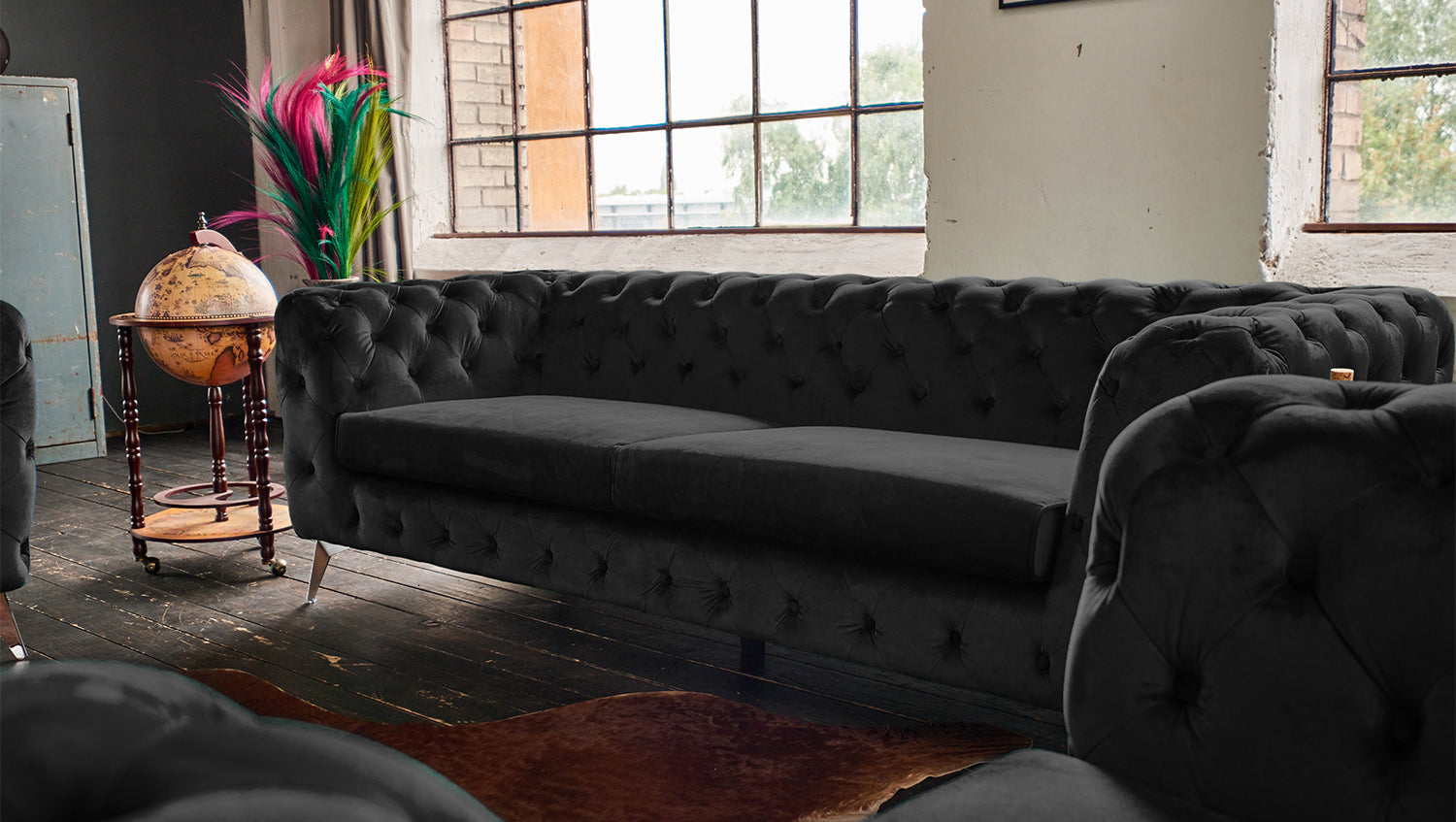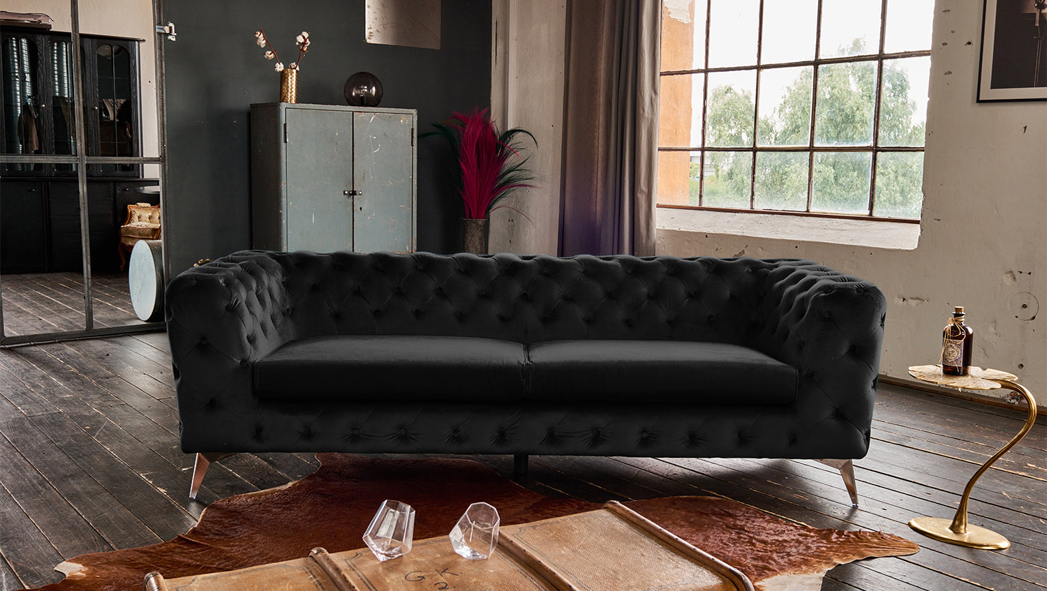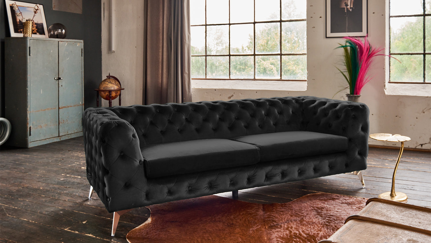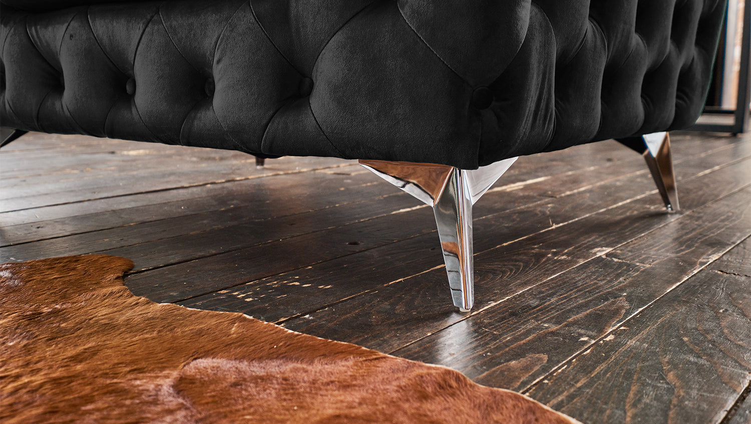 Optisch setzen sich hier die Füße in Metall vom Sofa ab und lassen den Chesterfield-Look in einem modernen Bild erscheinen.