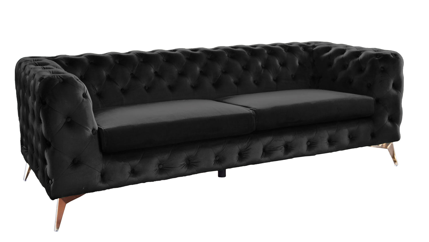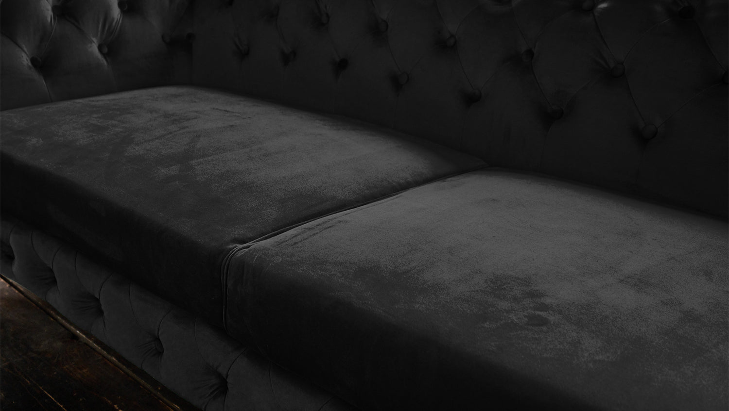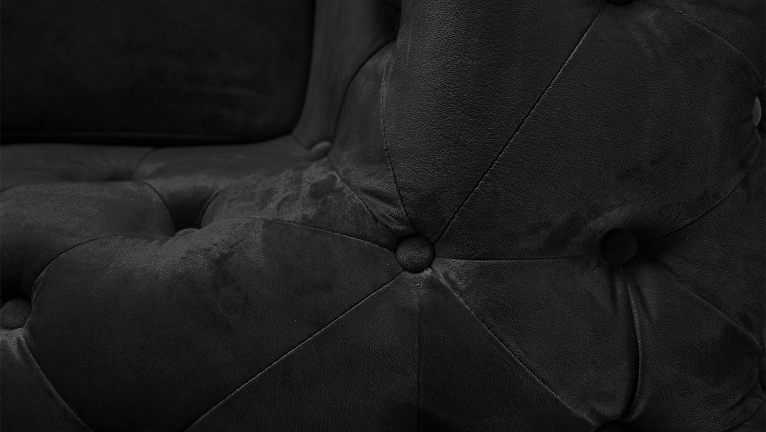 Die Rücken- sowie auch die Armlehne sind modisch versteppt und das komplette Sofa ist in einem wunderschönen samtartigen Stoff bezogen.
