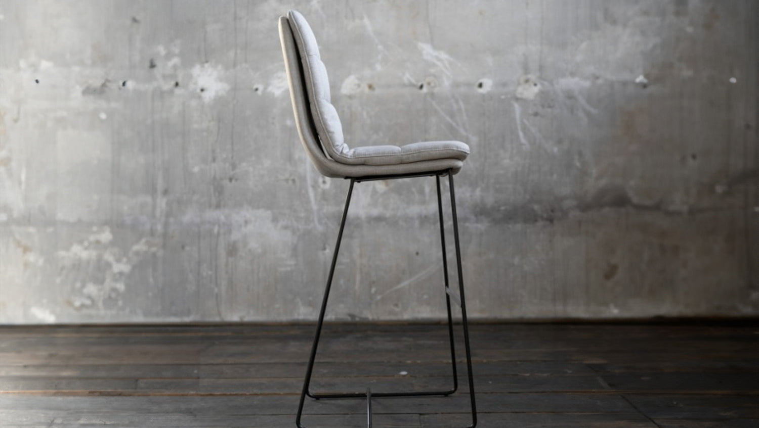 Das dunkle Gestell des Barhockers harmonisiert hervorragend mit dem hellen Stoff.