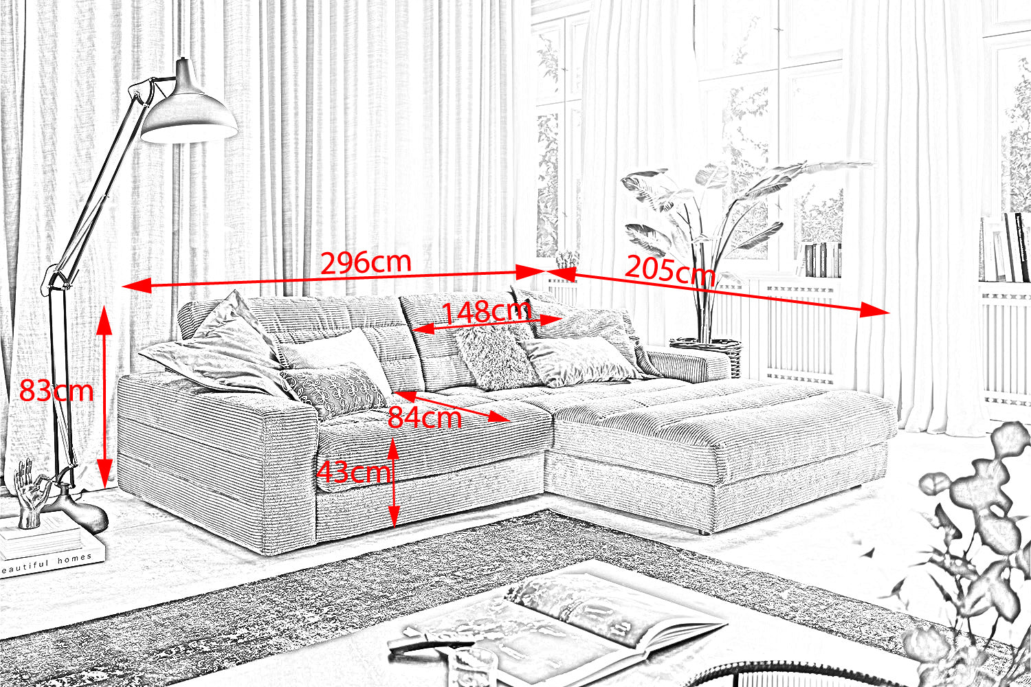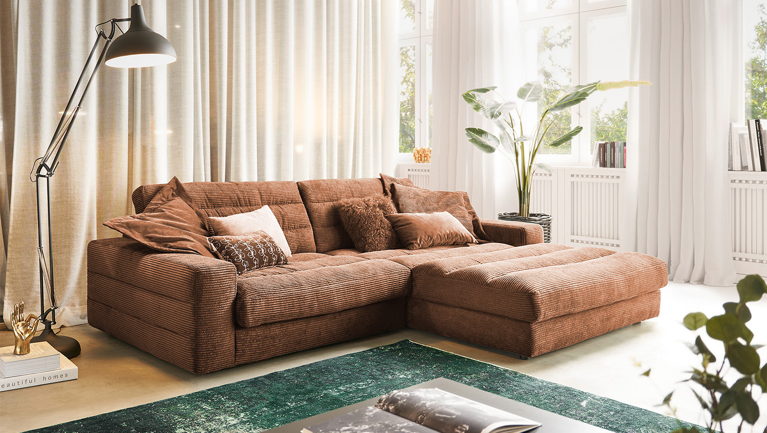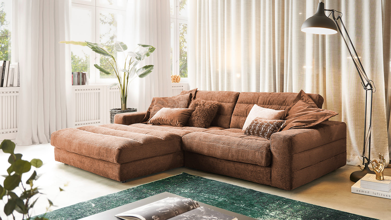 Das KAWOLA Ecksofa LANA begeistert mit Stil und Eleganz. Das klassische Design und der Bezug aus trendigem Cord-Stoff verleihen ihm eine zeitlose Schönheit, die Ihrem Wohnzimmer eine einzigartige Wohlfühl-Atmosphäre verleiht. Die Polsterung garantiert höchsten Sitzkomfort und passt sich der Körperform an. Sitzabdrücke sowie Wellenbildung der Bezüge sind warentypisch. Der Sitz besteht aus einer Unterfederung mit dauerelastischen Stahl-Wellenfedern und einer oberseitigen Abdeckung sowie lose Sitzkissen aus PUR-Schaum. Sitz und Rücken sind abgedeckt mit einem Inlett, welches befüllt ist mit hochwertigen Füllstoffen, die eine Beimischung von Federn enthalten. Um ein Stauchen des Füllmaterials zu verhindern, sollten die Sitz- und Rückenkissen nach Gebrauch aufgeschüttelt werden. Entspannen Sie auf dem KAWOLA Sofa LANA, und lassen Sie sich aus dem grauen Alltag entführen...