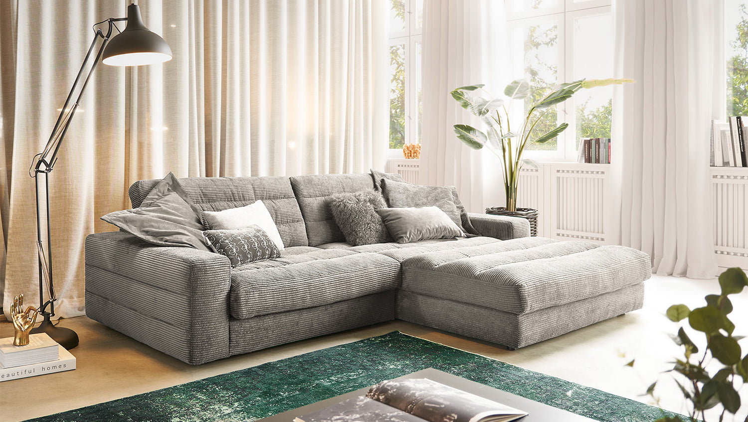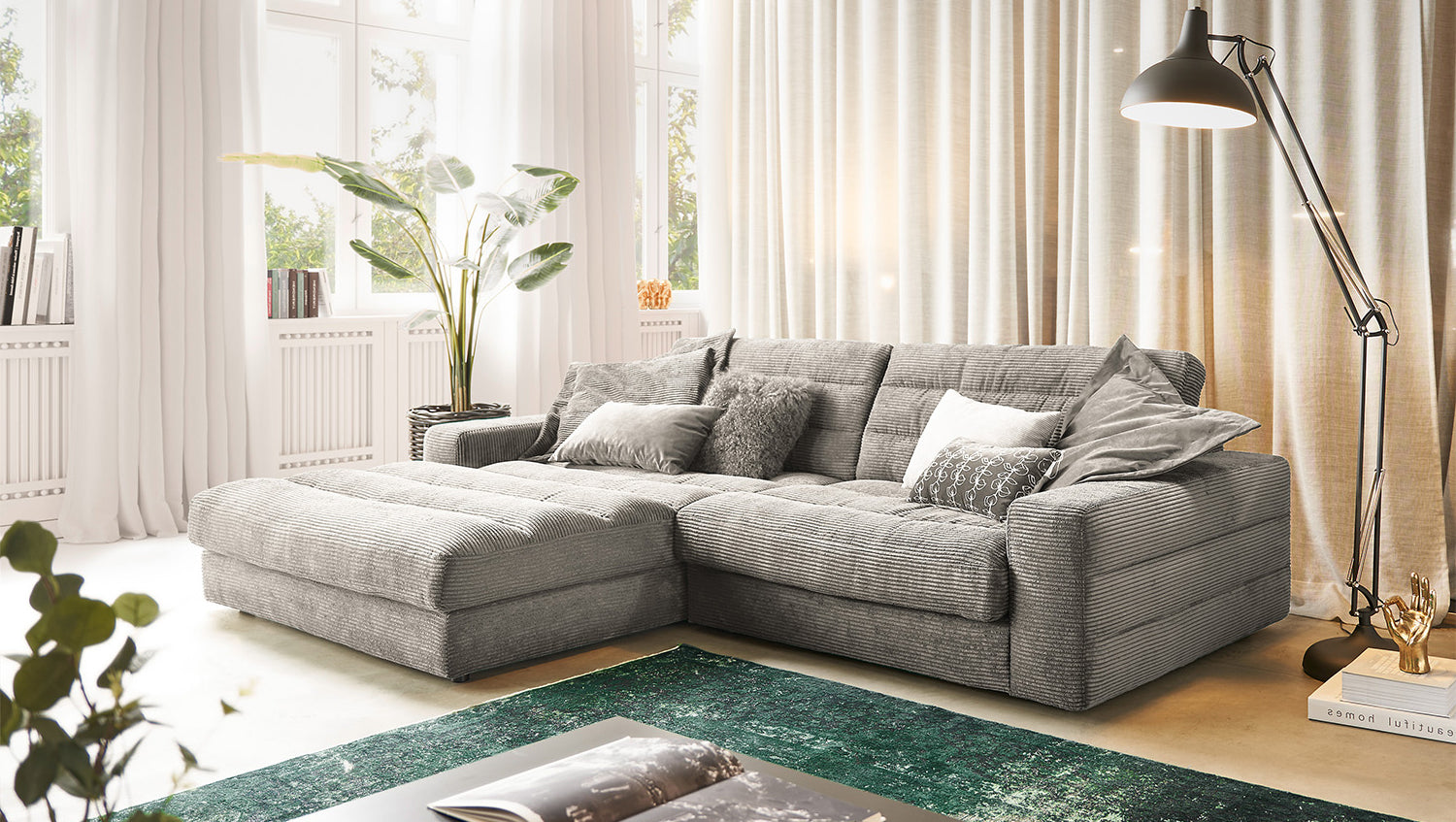 Das KAWOLA Ecksofa LANA begeistert mit Stil und Eleganz. Das klassische Design und der Bezug aus trendigem Cord-Stoff verleihen ihm eine zeitlose Schönheit, die Ihrem Wohnzimmer eine einzigartige Wohlfühl-Atmosphäre verleiht. Die Polsterung garantiert höchsten Sitzkomfort und passt sich der Körperform an. Sitzabdrücke sowie Wellenbildung der Bezüge sind warentypisch. Der Sitz besteht aus einer Unterfederung mit dauerelastischen Stahl-Wellenfedern und einer oberseitigen Abdeckung sowie lose Sitzkissen aus PUR-Schaum. Sitz und Rücken sind abgedeckt mit einem Inlett, welches befüllt ist mit hochwertigen Füllstoffen, die eine Beimischung von Federn enthalten. Um ein Stauchen des Füllmaterials zu verhindern, sollten die Sitz- und Rückenkissen nach Gebrauch aufgeschüttelt werden. Entspannen Sie auf dem KAWOLA Sofa LANA, und lassen Sie sich aus dem grauen Alltag entführen...
