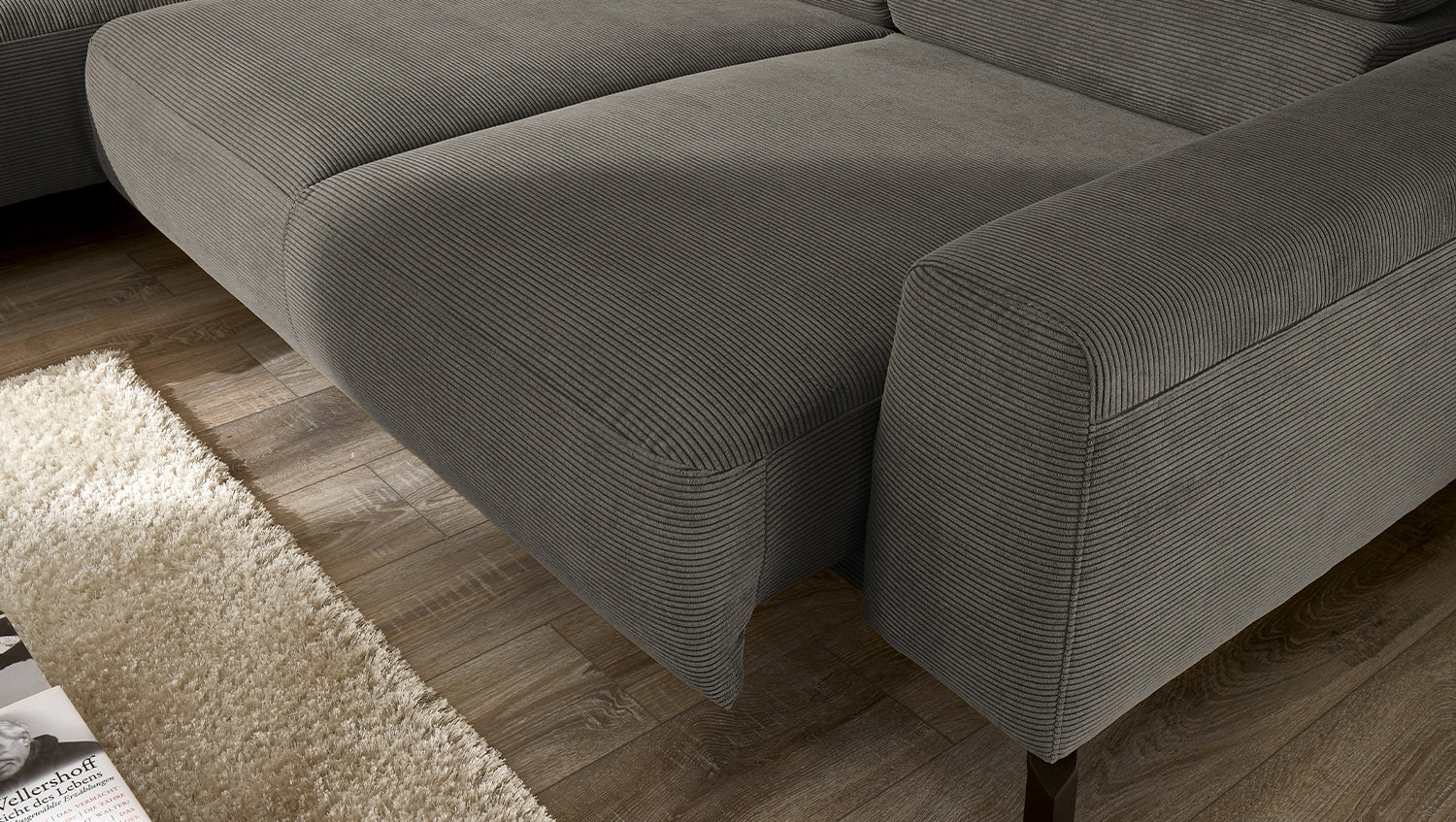 Entdecken Sie das exklusive Ecksofa DELIA von KAWOLA – ein wahres Meisterwerk in puncto Design und Komfort. Der Rundumbezug aus filigranem Feincord verleiht diesem Sofa eine luxuriöse Note und sorgt für ein einladendes Ambiente. Die schwarzen Metallfüße setzen elegante Akzente und garantieren Stabilität.