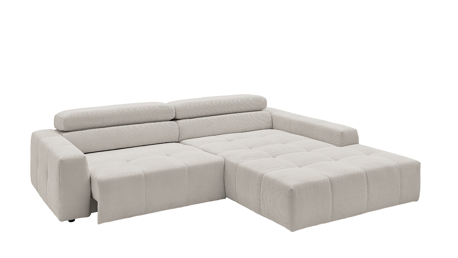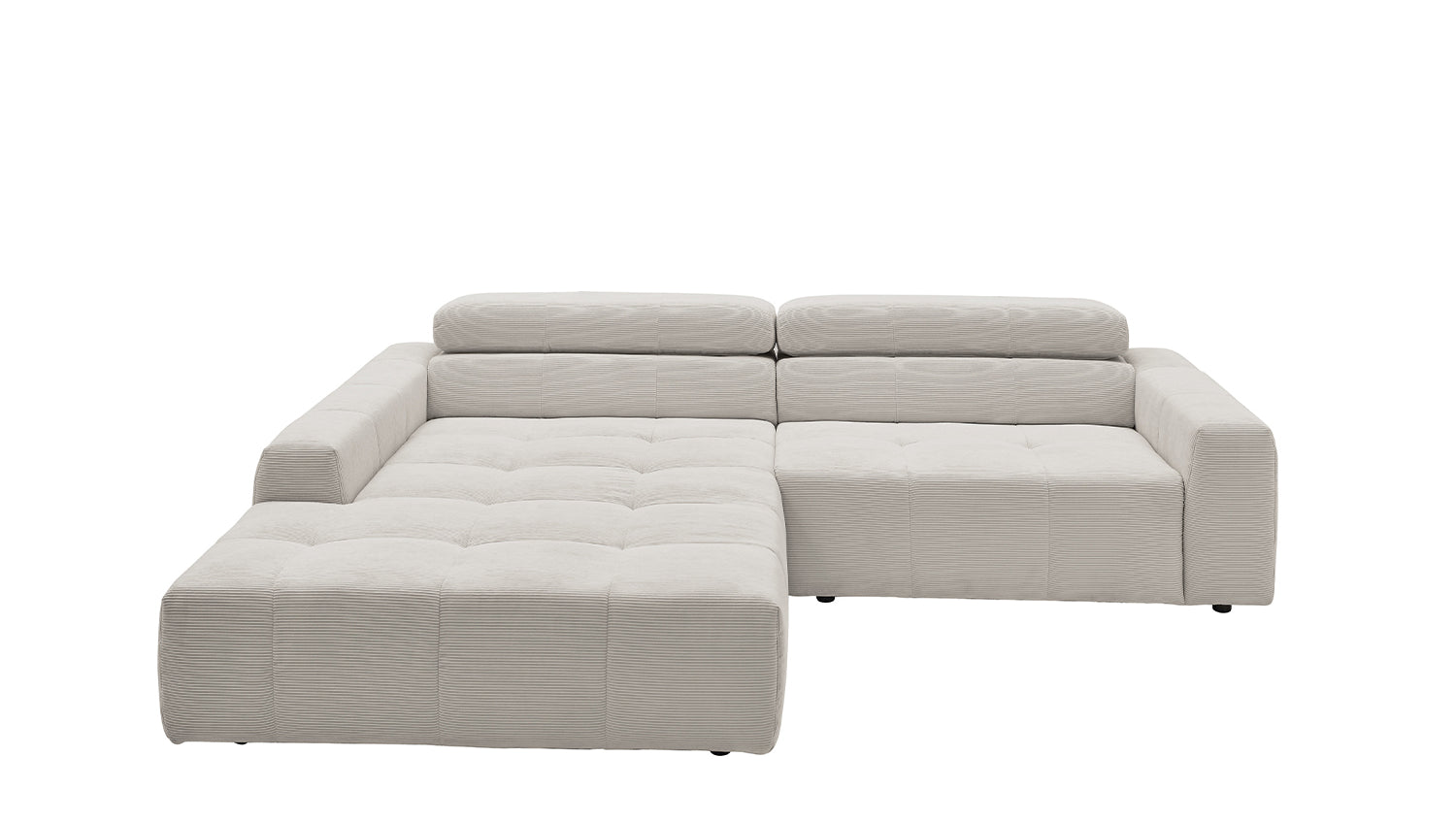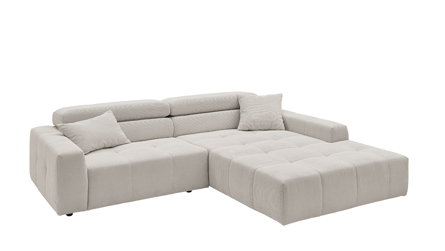 Entdecken Sie das stilvolle Ecksofa RENO von KAWOLA, das mit seinem hochwertigen Cordbezug und seiner raffinierten Kopfteilverstellung beeindruckt. Der Rundumbezug aus erstklassigem Cord verleiht diesem Ecksofa einen zeitlosen Charme und eine angenehme Haptik. Der ergonomisch geformte Rücken aus Schaumstoff sorgt für zusätzlichen Komfort, während die Wellenunterfederung und der PUR-Schaum im Sitzbereich ein angenehmes Sitzgefühl gewährleisten. Die innovative Kopfteilverstellung ermöglicht es Ihnen, die Kopfteile individuell zu neigen oder aufrecht zu stellen, um Ihre persönliche Entspannungsposition zu finden. Mit einem mittelfesten Sitzkomfort bietet das Ecksofa RENO die perfekte Kombination aus Stil und Gemütlichkeit. Erleben Sie pure Entspannung in Ihrem Wohnzimmer mit diesem bequemen und ansprechenden Möbelstück. Lieferung ohne Kissen und Dekoration