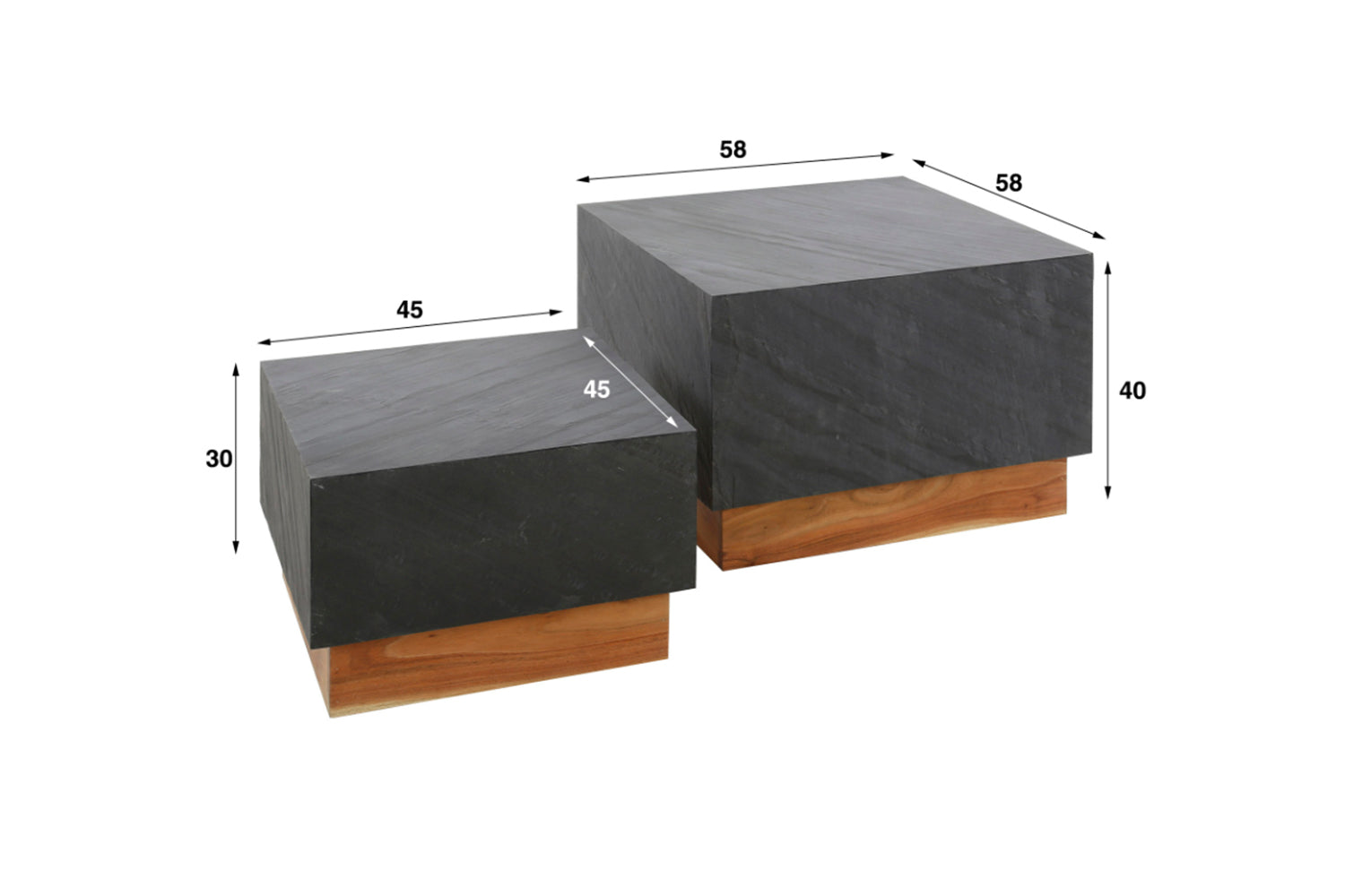 Das Couchtisch-Set NOME von KAWOLA begeistert mit zeitloser Eleganz und natürlichen Materialien. Es besteht aus zwei formschönen Tischen, die stilvoll jedes Wohnzimmer ergänzen. Die Tischplatten sind mit einer dünnen Schieferschicht veredelt – für eine edle Oberfläche bei gleichzeitig angenehmem Gewicht. Der stabile Sockel aus massivem Akazienholz sorgt für einen warmen, natürlichen Look und verleiht den Tischen festen Stand. Der größere Tisch misst 58 x 58 cm bei 40 cm Höhe, der kleinere 45 x 45 cm bei 30 cm Höhe – ideal zum Kombinieren und Variieren. Ob modern, klassisch oder rustikal: Das NOME Couchtisch-Set passt sich jedem Wohnstil an und wird zum stilvollen Blickfang. Perfekt für alle, die Design, Qualität und Funktionalität in einem Möbelstück vereint sehen möchten.