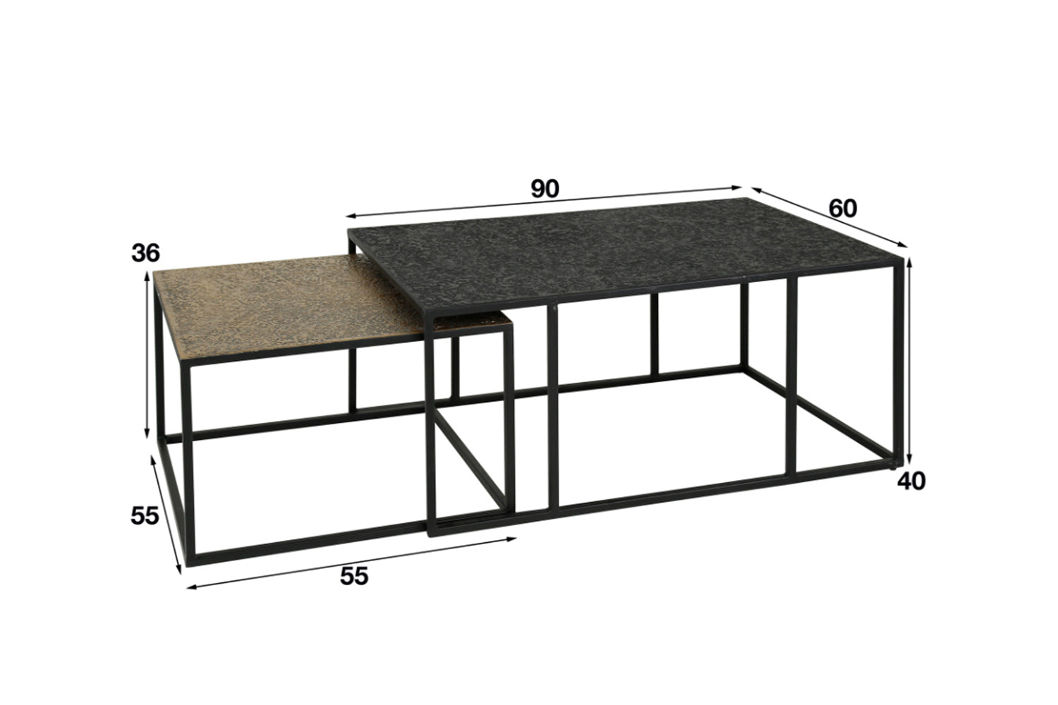 Das schöne Couchtisch-Set ABUNA von KAWOLA in Vierecksform ist in "Metallic"-Antikbronze und Schwarz gehalten. Auf der Oberseite ist eine sehr schöne Behandlung zu erkennen, die den Tischen ein einzigartiges Aussehen verleiht. Die Tische können nach Belieben zusammen gestellt werden. Dieses Set ist ein echter Hingucker. Es besteht aus zwei Tischen. Der größere Tisch hat eine Fläche von 90 x 60 cm und eine Höhe von 40 cm, der kleinere Tisch hat eine Fläche von 55 x 55 cm und eine Höhe von 36 cm. Ob im modernen Loft, im gemütlichen Wohnzimmer oder in einer eleganten Lounge – das Couchtisch-Set ABUNA setzt stilvolle Akzente und verbindet Funktionalität mit zeitloser Ästhetik.