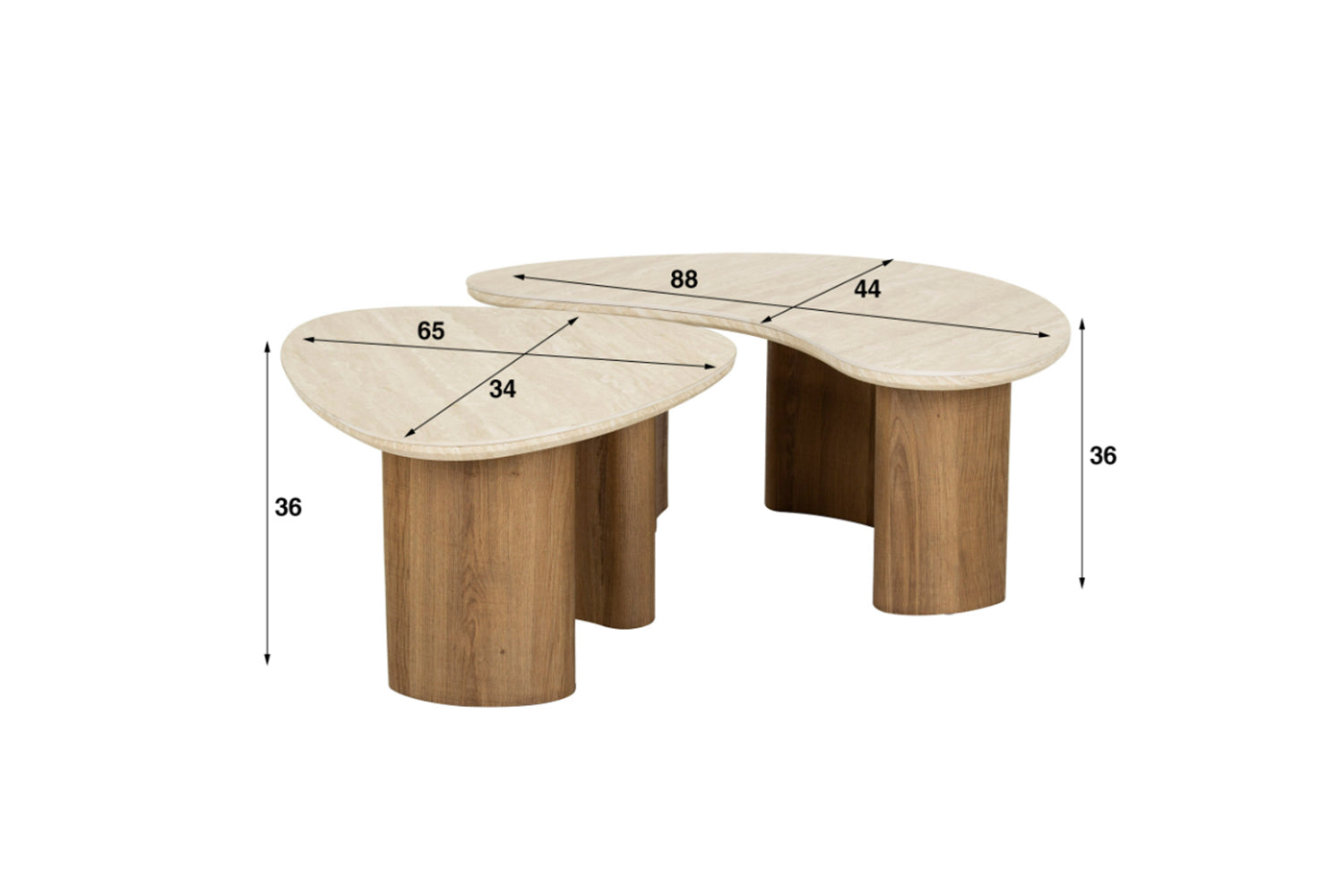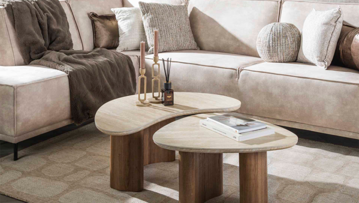 Das elegante, organisch geformte Couchtisch-Set PRETO von KAWOLA kombiniert einen stabilen Holzrahmen mit einer luxuriösen Keramikplatte in Travertinoptik, was ihm einen raffinierten Look verleiht - perfekt für moderne und klassische Interieurs. Diese Tische sind vielseitig und funktional, ein echtes Must-have! Das Set besteht aus wei Tischen. Der größere Tisch hat eine Fläche von 88 x 44 cm, der kleinere hat eine Fläche von 65 x 34 cm - bei einer Höhe von je 36 cm. Ob modern, rustikal oder klassisch – das PRETO Couchtisch-Set passt sich dank seines zeitlosen Looks mühelos jedem Einrichtungsstil an. Ideal als stilvoller Mittelpunkt im Wohnzimmer und ein echtes Highlight für Liebhaber hochwertiger Möbel.