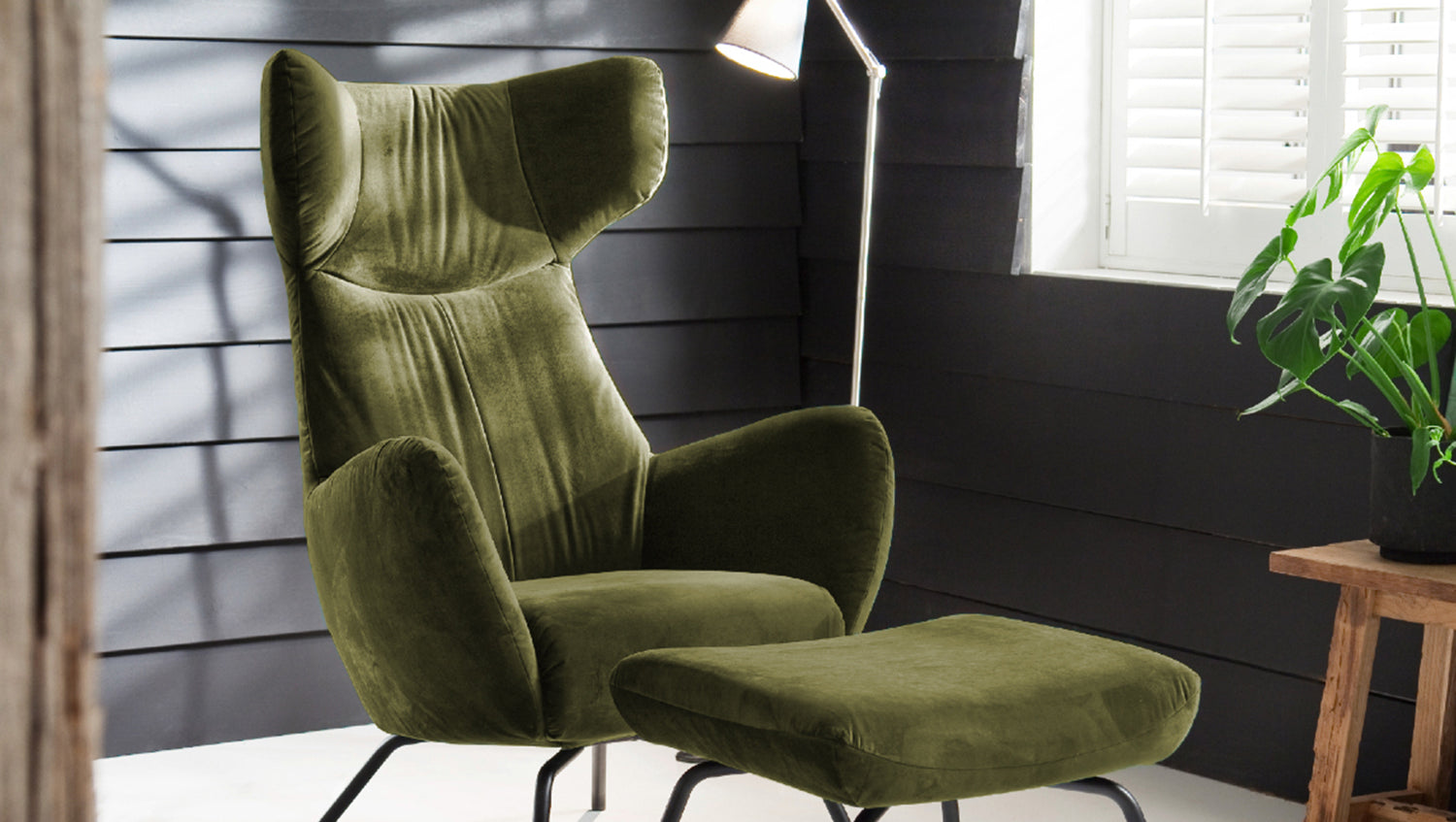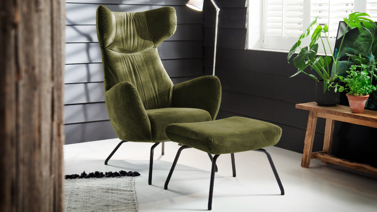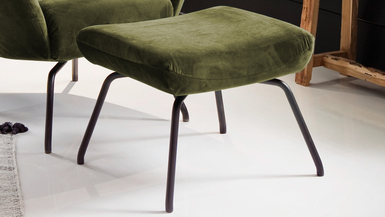 KAWOLA Sessel LOTTE Ohrensessel velvet olivgrün mit Hocker