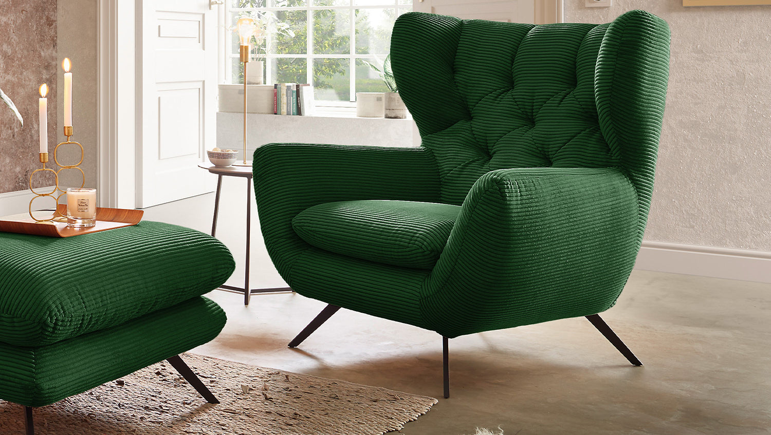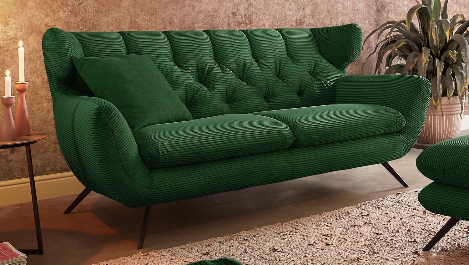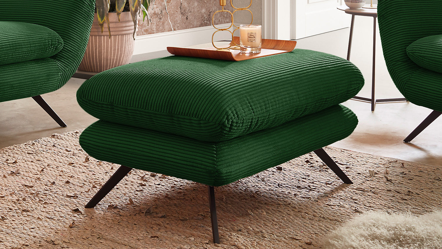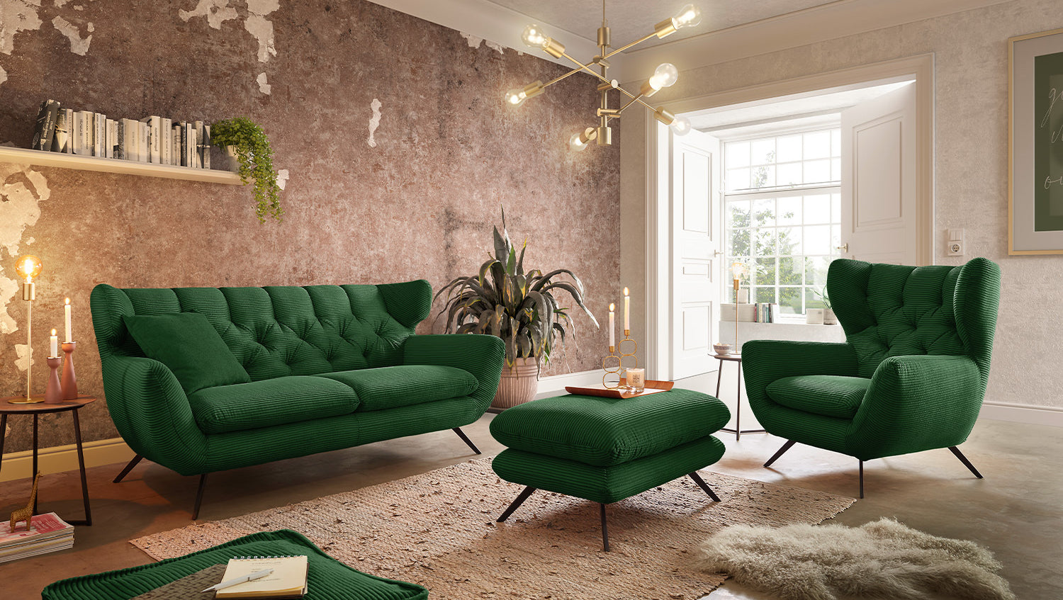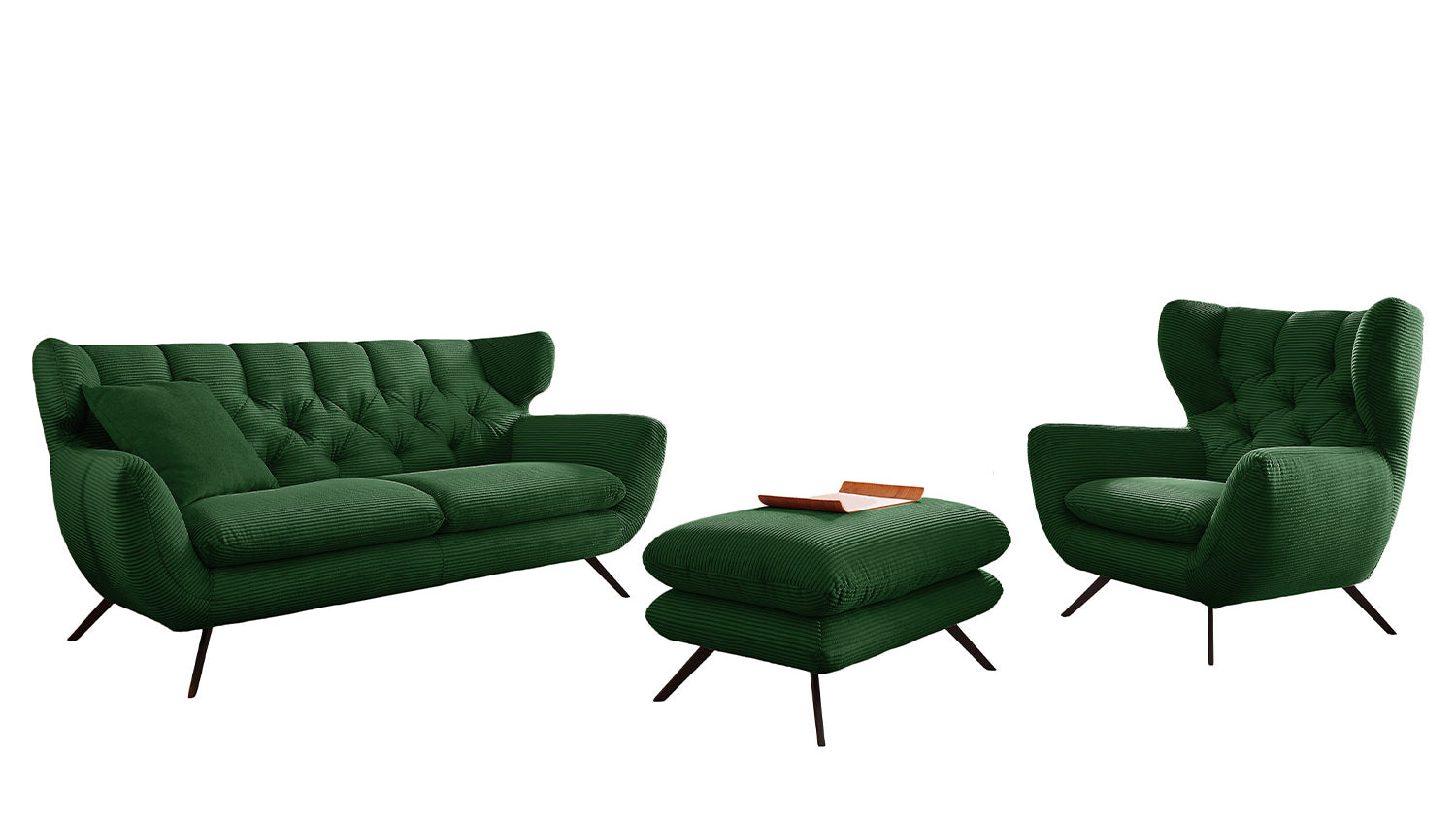KAWOLA Sitzgruppe CHARME Sofa Sessel Hockerbank Cord smaragd