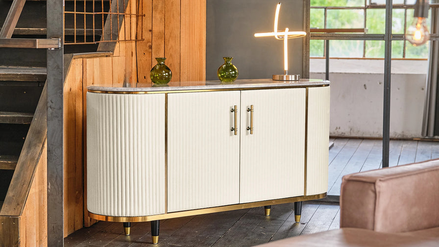 El aparador KAWOLA MARIA devuelve a tu hogar el encanto de los años 50. Su frente de piel sintética de alta calidad le confiere una textura elegante y contrasta con la encimera de mármol gris claro. Las patas de acero inoxidable dorado y los detalles finamente elaborados completan con estilo su diseño retro. Ya sea como pieza independiente o combinada con otras piezas de la serie, MARIA es sinónimo de diseño con carácter y sofisticación.