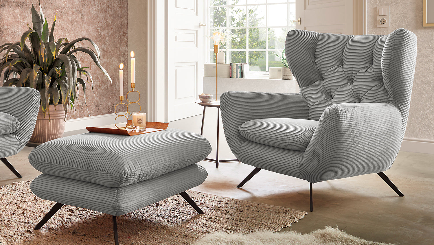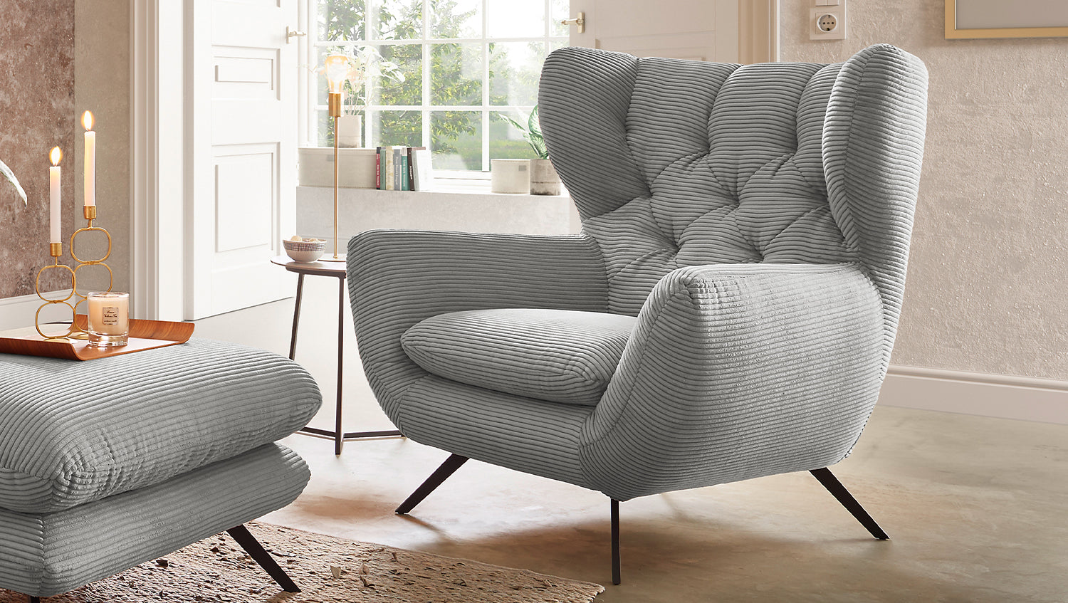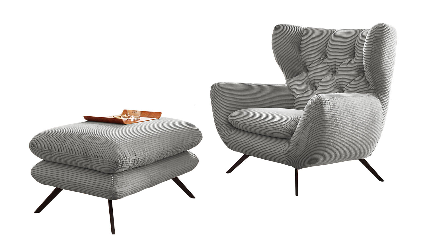 El sillón CHARME de KAWOLA es un sillón muy especial y pone nuevos acentos en el salón como auténtica pieza de diseño. El estilo del sillón CHARME recuerda a los años 60: el respaldo está cosido de forma elaborada sin botones; el respaldo está ligeramente curvado hacia delante en ambos lados y recuerda la forma de un sillón de orejas; los pies de metal con recubrimiento de polvo están ligeramente acampanados. A juego con la forma inusual del sillón CHARME, se ha optado por una funda de pana de aspecto ligeramente aterciopelado. El tapizado del sillón CHARME de KAWOLA es de espuma PUR y convence por su suave y desenfadado confort de asiento. Ni que decir tiene que el sillón está completamente revestido con la tela de pana, por lo que este estupendo sillón también puede colocarse en cualquier lugar de la habitación. Si no busca simplemente un sillón, sino un punto culminante muy especial, ¡el sillón KAWOLA CHARME es la elección perfecta!