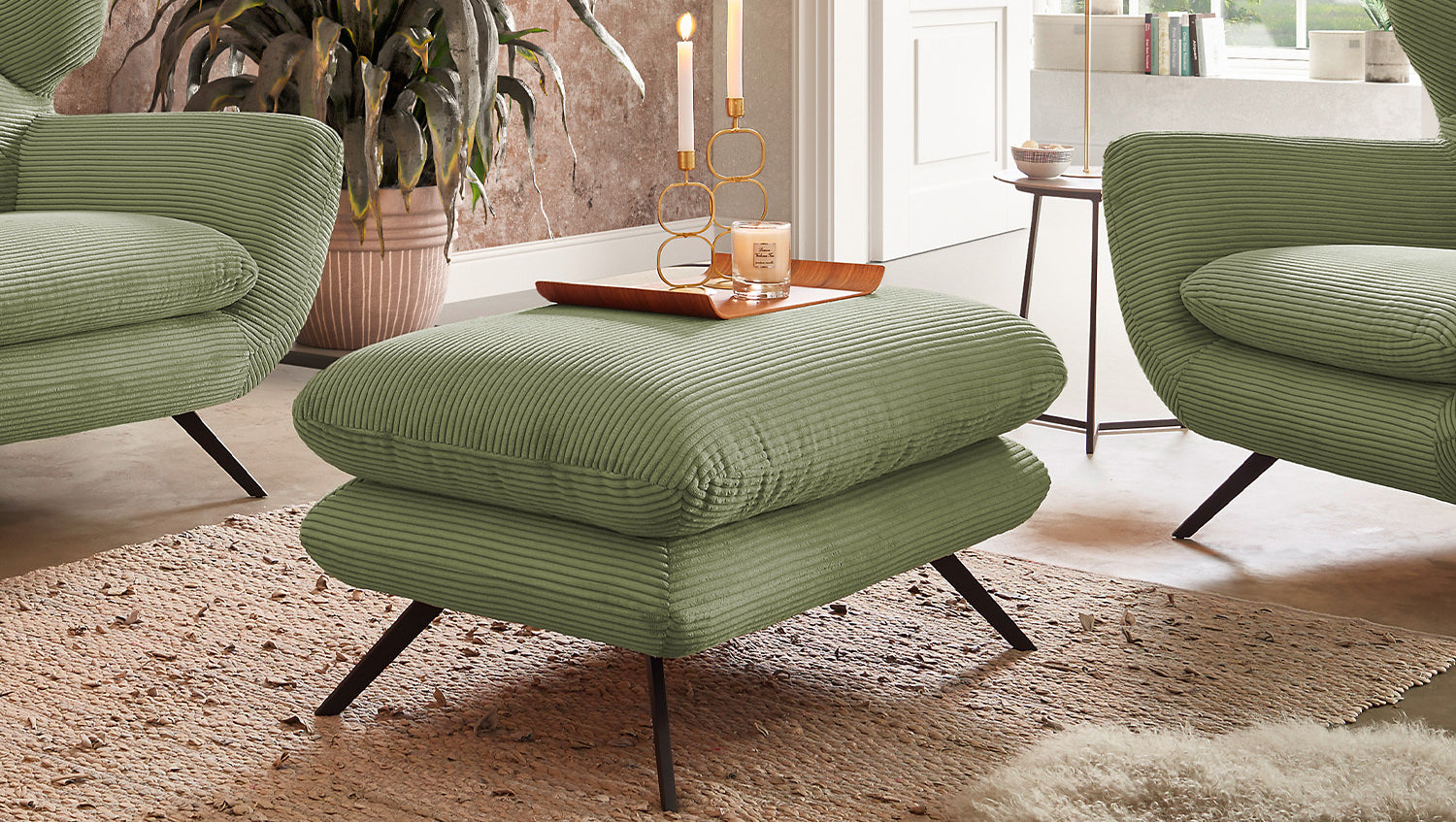 El taburete CHARME de KAWOLA es un banco taburete muy especial y pone nuevos acentos en el salón como auténtica pieza de diseño. El estilo del taburete CHARME recuerda a los años sesenta: en este caso se ha optado por la funda de pana a juego con la forma inusual. Los pies de metal negro son ligeramente acampanados. El tapizado del banco taburete CHARME es de espuma PUR e impresiona por su comodidad de asiento suave y desenfadada. El cojín del asiento se amolda cómodamente a la forma del cuerpo. Por supuesto, el taburete está completamente revestido con la tela Pana, por lo que también puede colocarse en cualquier lugar de la habitación. Si no busca un simple taburete, sino un punto de atracción muy especial, ¡el banco taburete CHARME de KAWOLA es la elección perfecta!