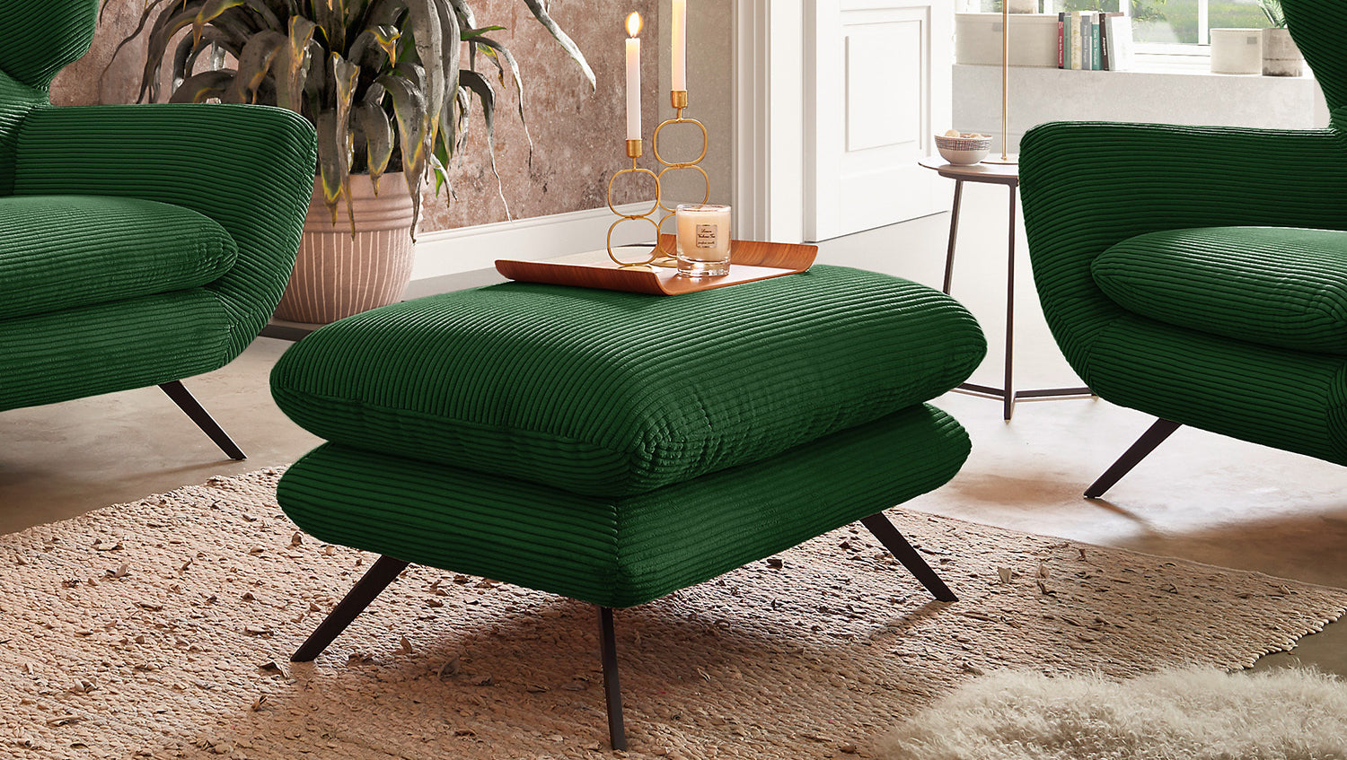 El taburete CHARME de KAWOLA es un banco taburete muy especial y pone nuevos acentos en el salón como auténtica pieza de diseño. El estilo del taburete CHARME recuerda a los años sesenta: en este caso se ha optado por la funda de pana a juego con la forma inusual. Los pies de metal negro son ligeramente acampanados. El tapizado del banco taburete CHARME es de espuma PUR e impresiona por su comodidad de asiento suave y desenfadada. El cojín del asiento se amolda cómodamente a la forma del cuerpo. Por supuesto, el taburete está completamente revestido con la tela Pana, por lo que también puede colocarse en cualquier lugar de la habitación. Si no busca un simple taburete, sino un punto de atracción muy especial, ¡el banco taburete CHARME de KAWOLA es la elección perfecta!