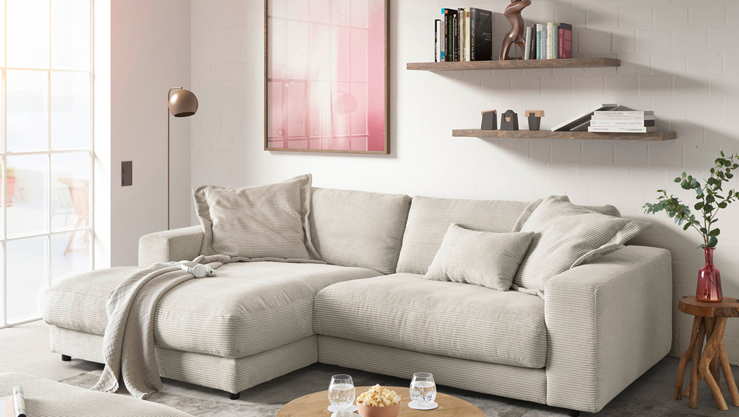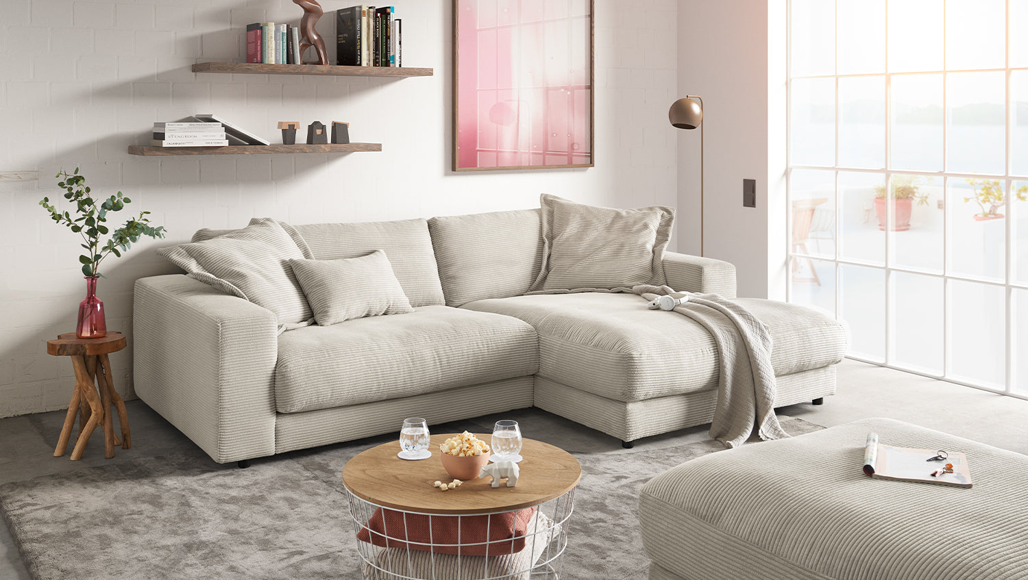 KAWOLA Sofá MADELINE Sofá esquinero con sillón Pana gris claro