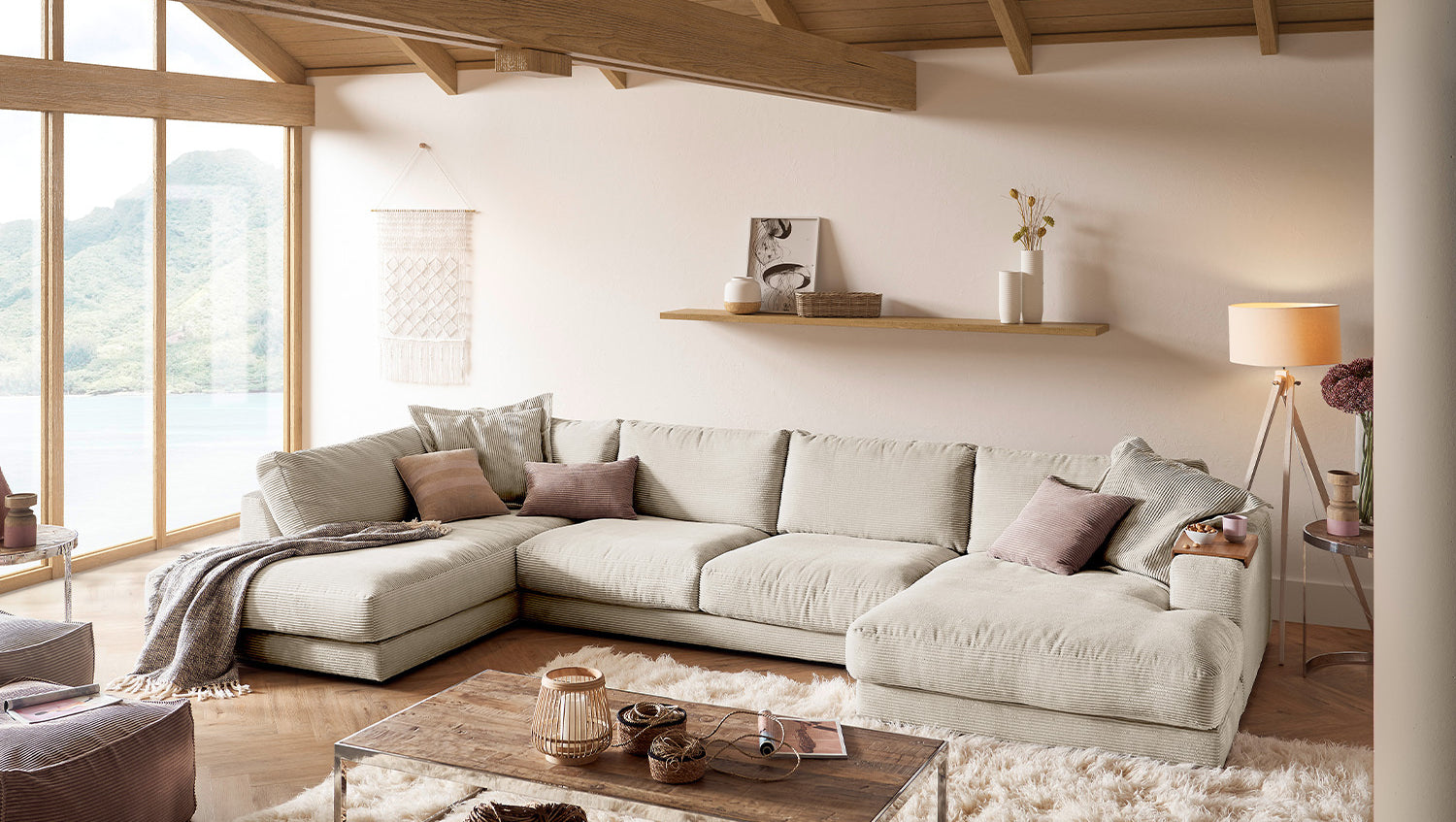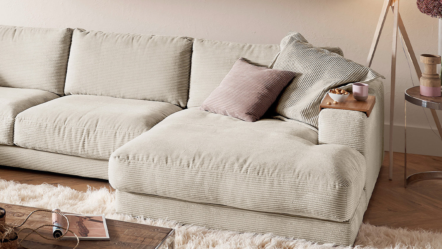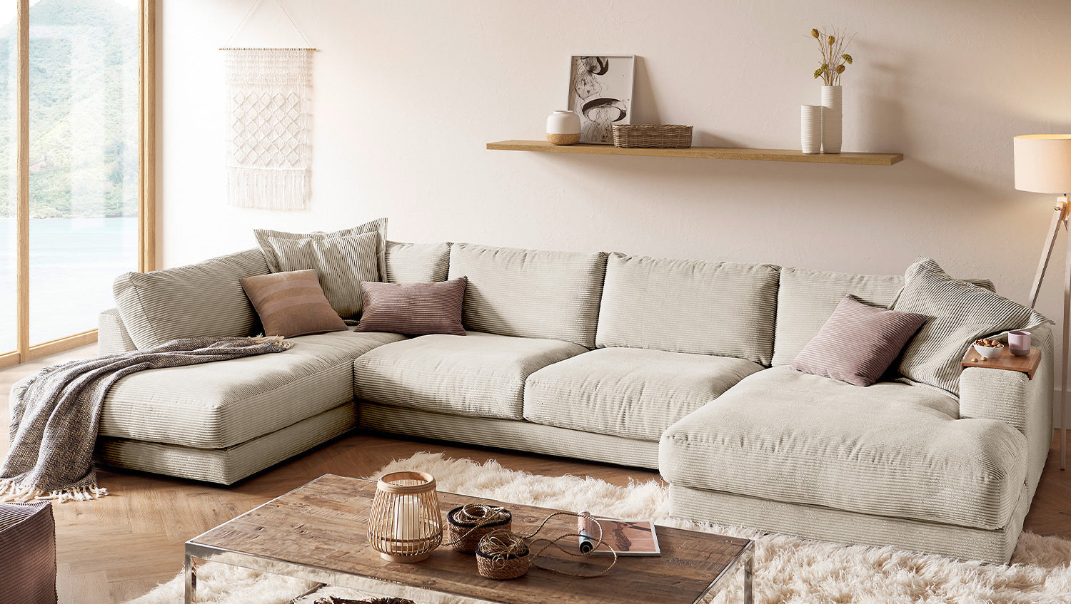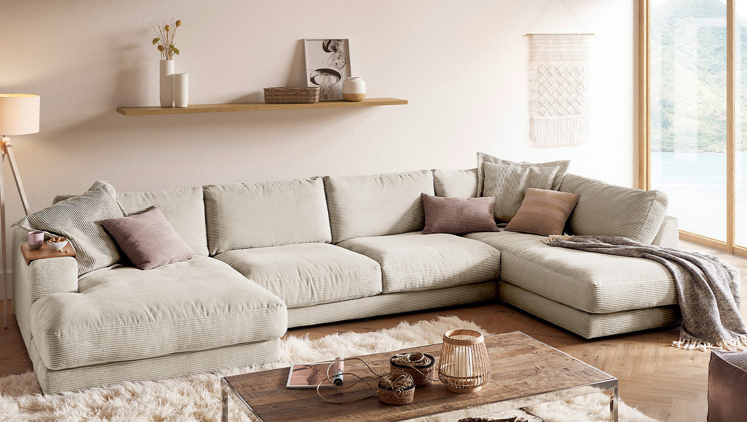 KAWOLA Sofá en forma de U MADELINE Pana crema blanco