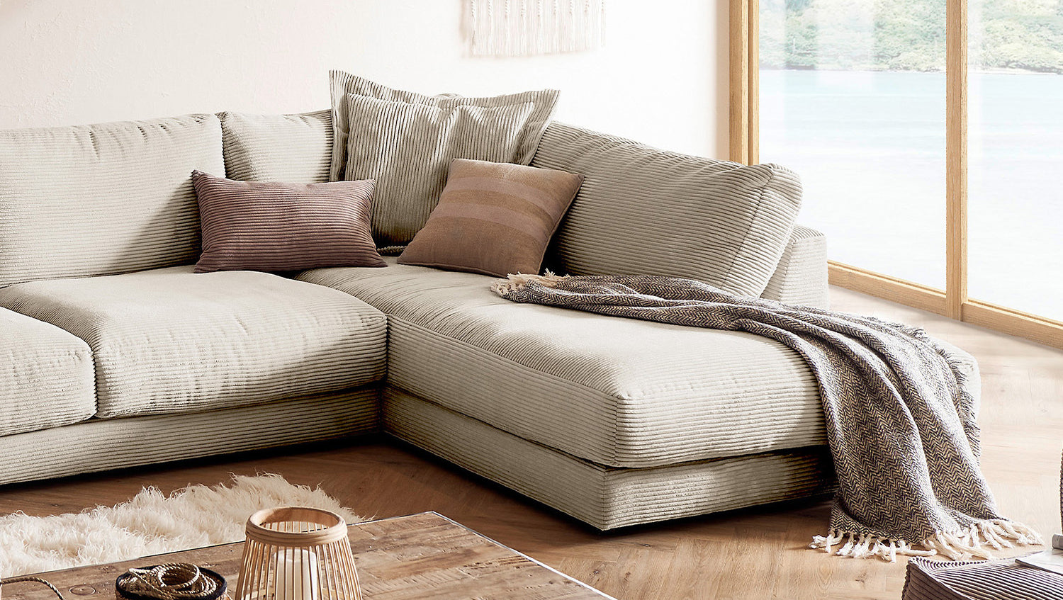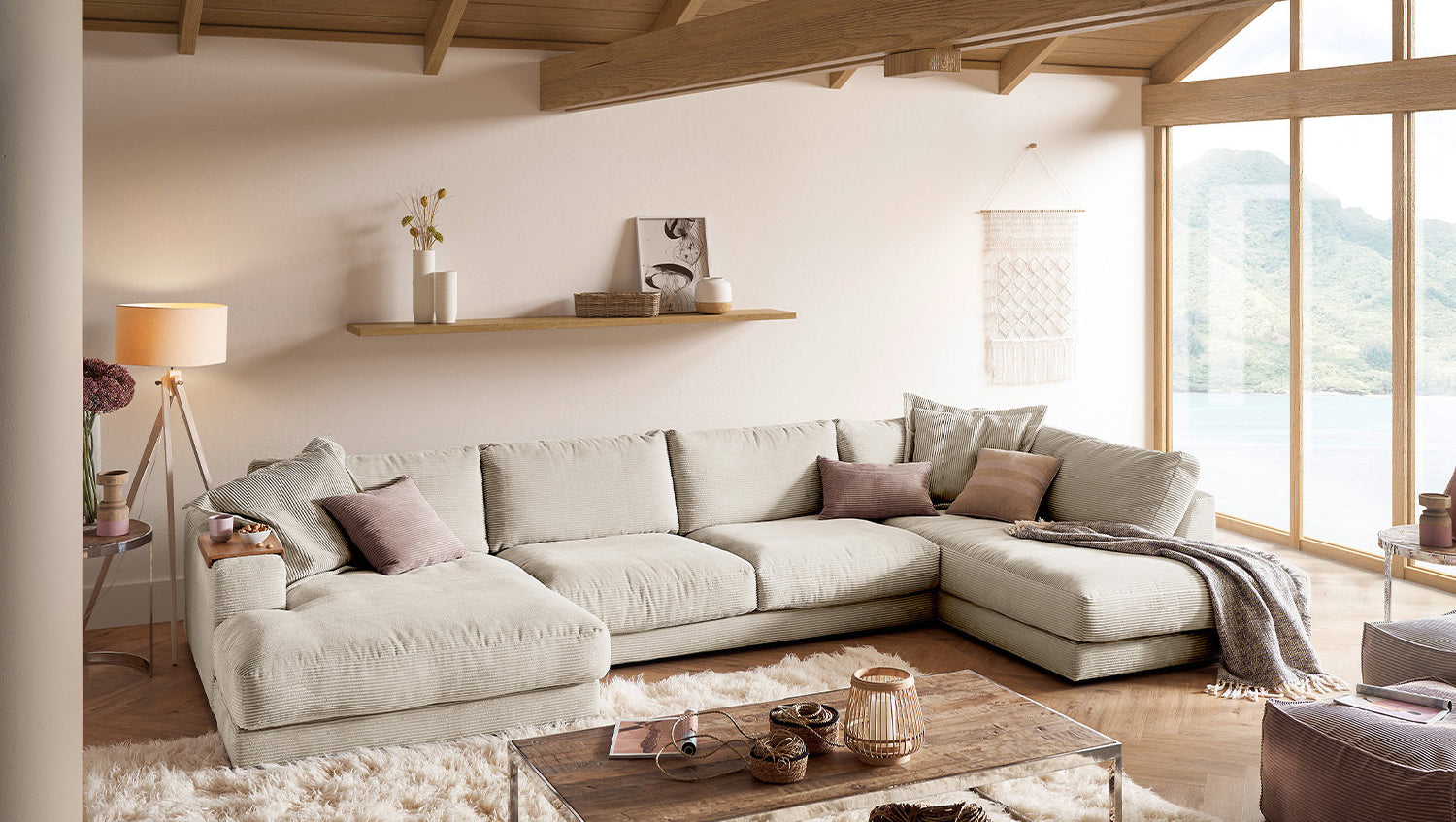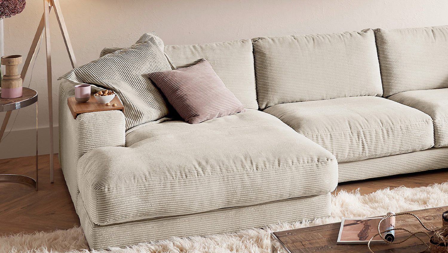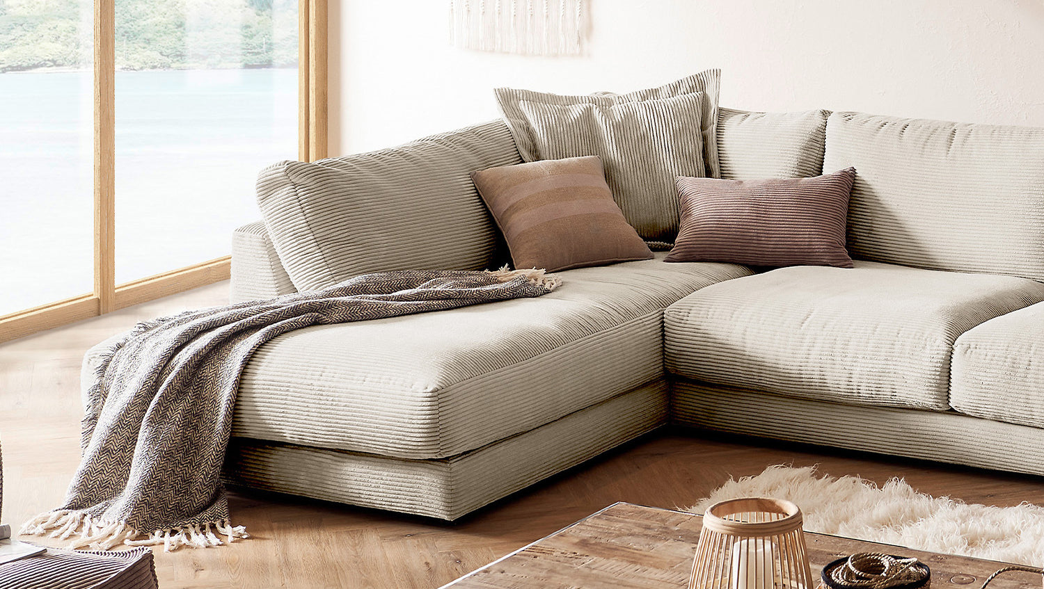 KAWOLA Sofá en forma de U MADELINE Pana crema blanco