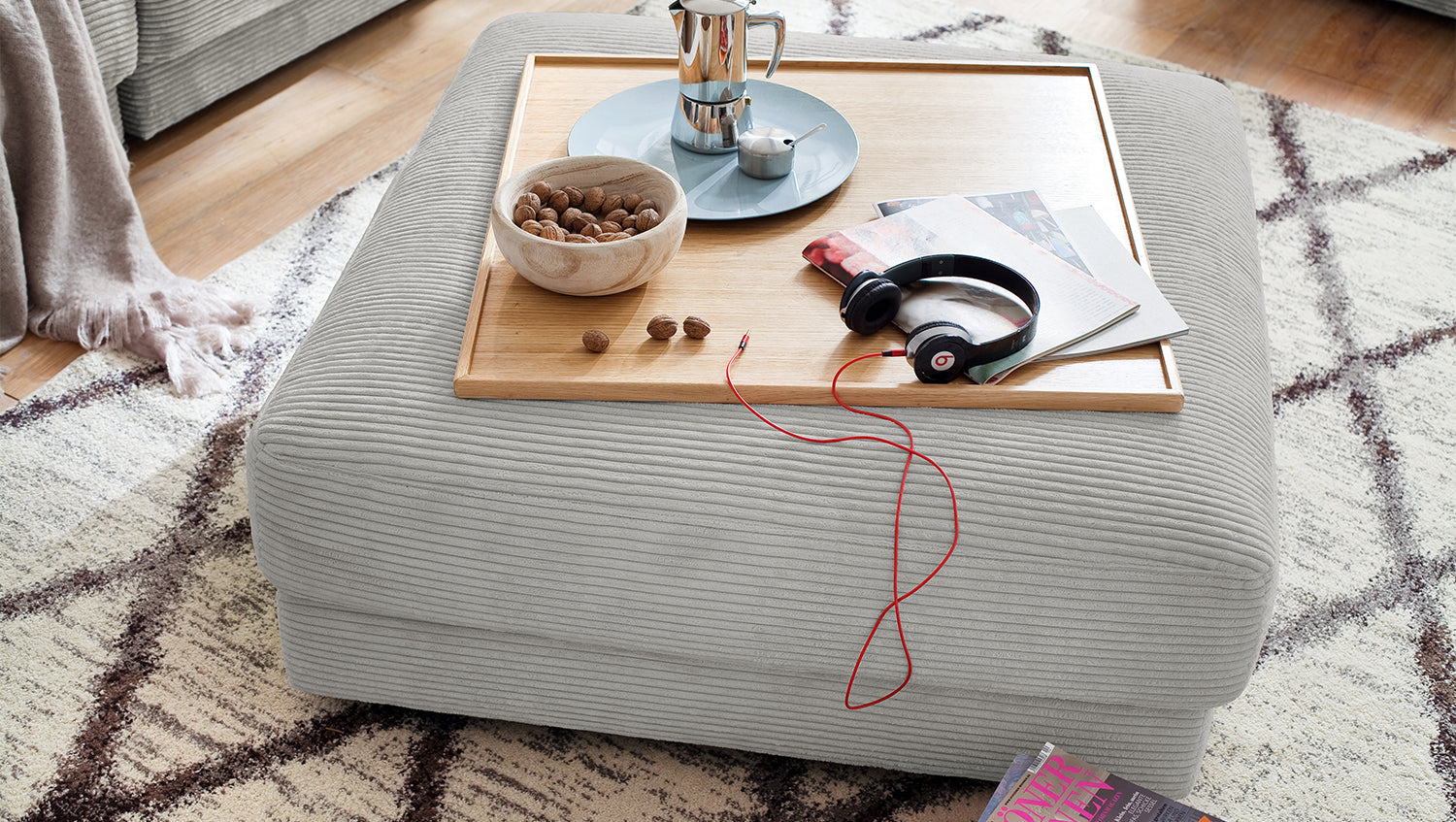 KAWOLA Gran taburete MADELINE taburete tapizado Pana gris claro