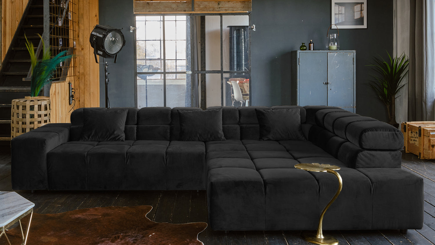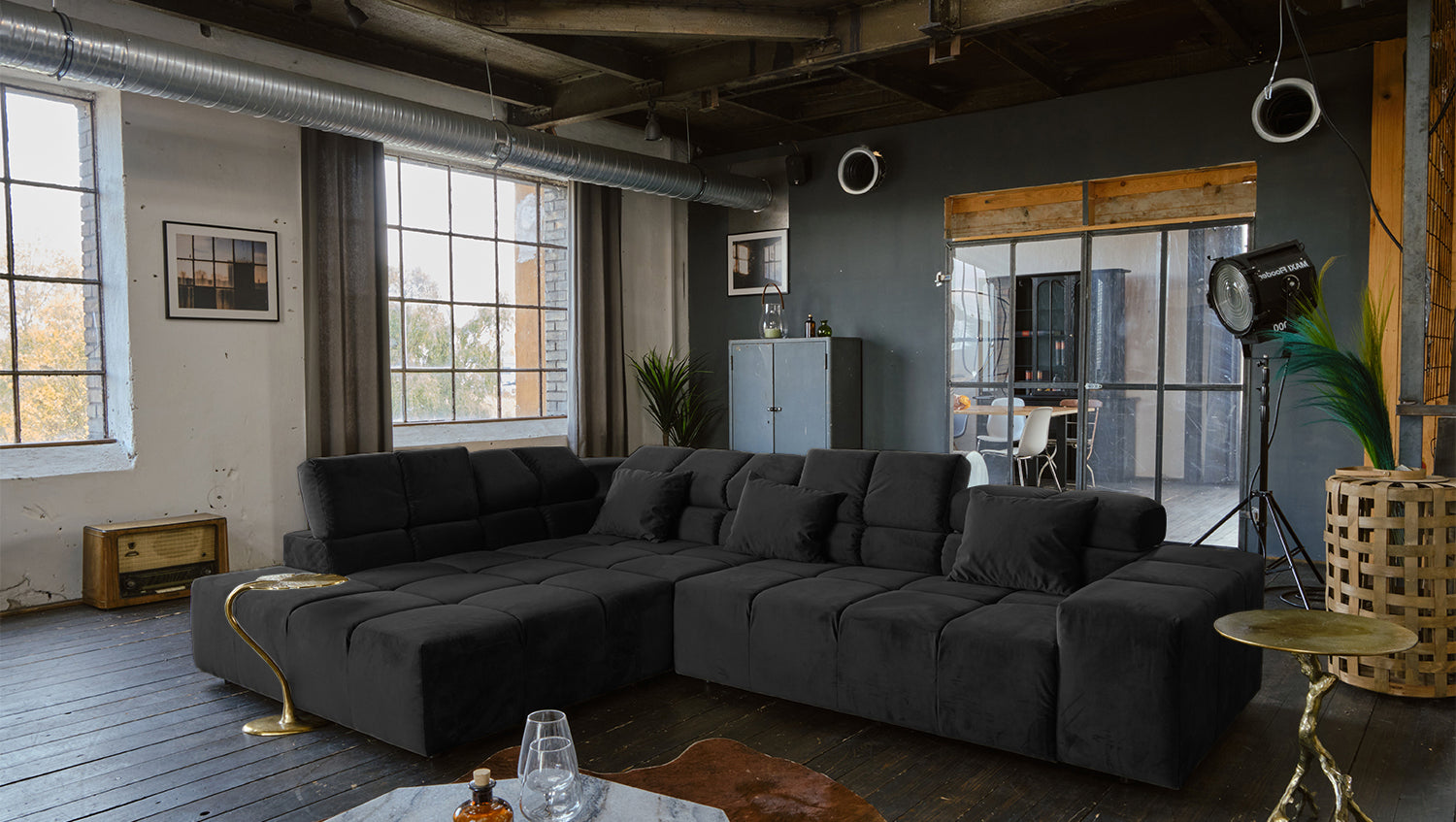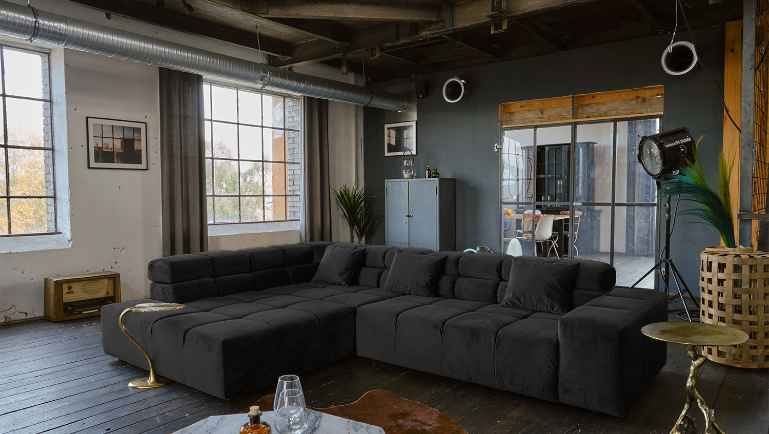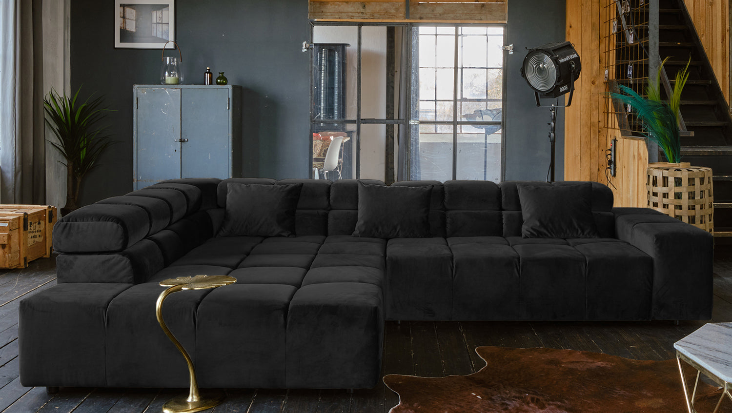 KAWOLA Sofá NEVADA Sofá esquinero Terciopelo negro