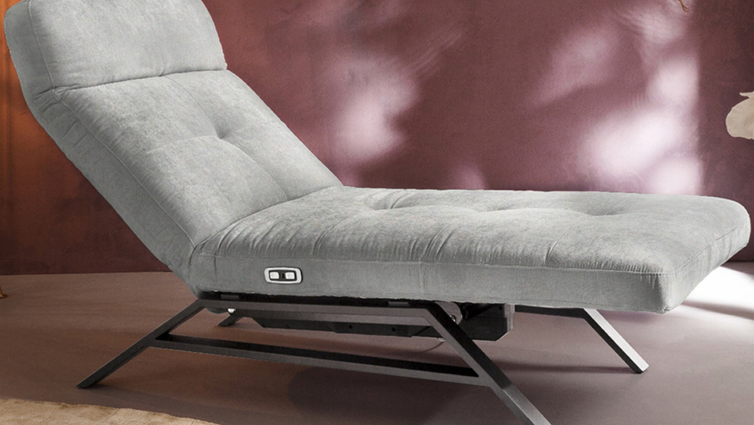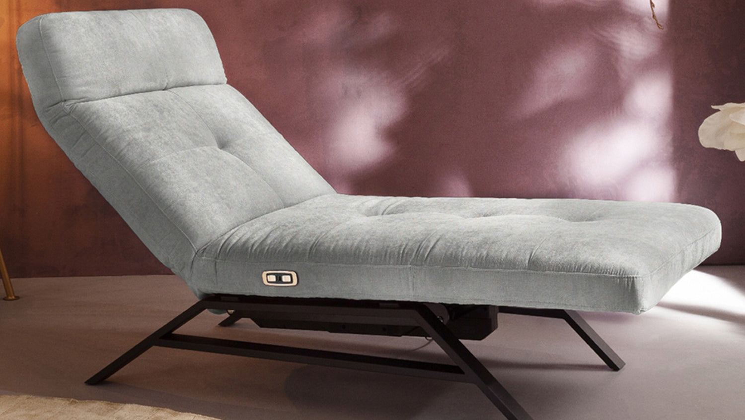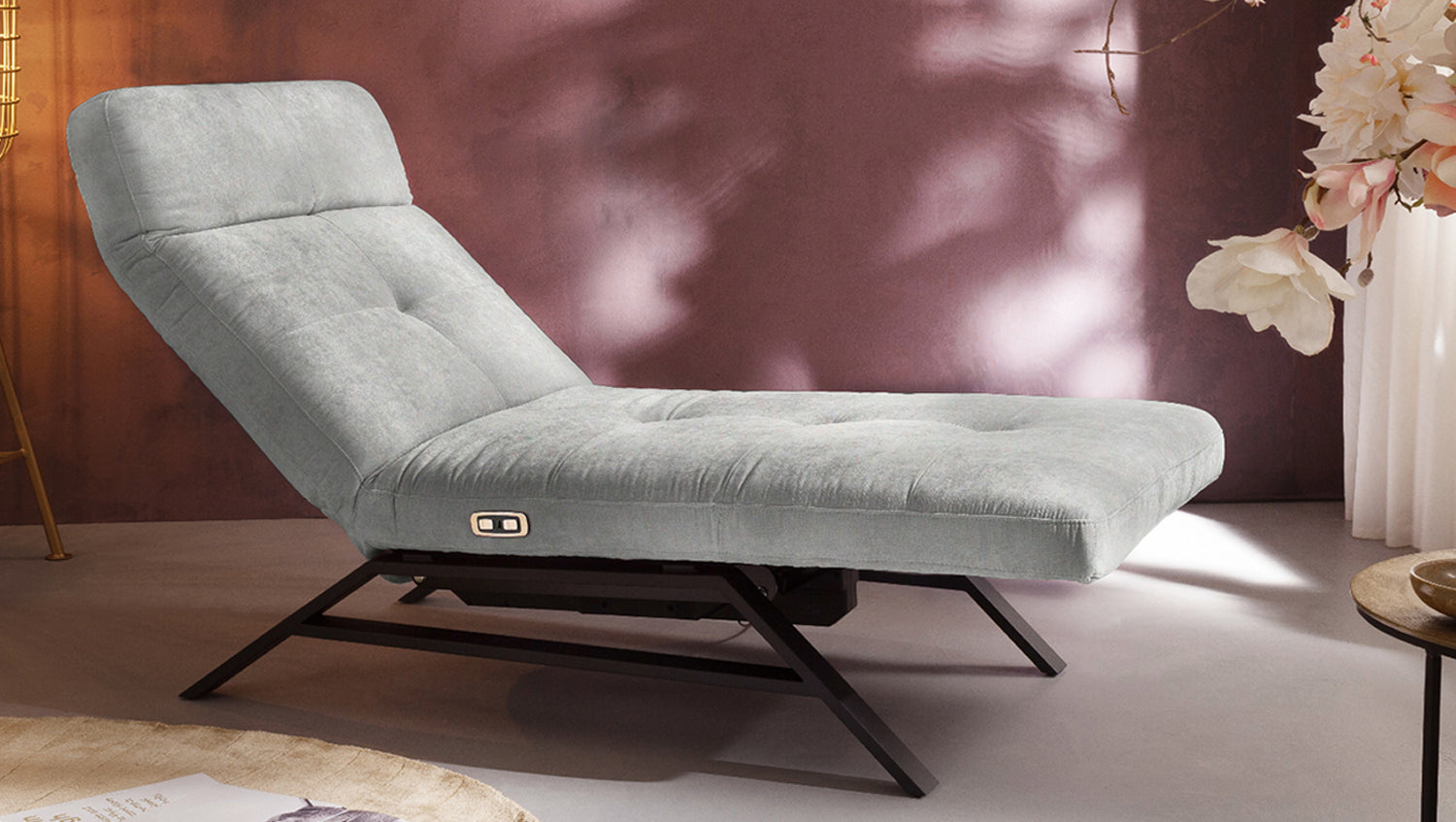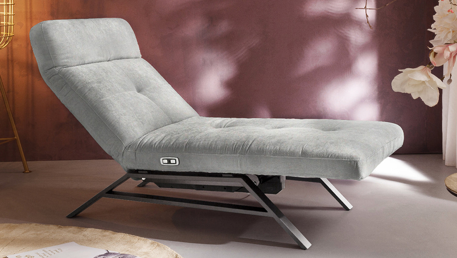 La Chaise longue AMERIVA de KAWOLA es una maravillosa combinación de diseño y funcionalidad. Las guías metálicas en negro mate contrastan con el moderno tejido de terciopelo. Sin embargo, la tumbona no es sólo un verdadero atractivo visual, sino que también cumple todos los deseos en cuanto a funcionalidad. La función motorizada, que puede accionarse con los botones del lado derecho, ofrece una posición de reclinación infinitamente ajustable. La Chaise longue también dispone de conexión USB. La versatilidad de este mueble es tan variada como sus funciones: El sillón AMERIVA no sólo destaca en el salón de casa, sino también en el vestíbulo o en la sala de descanso.