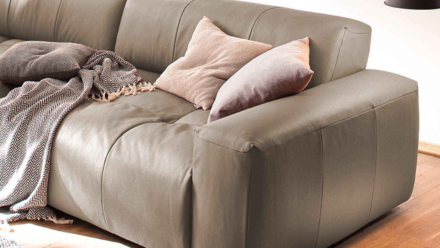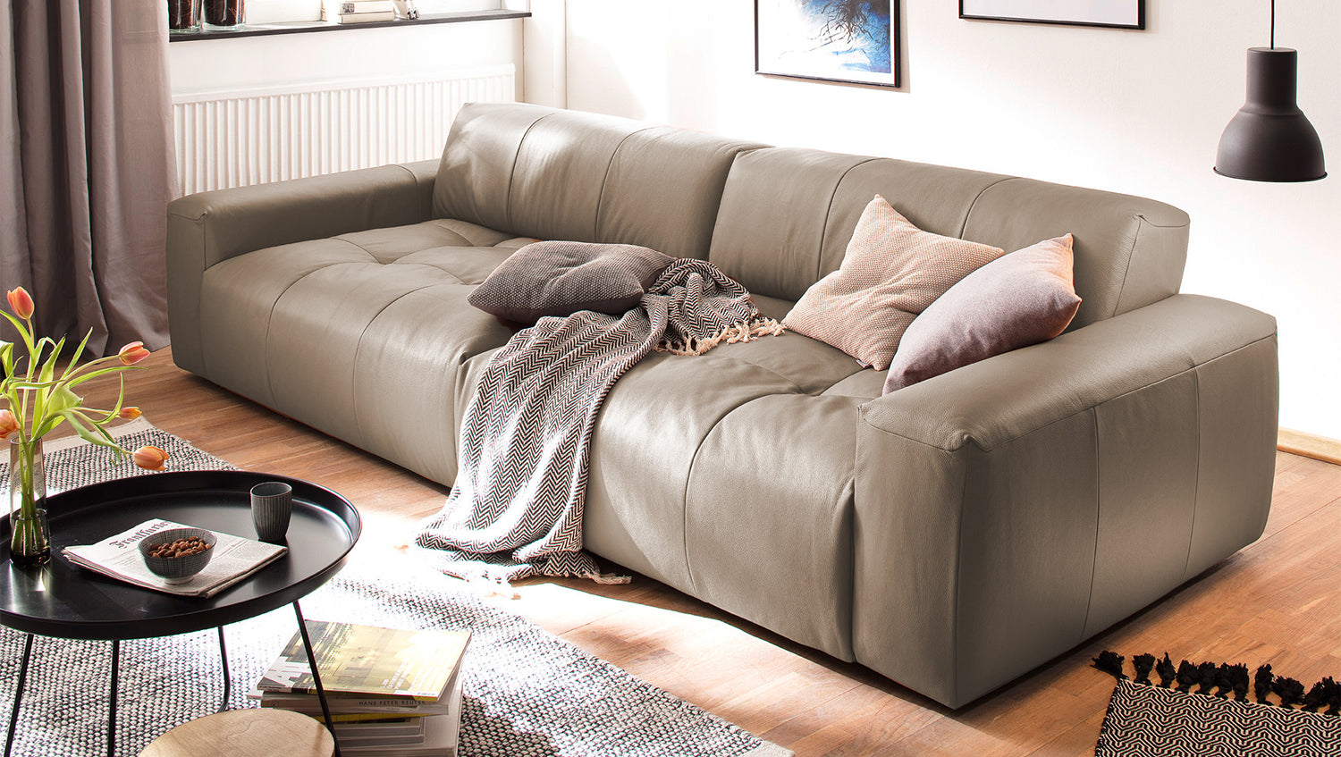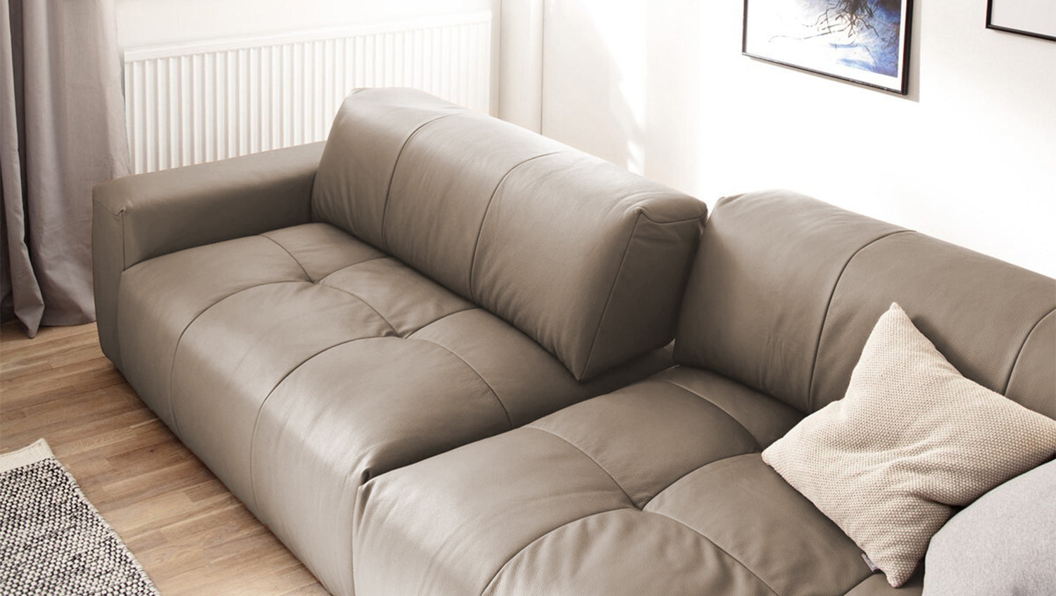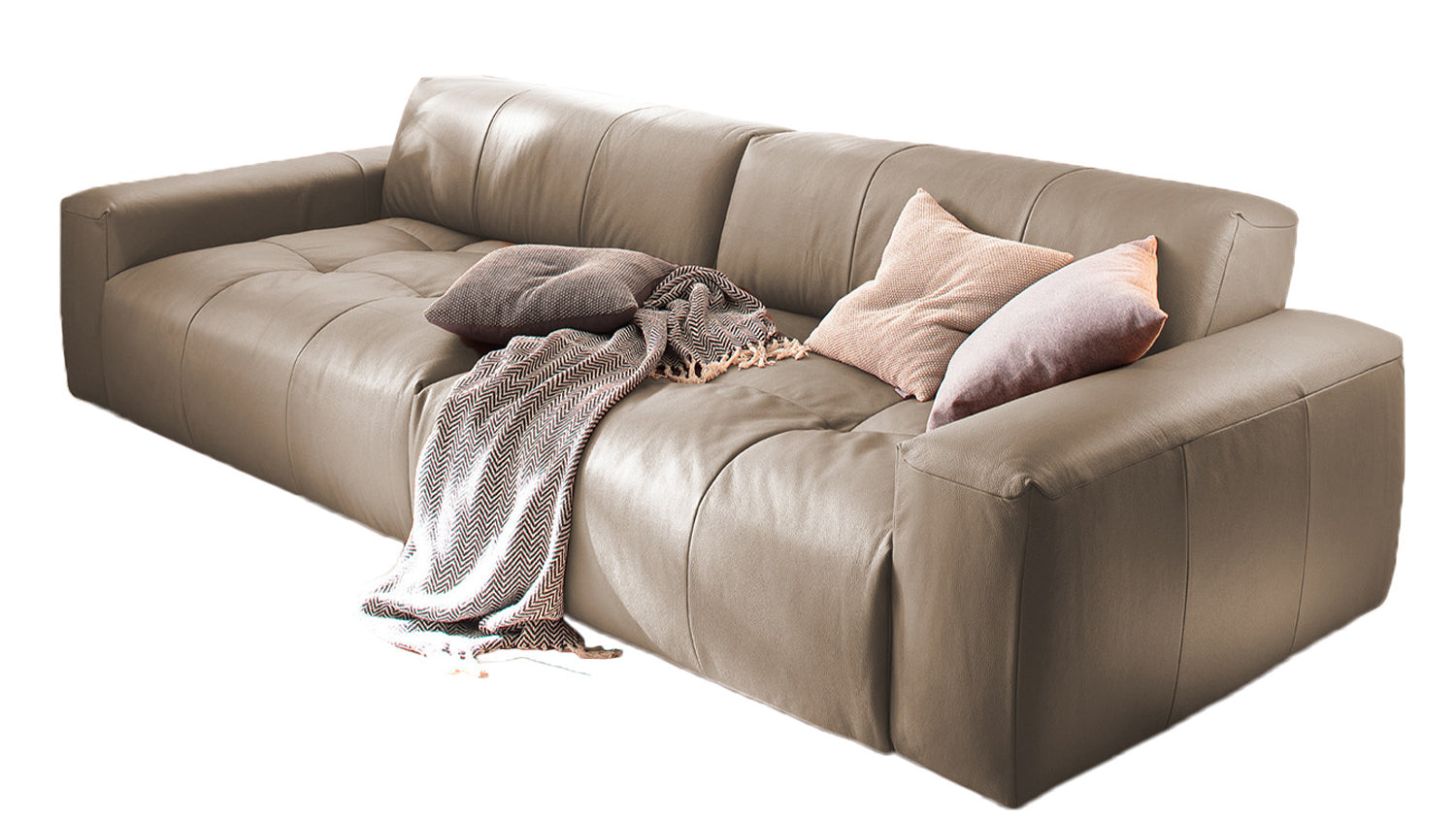 Sofá grande KAWOLA Palace de 3 plazas con ajuste de profundidad de asiento en piel color topo