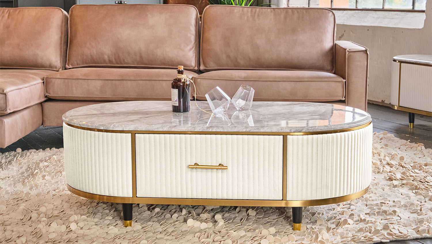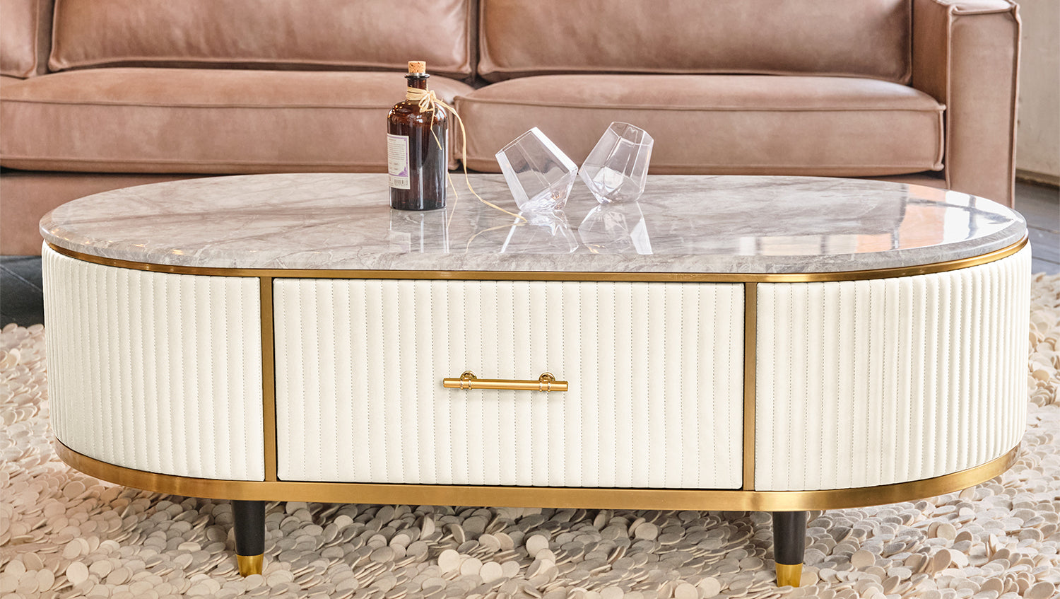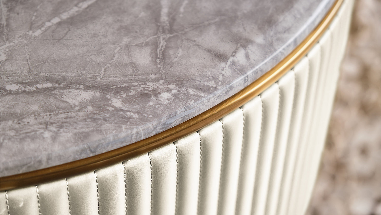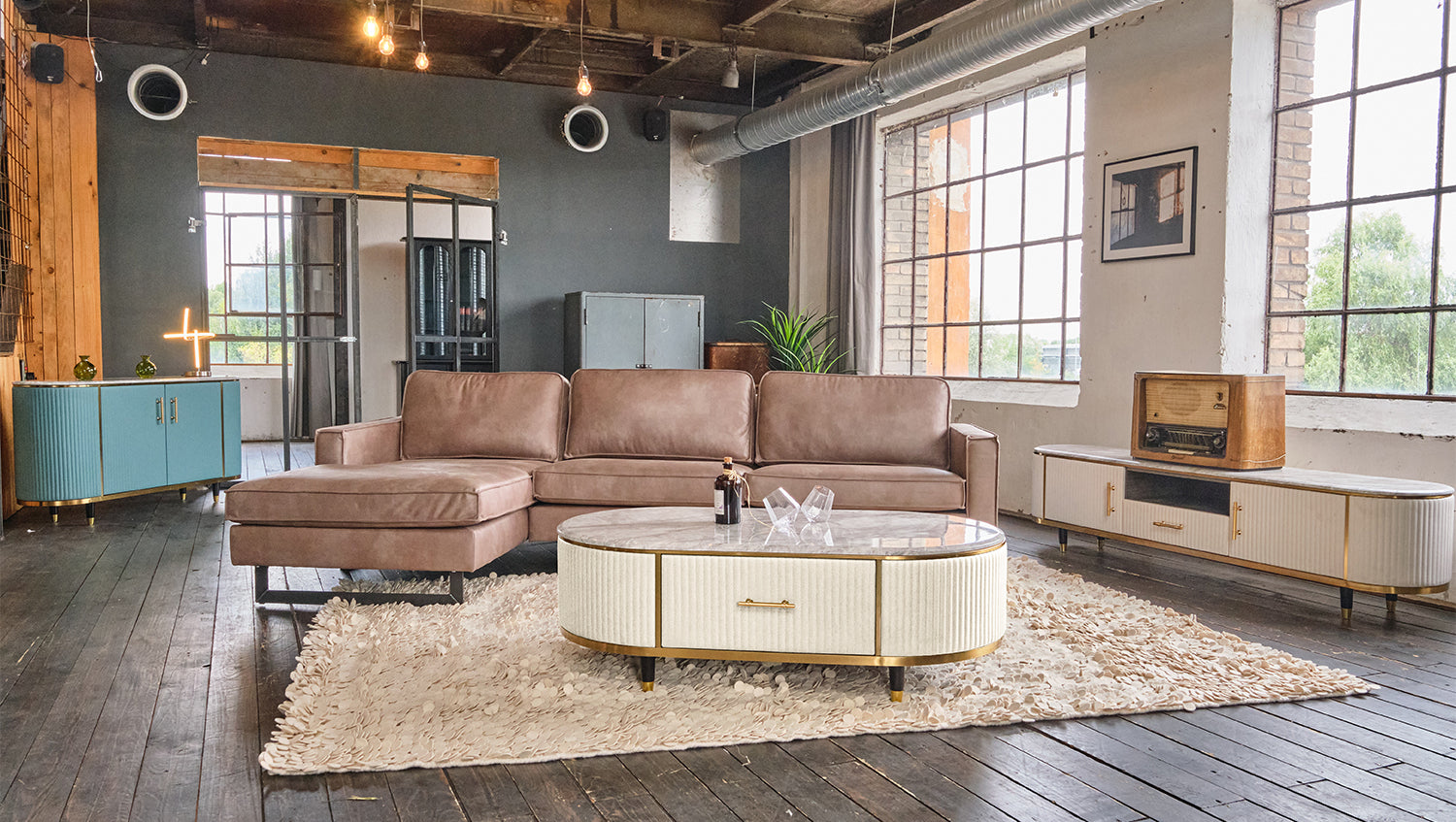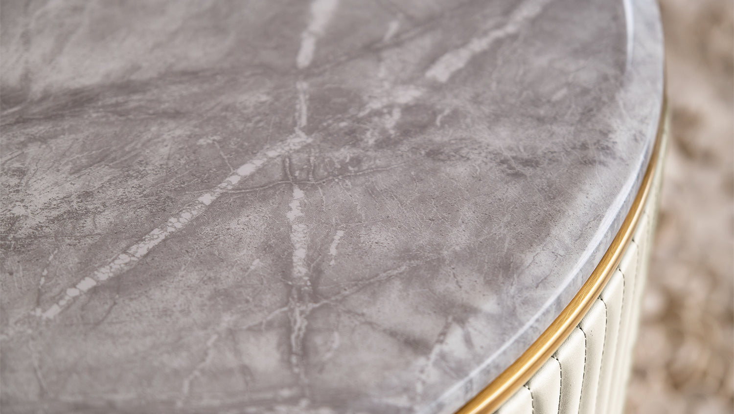 La mesa de centro KAWOLA MARIA llama la atención en cualquier hogar. Su nostálgico diseño retro al estilo de los años 50 se caracteriza sobre todo por la mezcla de materiales. El tablero de mármol gris claro y el elaborado frente de piel sintética crean un acertado contraste. Los pies dorados y los detalles de acero inoxidable completan el conjunto. Otros artículos de la gama MARIA añaden un mueble de buen gusto a su hogar.