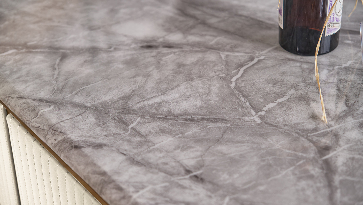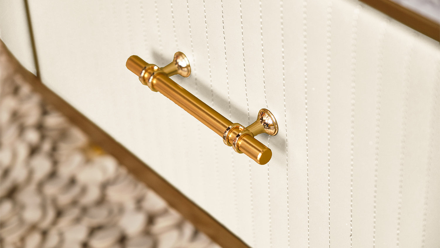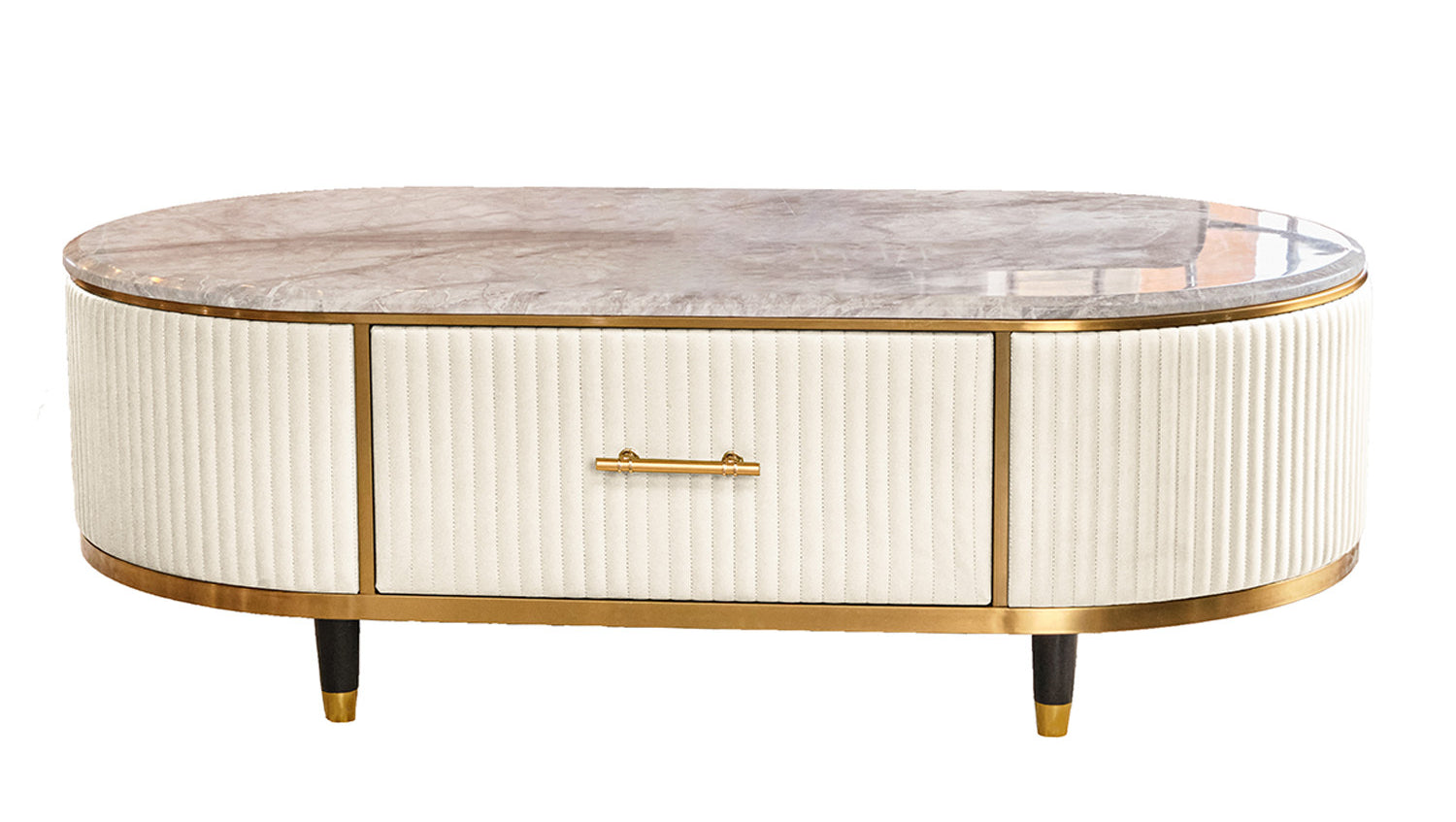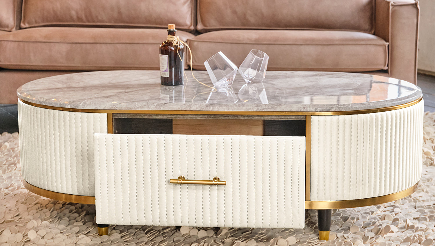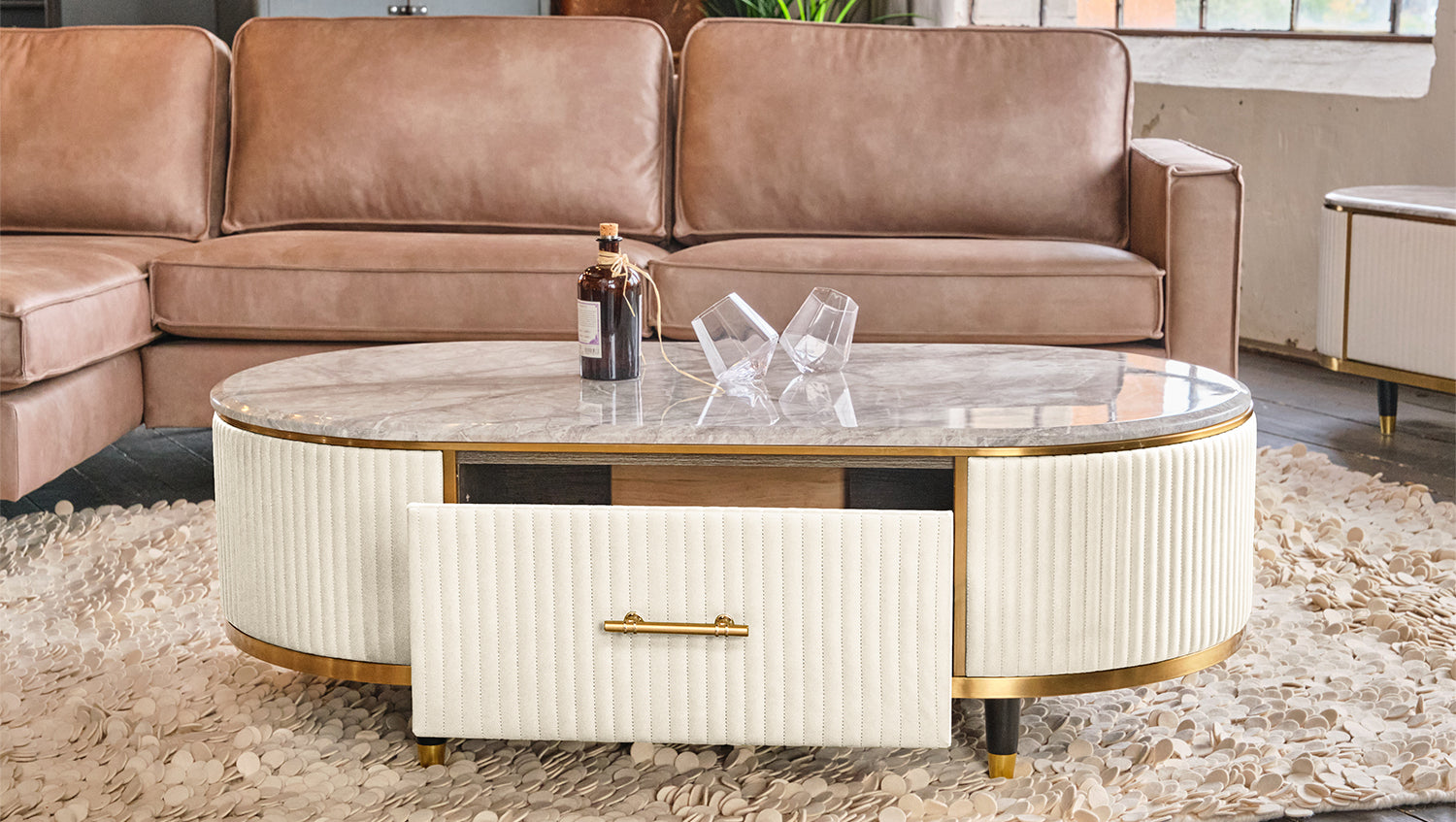La mesa de centro KAWOLA MARIA llama la atención en cualquier hogar. Su nostálgico diseño retro al estilo de los años 50 se caracteriza sobre todo por la mezcla de materiales. El tablero de mármol gris claro y el elaborado frente de piel sintética crean un acertado contraste. Los pies dorados y los detalles de acero inoxidable completan el conjunto. Otros artículos de la gama MARIA añaden un mueble de buen gusto a su hogar.