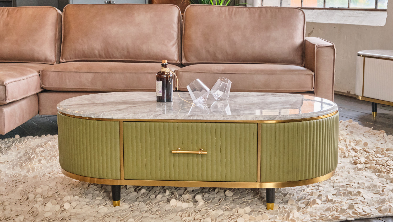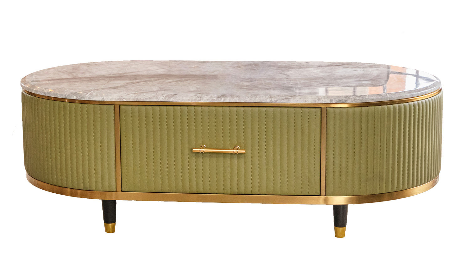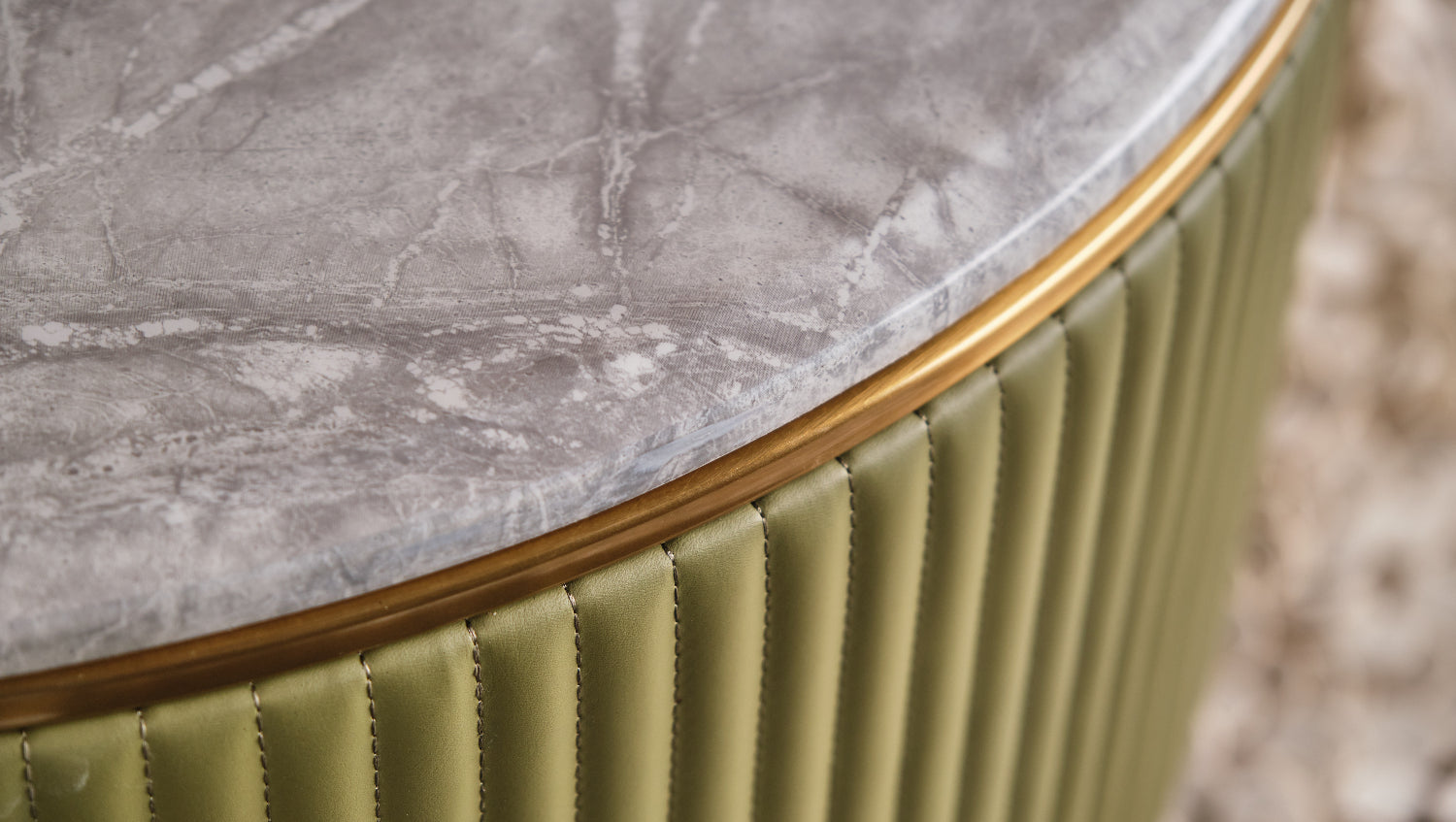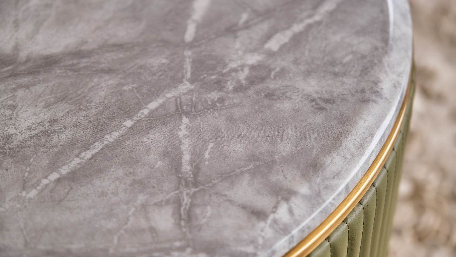 Mesita KAWOLA MARIA sobre de cuero artificial con tapa de mármol verde oliva