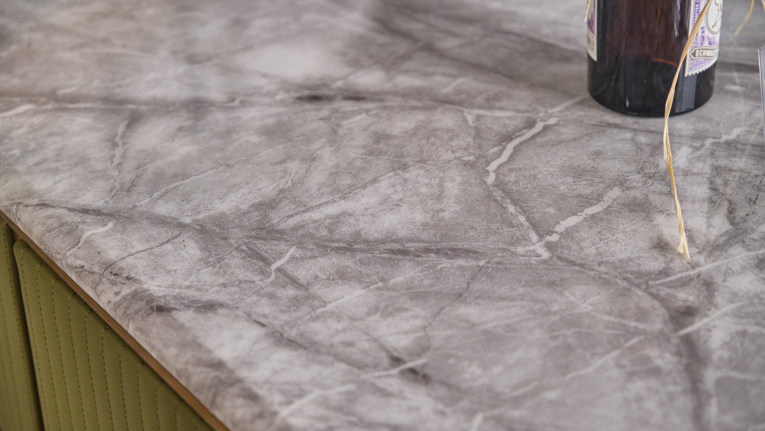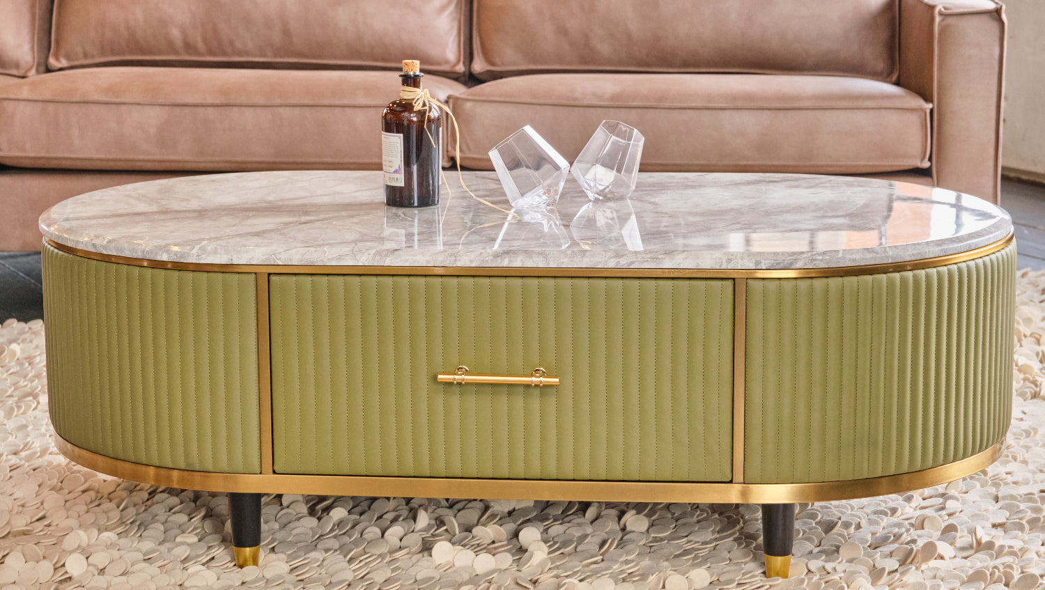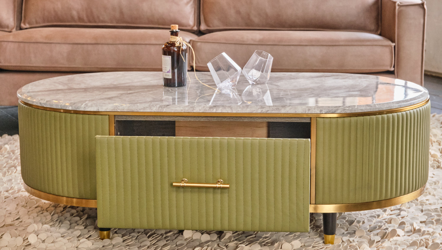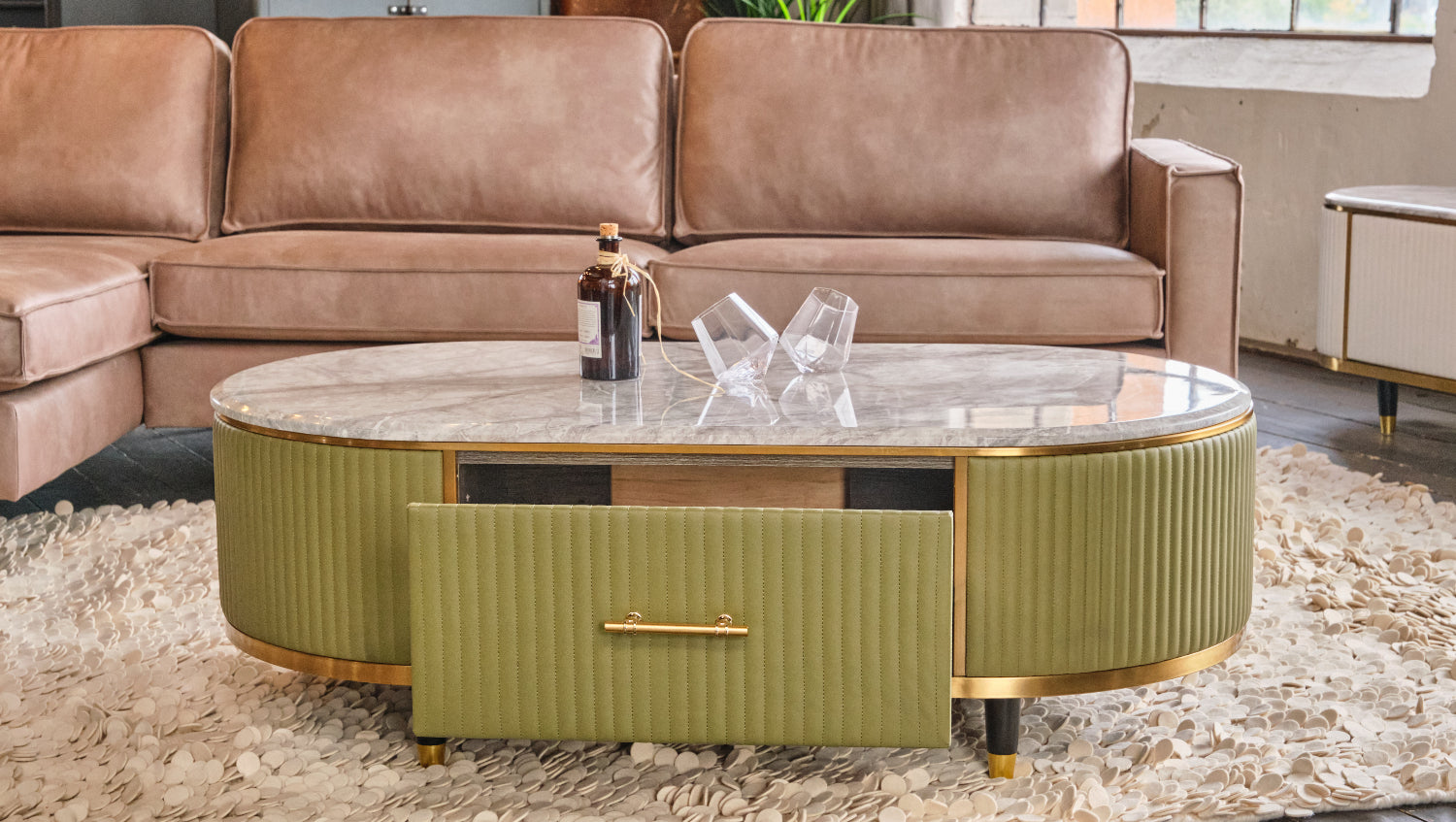 Mesita KAWOLA MARIA sobre de cuero artificial con tapa de mármol verde oliva