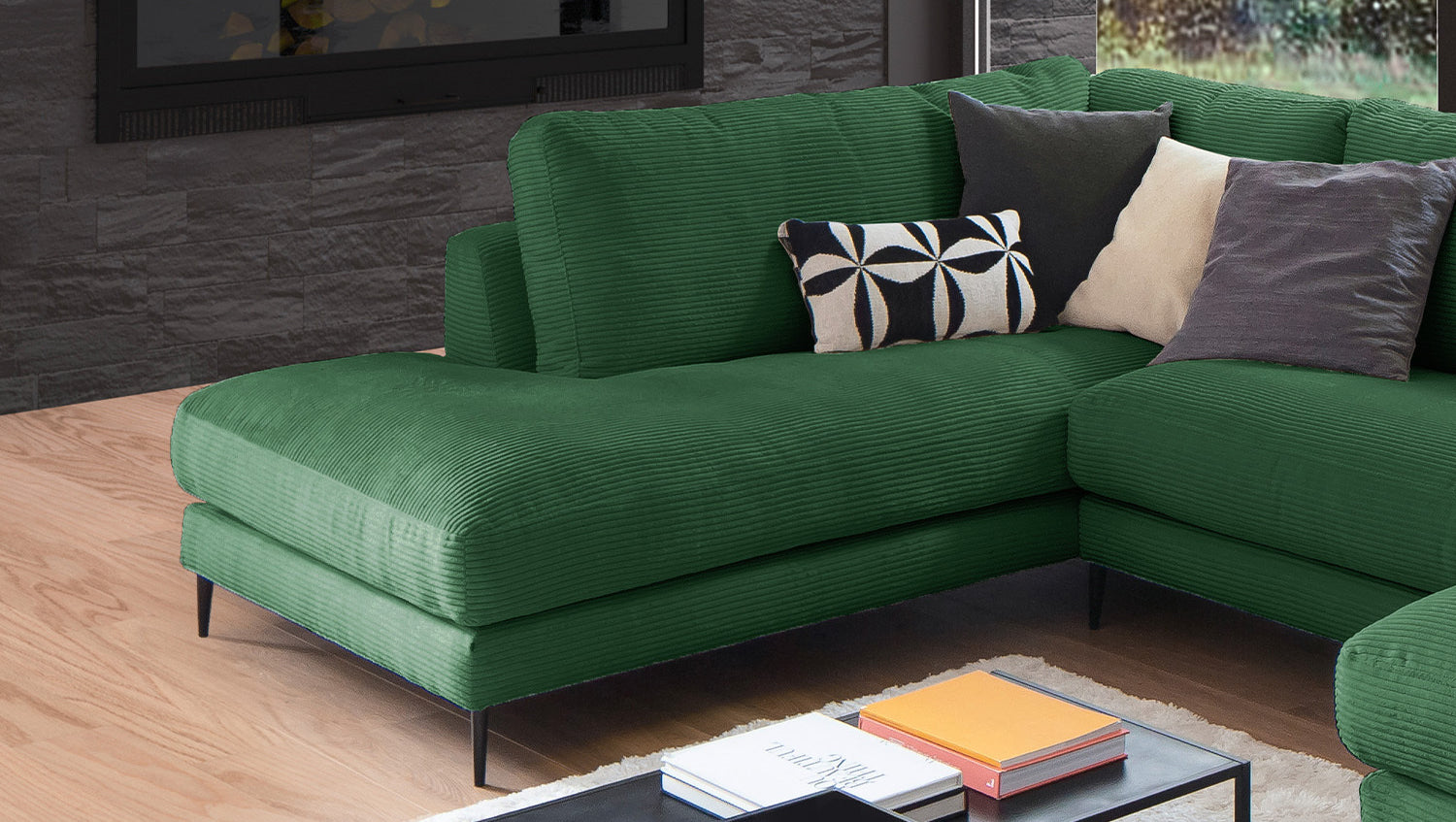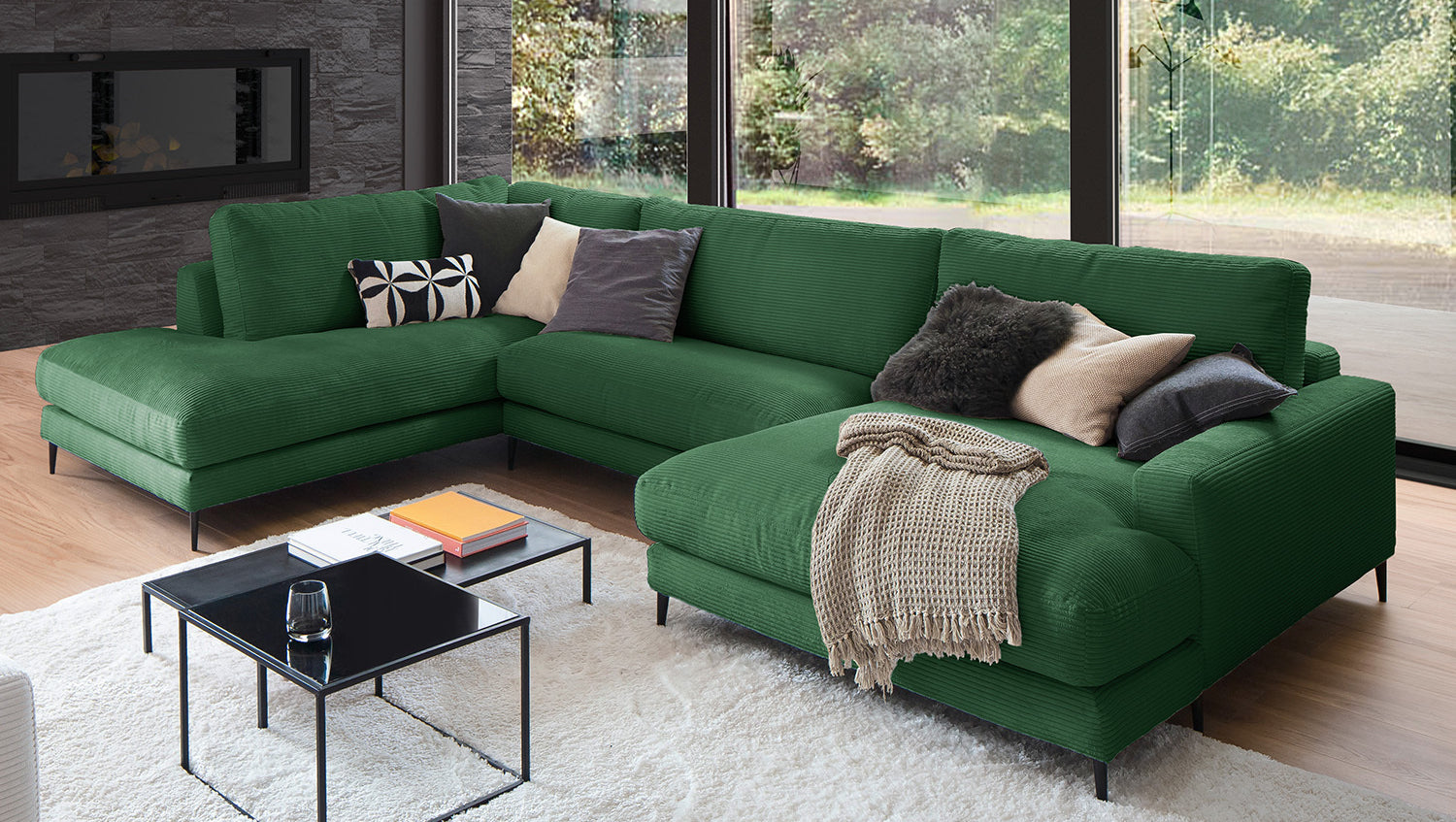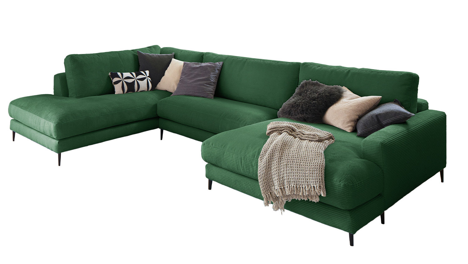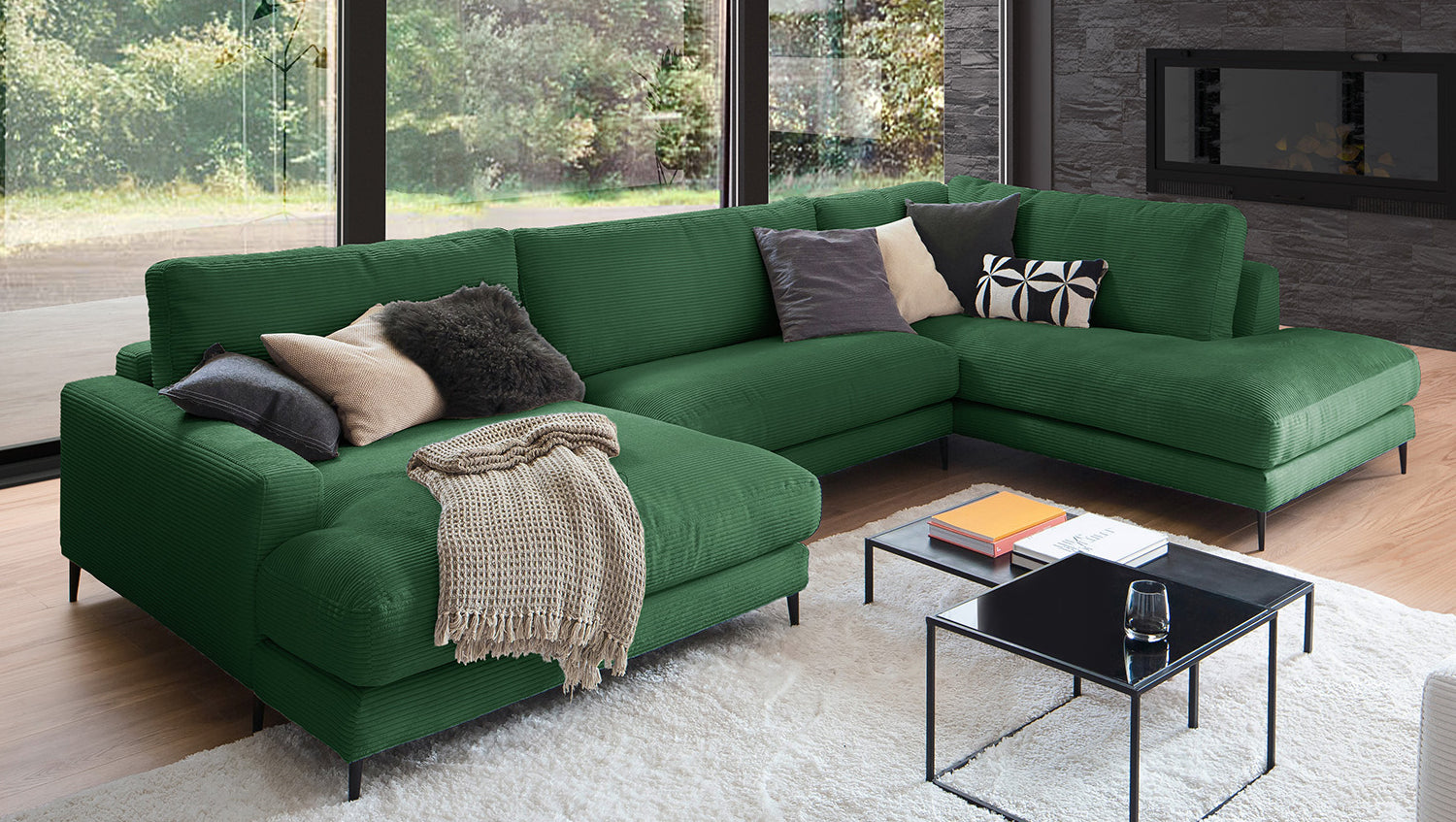 KAWOLA Sofá en forma de U CARA Pana esmeralda