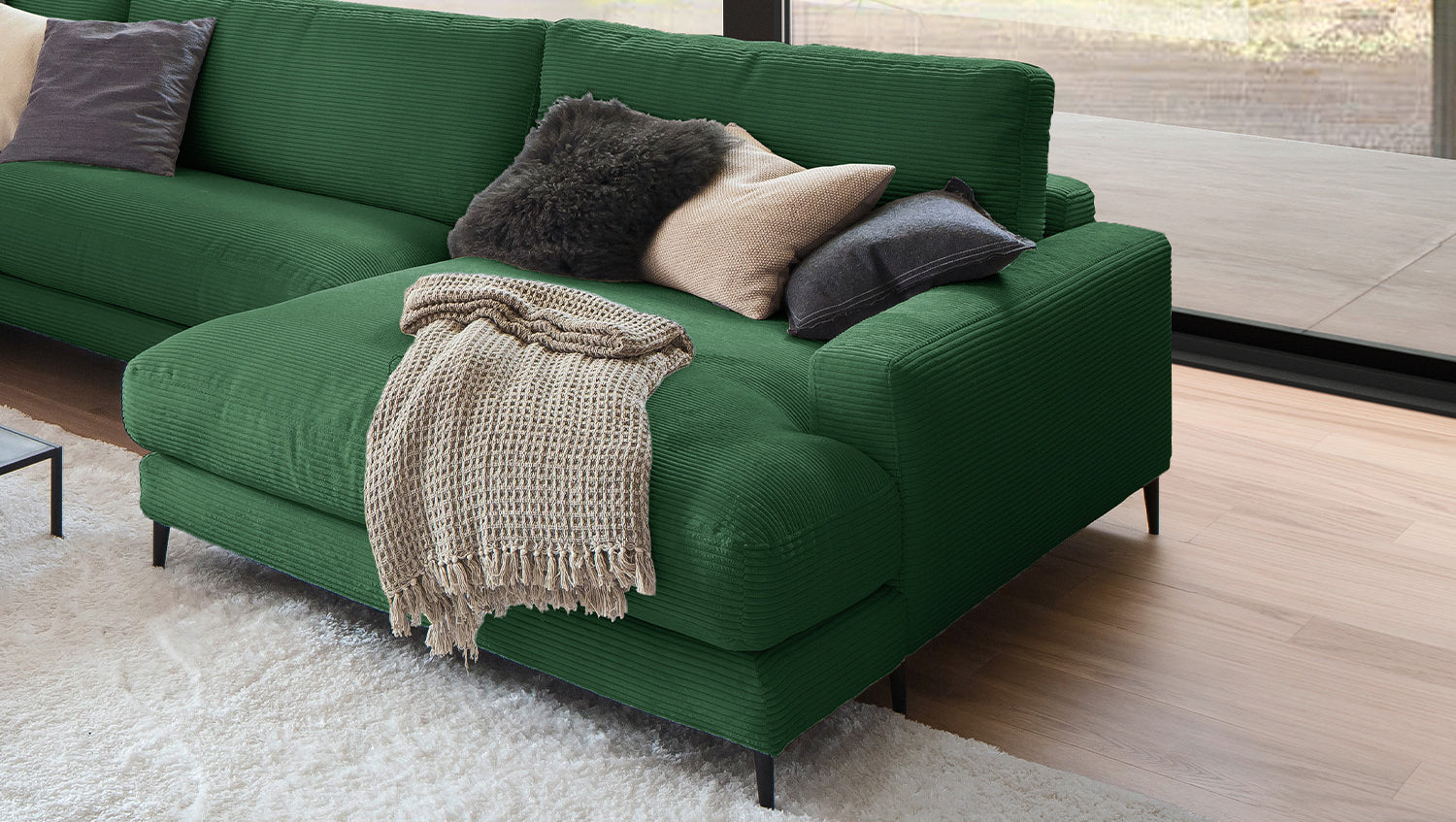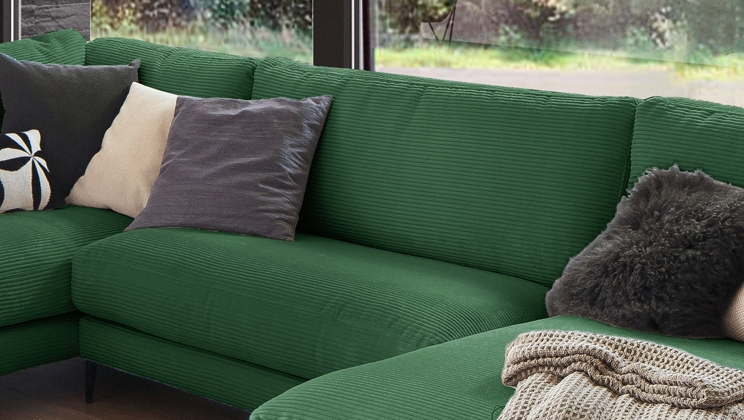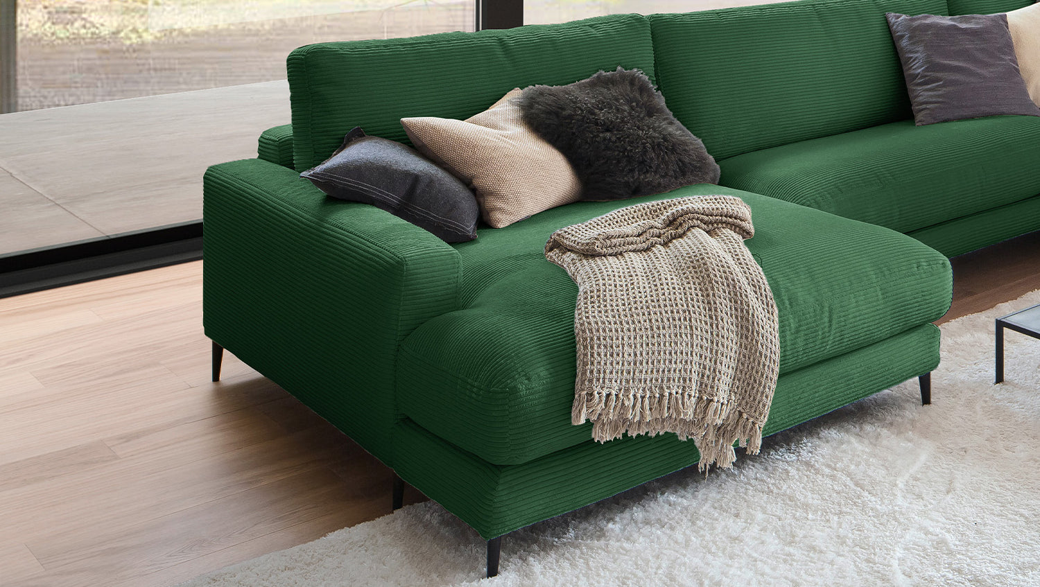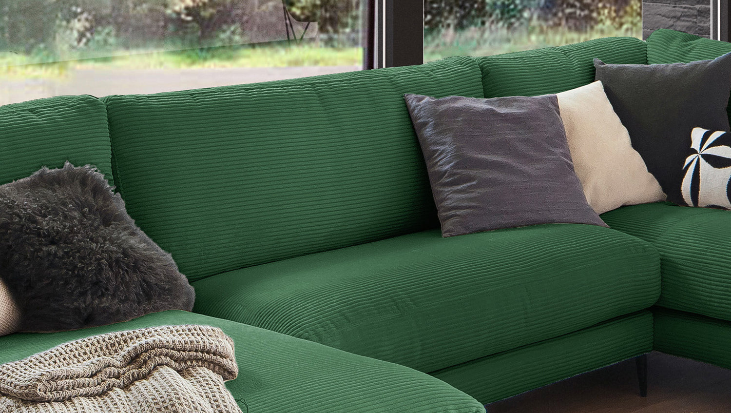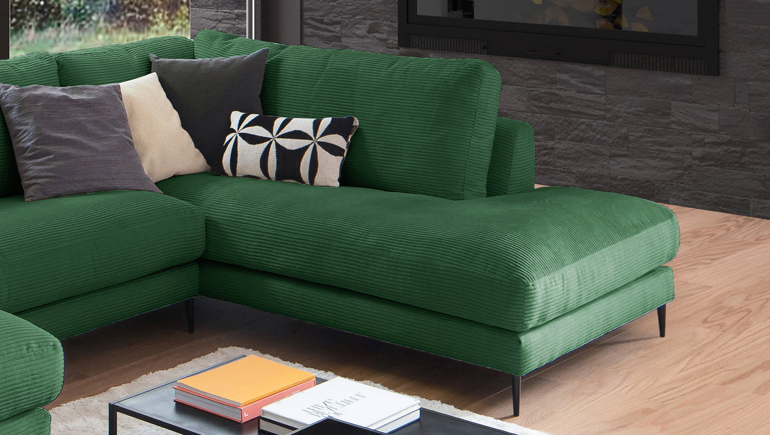 KAWOLA Sofá en forma de U CARA Pana esmeralda