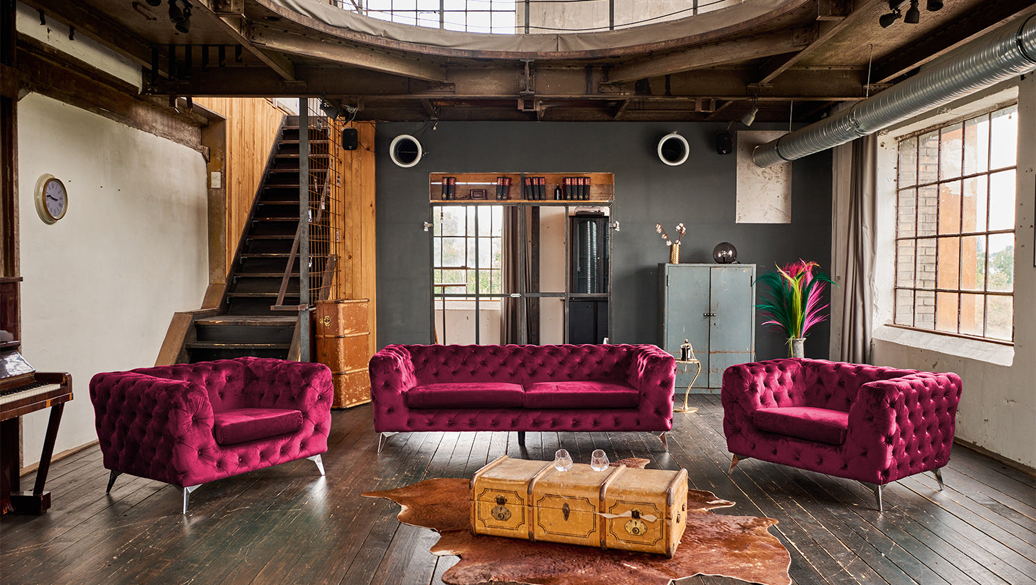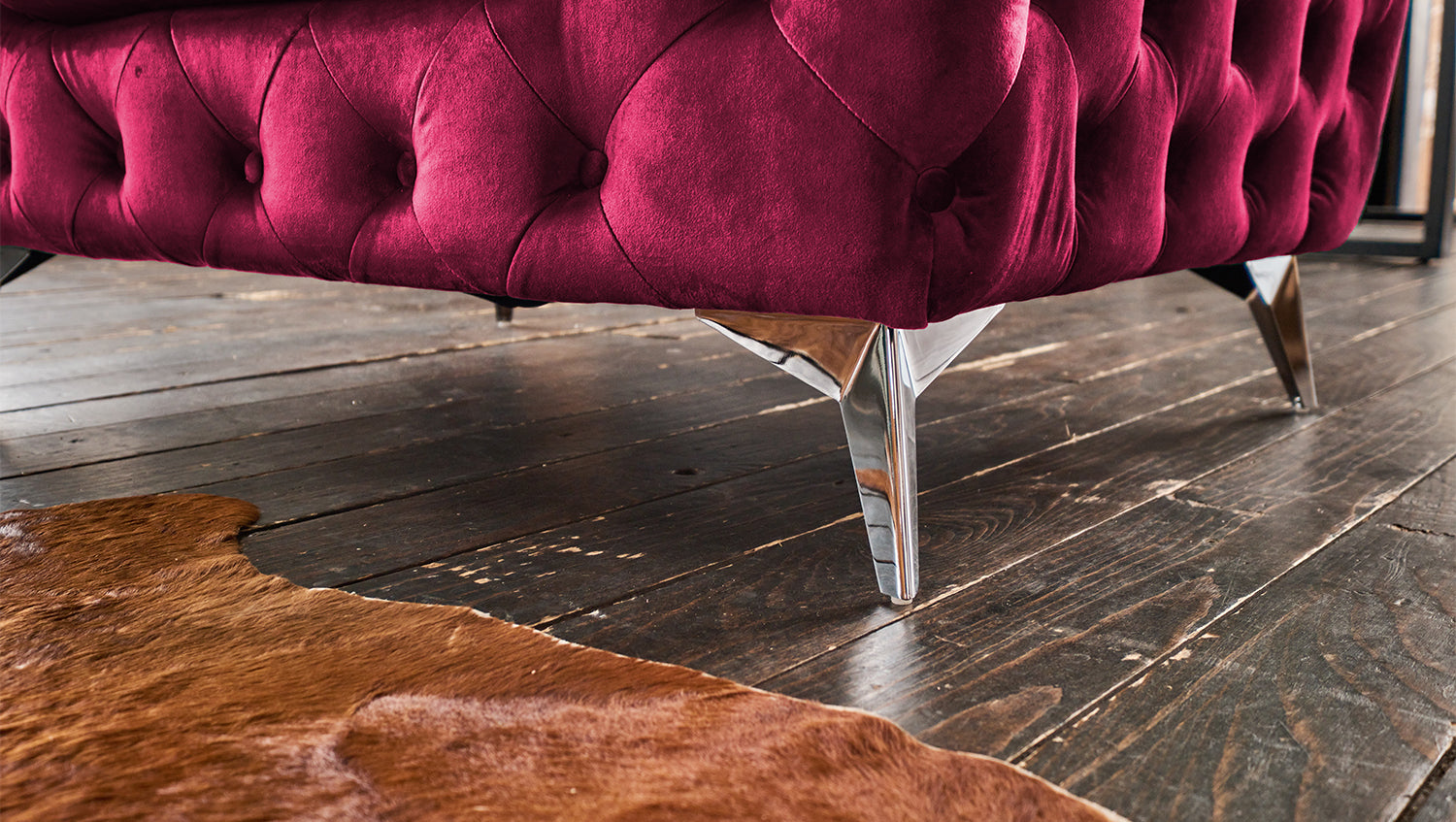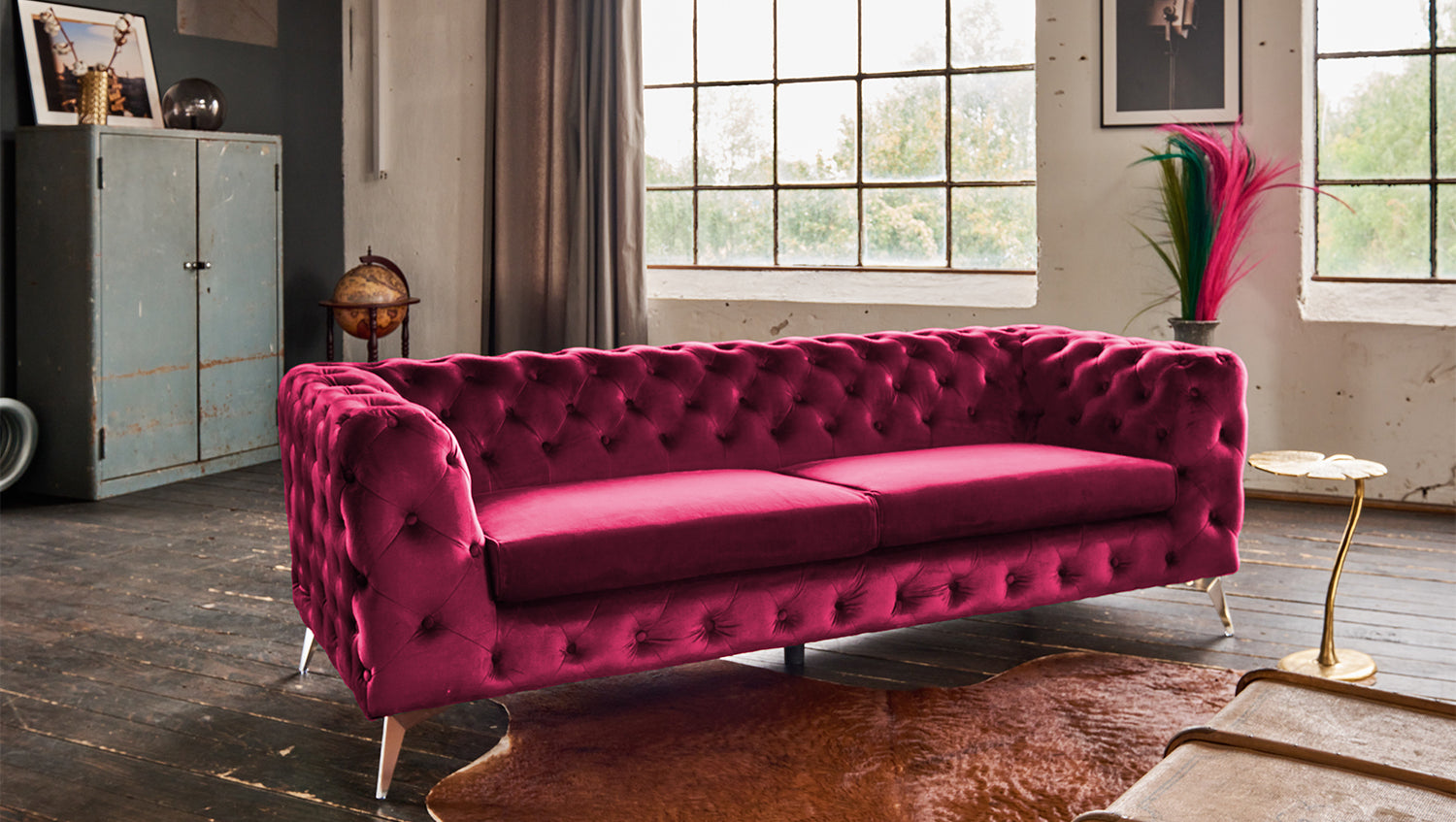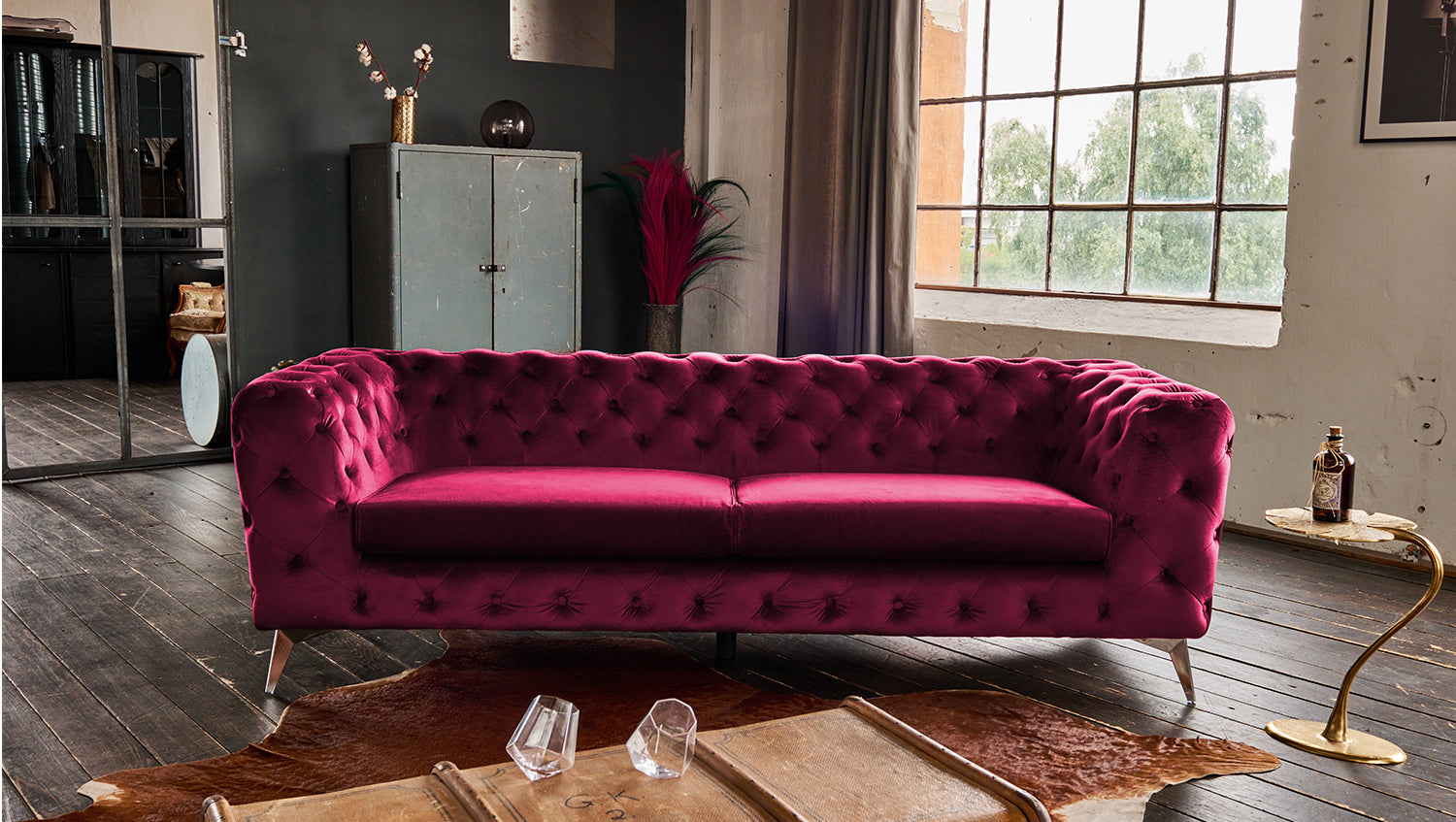 El sofá NARLA de KAWOLA atrae todas las miradas. El respaldo y los reposabrazos están acolchados a la moda y todo el sofá está tapizado en un bonito tejido aterciopelado. La forma del sofá y el acolchado le dan al sofá de tela un aspecto de estilo Chesterfield. Los pies de metal destacan visualmente del sofá y le dan un aspecto moderno al aspecto Chesterfield.
