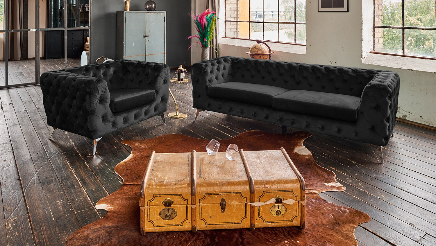 Sofá KAWOLA NARLA Chesterfield de 3 plazas de terciopelo negro